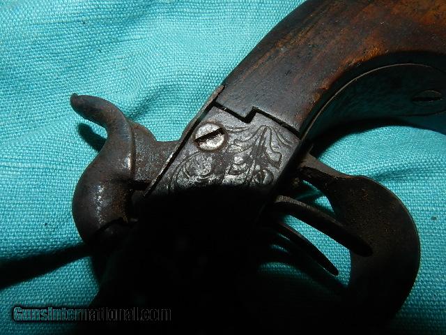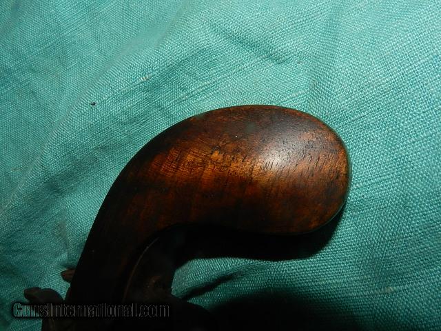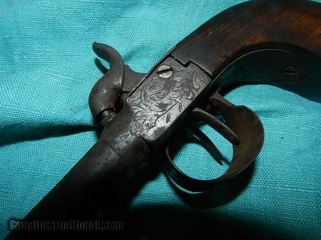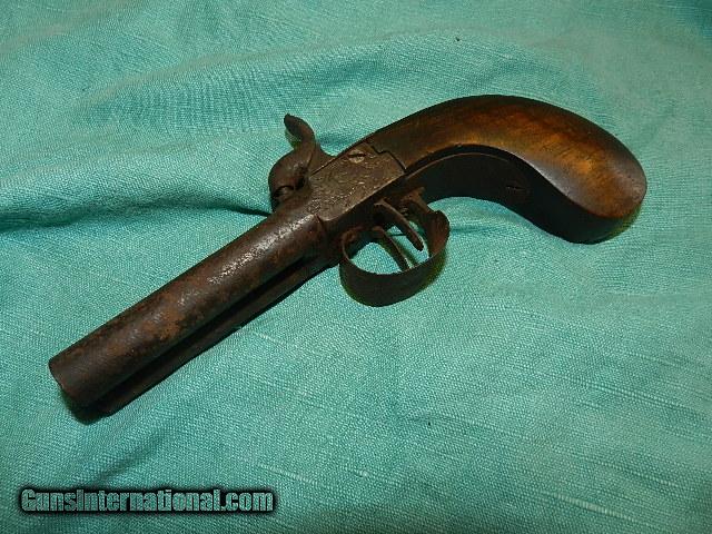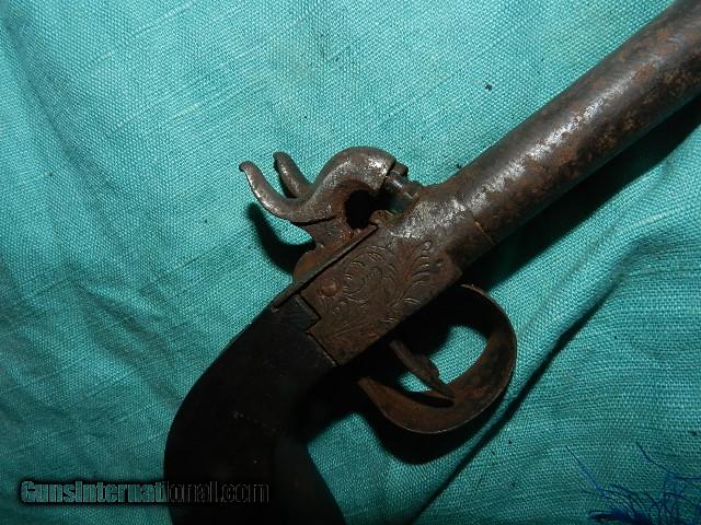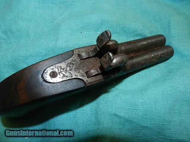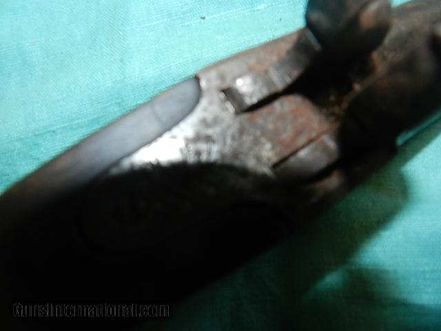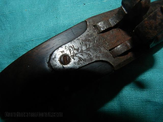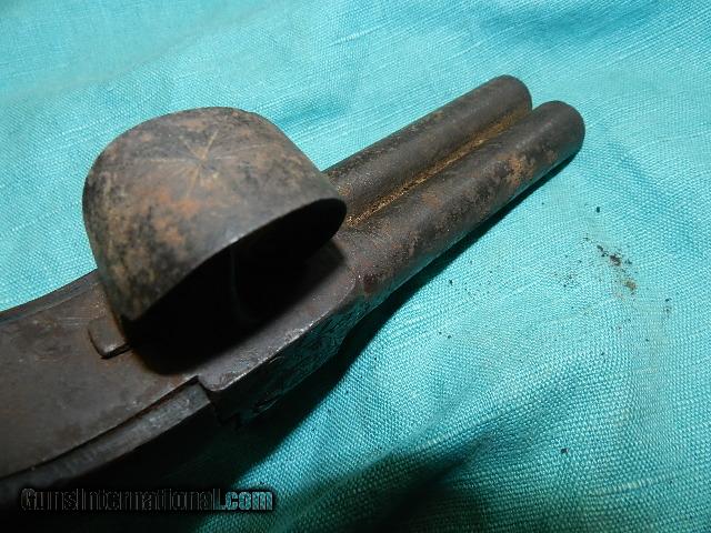 Description: DOUBLE BARREL .40/.41 cal boot pistol with 3 " rifled round barrels, and a French walnut bag stock that has the finish fading. Both trigger/hammers work good, and the medal is soft grey, with some raised corrosion from long term storage. Condition is good overall, with some rust between the barrels. Made in Belgium in the 1840 to 1860's many were used in the Civil War by both sides. Gun was found wrapped in a rag and stuffed into the eaves of an early home's attic. The frame flats have a chisel engraved floral design . Gun should clean up better, than photos.The early four groove rifled barrels has corroded bores. No name or numbers found. To buy a gun from me you must get a direct email for me, with details, and shipping cost. We don’t have asite .I prefer money orders or a check. Item ships when funds come in. If you can only pay with a card let me know. I’m sorry I don’t list my phone number, did that for 30 days, never again.. I can’t talk on the phone all day…who will ship the guns? I’m just one person, and it’s very busy here! I do a brisk volume! I hope you like my wide selection of unusual guns, knives and gun parts. Shipping price determined by zip code. I try to keep the prices affordable, which means I make less money than most dealers. You won’t get altitude sickness with my prices! I consistently have the best selection of older guns If you attempt to buy, you must still contact us for details, buying doesn't end the sale, it just sends an email telling us you want to buy this gun. A phone call won’t secure a sale! Not home many times, the first buyer by email buys the gun !Thissite does not close down a sale when you do a BUY! I can get six buys in an hour, first buyer to email gets the guns, others are in second place! Best to send another email . Sometimes not home to get calls. Some guns are required shipment to a gun dealer near you for a transfer to you when it arrives. With the widest selection of older guns at great prices, We don’t have a store, and sell on the internet only. SOLD Antique: Yes |
