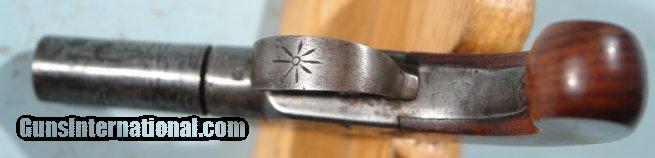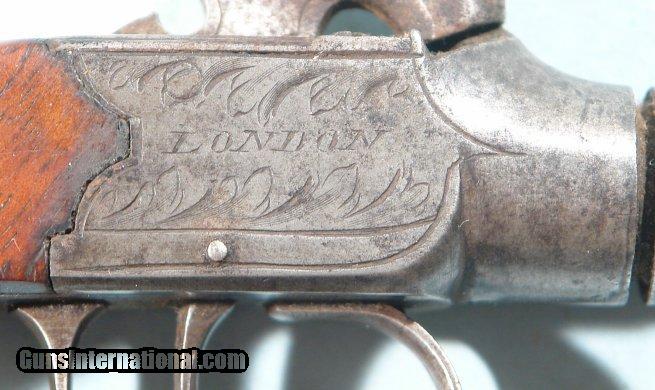 Description: DURS EGG PERCUSSION TURN-BARREL POCKET OR BOOT PISTOL, CIRCA MID 1800'S. Engraved "London" on right and "D. Egg" opposite along with light floral sprays. Nice old dark patina. Original triggerguard with same type engraving. Original wood bag shaped grip. Original screws. Barrel frozen in mid turn and should unfreeze with proper attention. British proofs forward of triggerguard. Working order. Durs Egg was one of the best makers in England and probably contracted with a lesser gun maker possibly in Birmingham to supply off the shelf guns to supplement his custom order business for high grade sporting/military firearms. SOLD Antique: Yes |