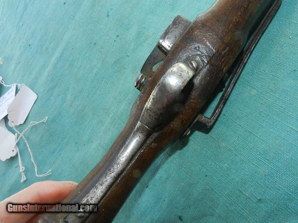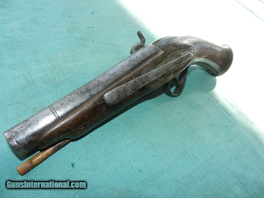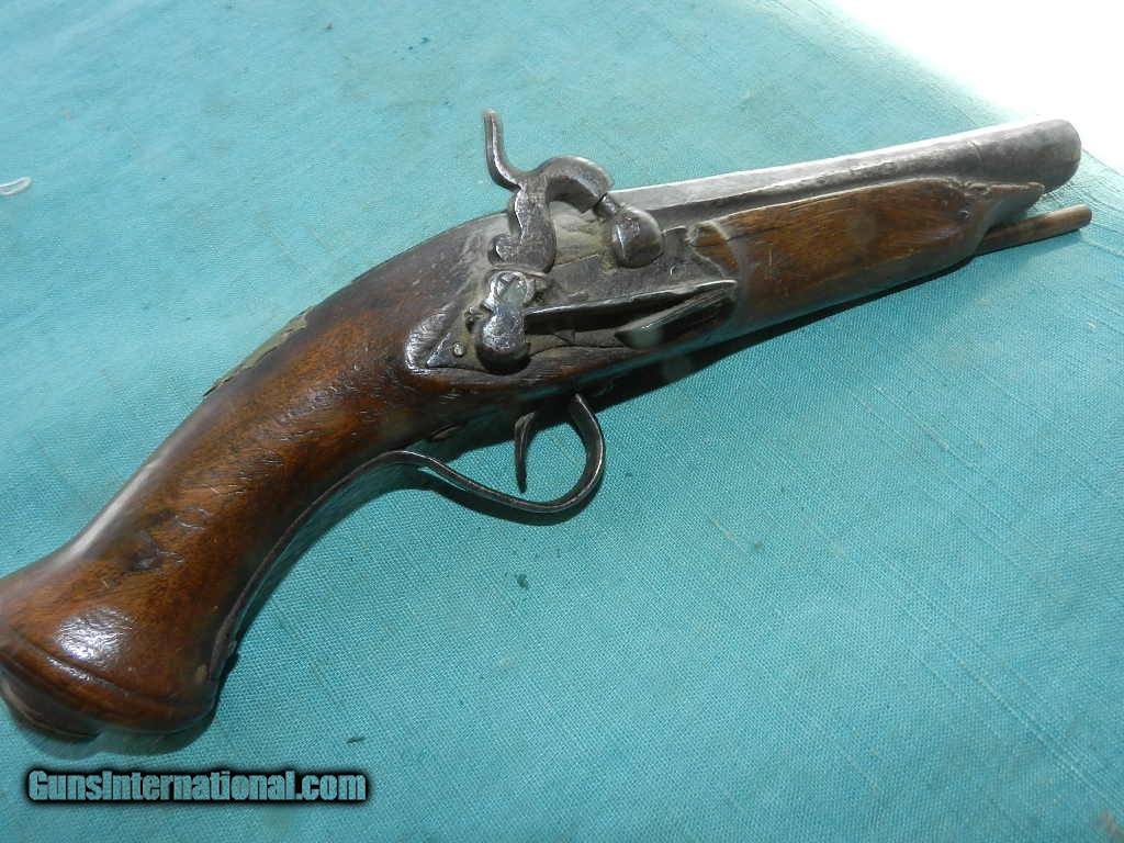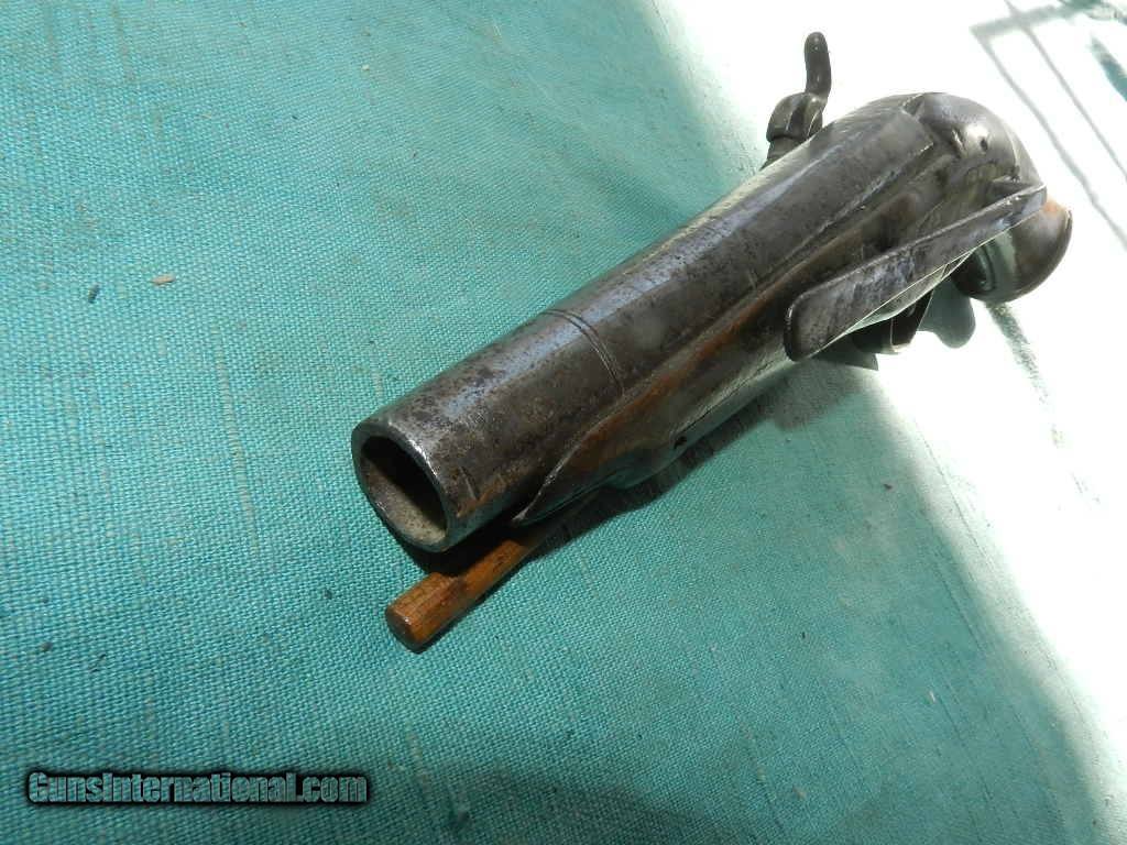 Description: <<<<SOLD>>>An early, possibly Spanish made Belt pistol snapaunce percussion pistol with a belt hook.Was this at the Alamo?? Measures about 11 1/2" overall with a 5 3/4" tapered round barrel. Action works well, and the European walnut wood sows some wear, but is solid, with typical walnut wood issues like an age grain split underneath the ramrod port, and a small pce. missing up near the barrel at the muzzle end. But nothing very serious. Comes with a oak wood ram-rod. The brass oval side plate has fine chisel scroll engraving. Possibly made about 1800 to about 1860. Many were shipped to New Spain or Mexico. An interesting southwest belt pistol. Check my inventory of rare grips, unusual gun parts, barrels and holsters. Shipping may be higher than stated as shippers raise their prices twice year without notice! When buying a gun always have it examined by a competent gunsmith before shooting. To buy a gun from me you must get a direct email for me, with details, and shipping cost. We don’t have a web site .I prefer money orders or a check. Item ships when funds come in. If you can only pay with a card let me know. I try to keep guns affordable, which means I make less money than most dealers. You won’t get altitude sickness, or nose bleed, with my prices! I consistently have the best selection of older guns If you attempt to buy, you must still contact us for details . Best to email to buy. Sometimes a local person can stop buy and purchase before the gun is removed. Sometimes not home to get calls. Some guns are required shipment to a gun dealer near you for a transfer to you when it arrives. Otherwise many older or black powder guns ship to your door. With the widest selection of older guns at great prices, We don’t have a store, and sell on the internet only. I’m easy to get along with. Thank You. SOLD Antique: Yes |