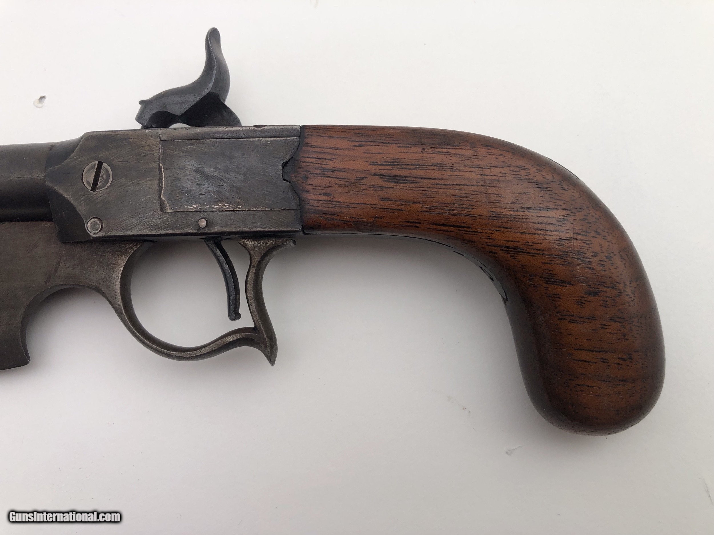 Description: An Elgin cutlass knife / single shot percussion pistol, made by Morrill, Mosman and Blair, circa 1837. It is stamped with the serial number 10, on the bottom of the frame, just in front of the trigger, within the triggerguard. The original grips are walnut, and it has a squareback triggerguard. Caliber: Approx. .35 Percussion Overall Length: 13.9" Barrel Length: 4" Knife Blade Length: 8.625" Condition: Iron has been cleaned and recolored with some fine pitting, and light dings – Grips are in nice condition with only light marks – Action is a little weak SOLD Antique: Yes Manufacturer: Morrill, Mosman and Blair Model: Elgin Cutlass Serial Number: 10 Barrel Length: 4 |