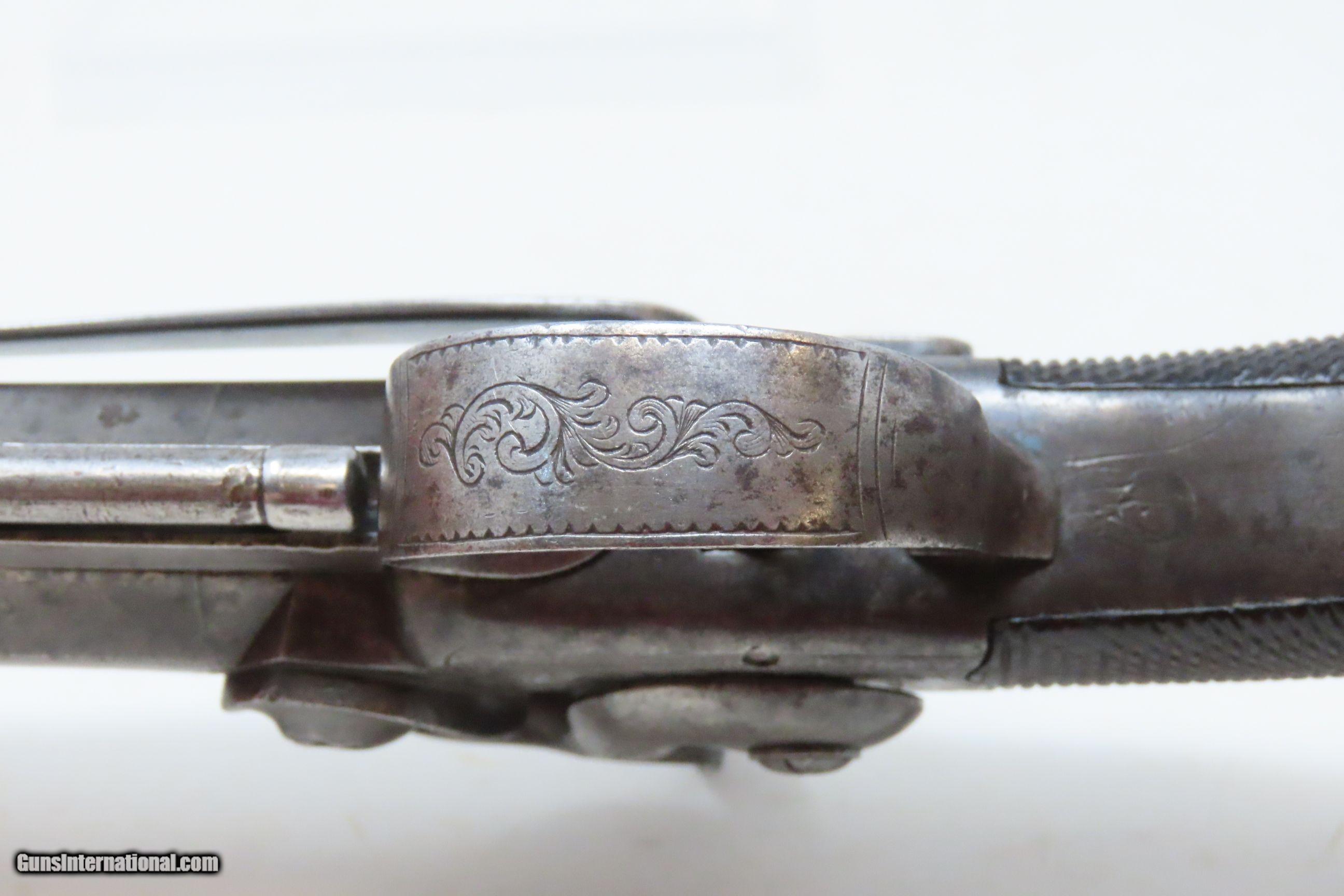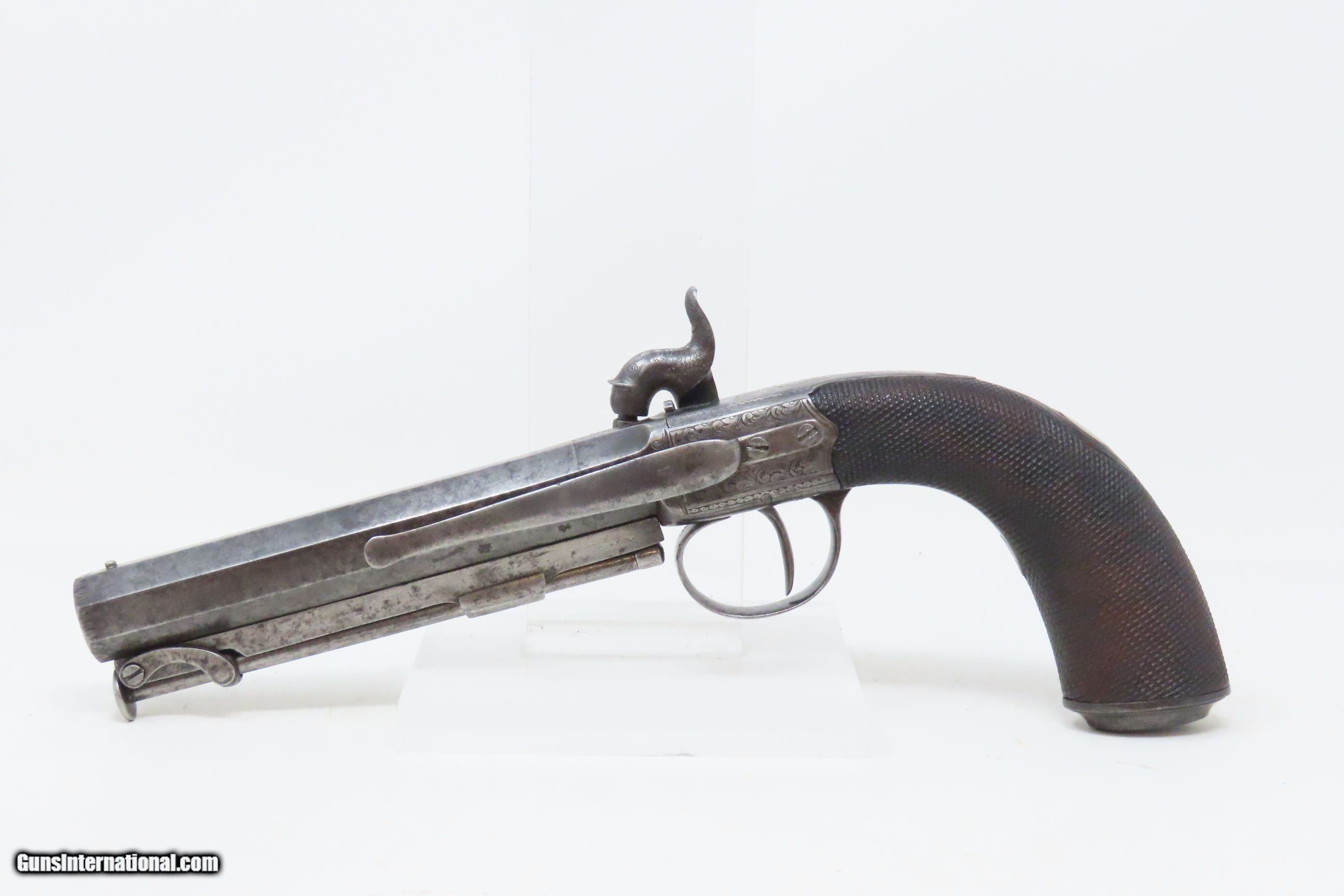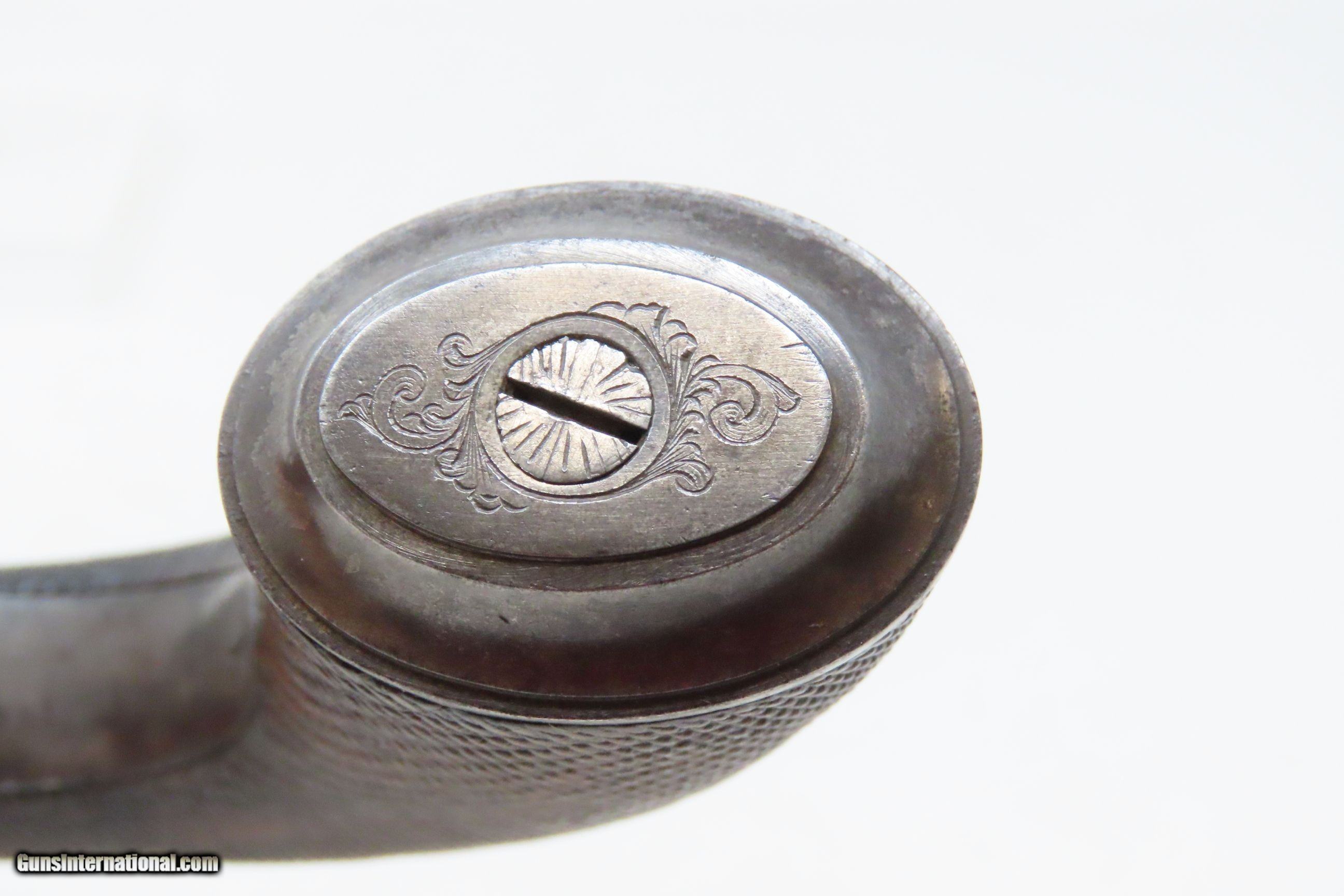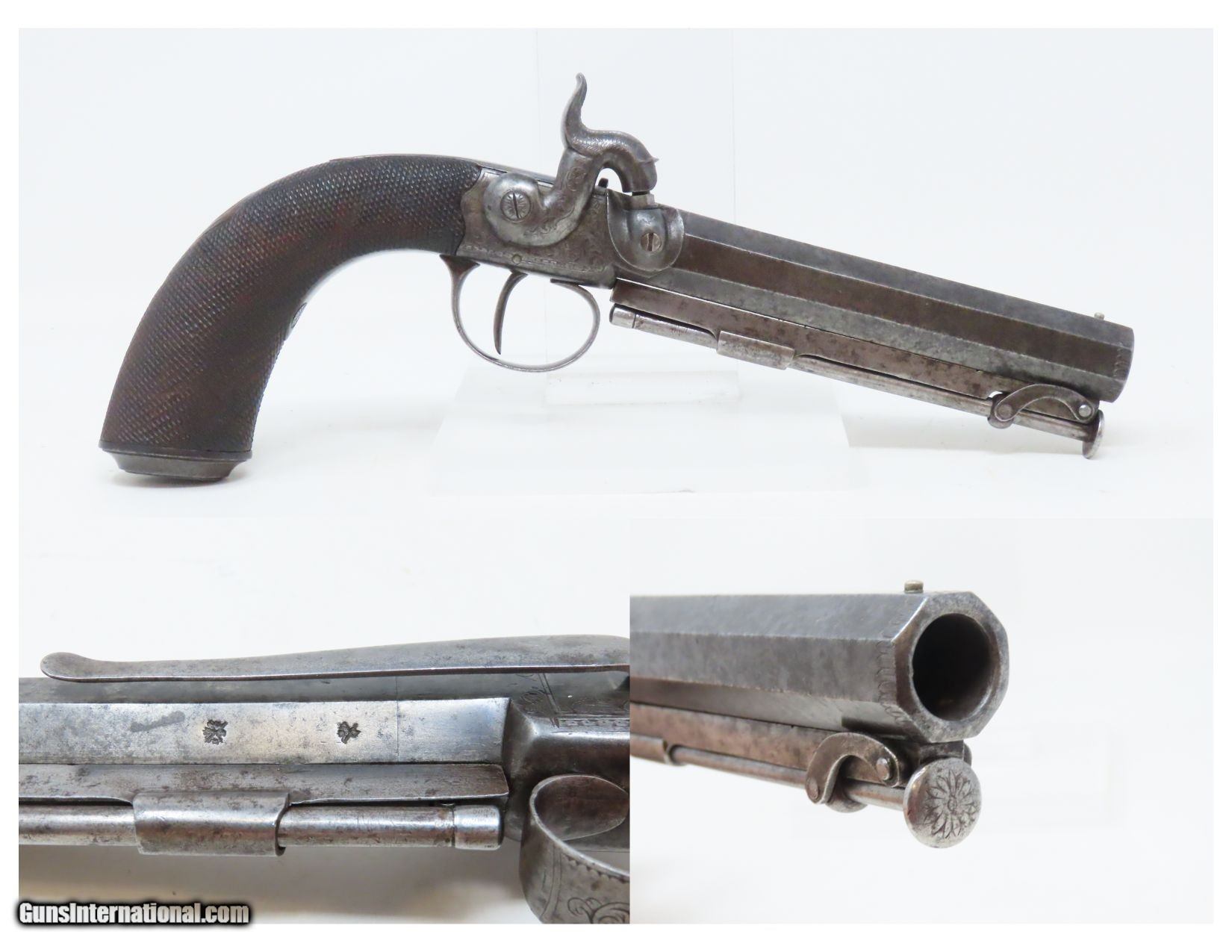 Description: ENGRAVED Antique BRITISH Boxlock .54 “MANSTOPPER” Percussion BELT Pistol Mid-1800s SIDEHAMMER Belt/Coat Pocket Pistol Here we present a nicely engraved antique British Sidehammer Boxlock Percussion Belt Pistol, made circa the 1850s in Birmingham, England. This little self-defense pistol would have been most at home in a gentleman’s coat pocket or hooked onto the belt of anyone in the busy cities of Europe during the mid-1800s. This pistol is light and simple. The “Pocket Pistol” name says it all. They were the "Saturday Night Specials" of the 16th-18th century. Before the Deringer, they were "Gentleman's" or "Muff Pistols", typically, a smaller pistol that was easily concealed. They were favored among the gentry and women because of these traits. Men would carry them concealed in a waistcoat pocket and women would hide them in a hand muff. It is elegantly engraved on the sides of the frame. With its .54 caliber “manstopping” bore, this pistol would have been quite the deterrent against ne’er do wells and ruffians roaming the city streets in tumultuous Europe in the early to mid-1800s. The overall condition is good. The grip has maintained sharp checkering and sits solidly against the frame. Sharp engravings. The action is strong. The bore is smooth and remains in good shape for its age. A few British proofs are present on the left lower barrel flat. Own the original! This is a legitimate antique and not a reproduction. Barrel is 5 inches. Caliber: .54 Percussion Overall condition as seen in photos. Very Fast. Very Safe. FREE SHIPPING WORLDWIDE. Delivered directly to your door by express mail! Guaranteed AUTHENTIC & Includes CERTIFICATE OF AUTHENTICITY. ancestryguns $1200 #233192 SOLD Antique: Yes |