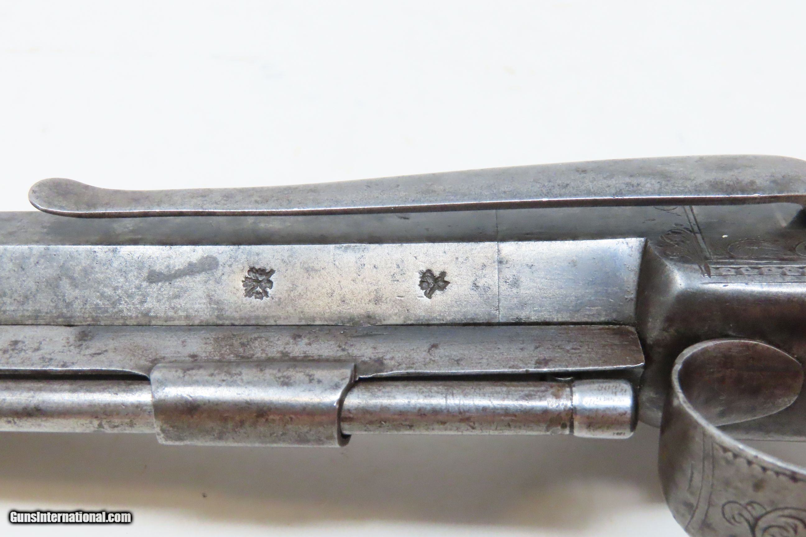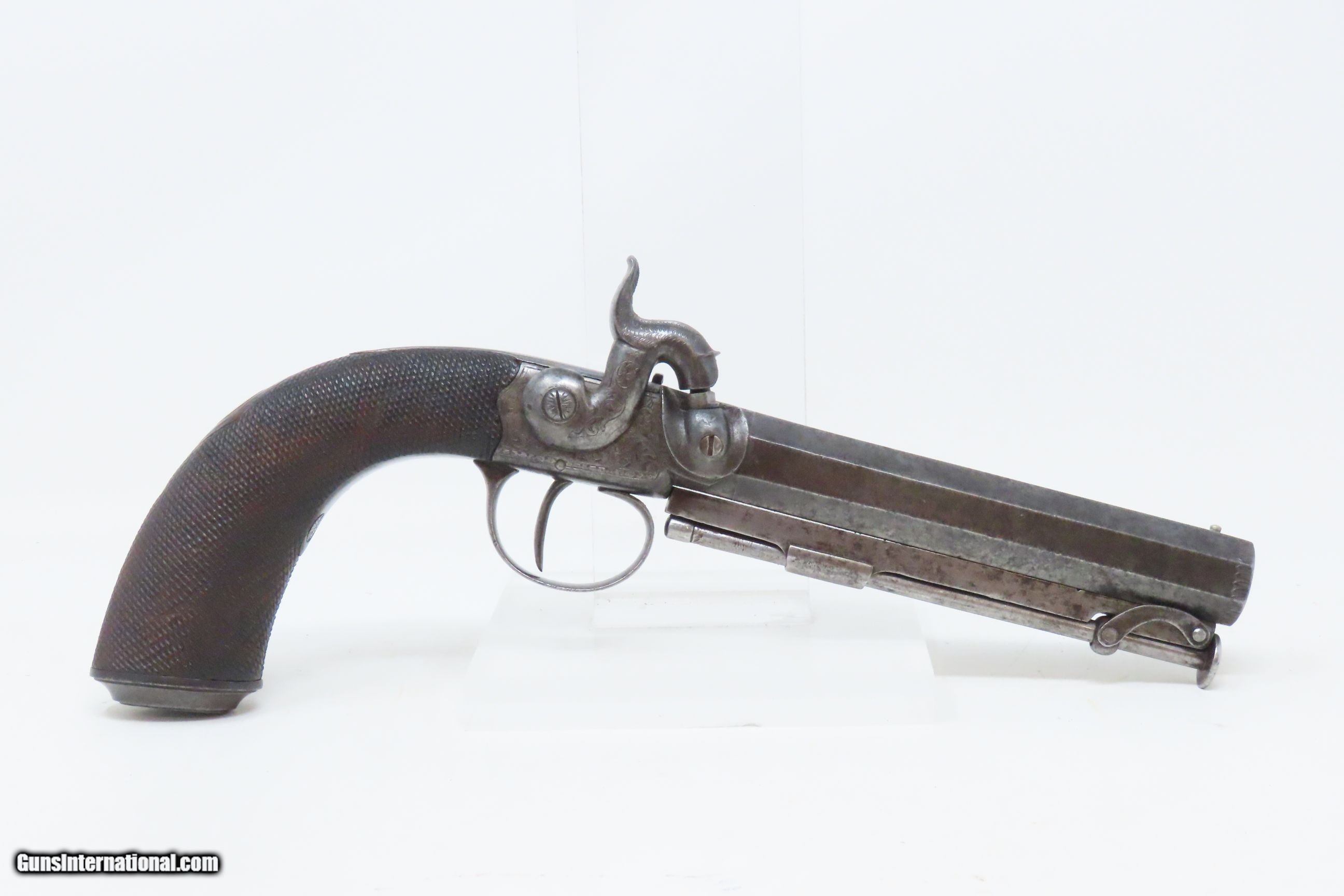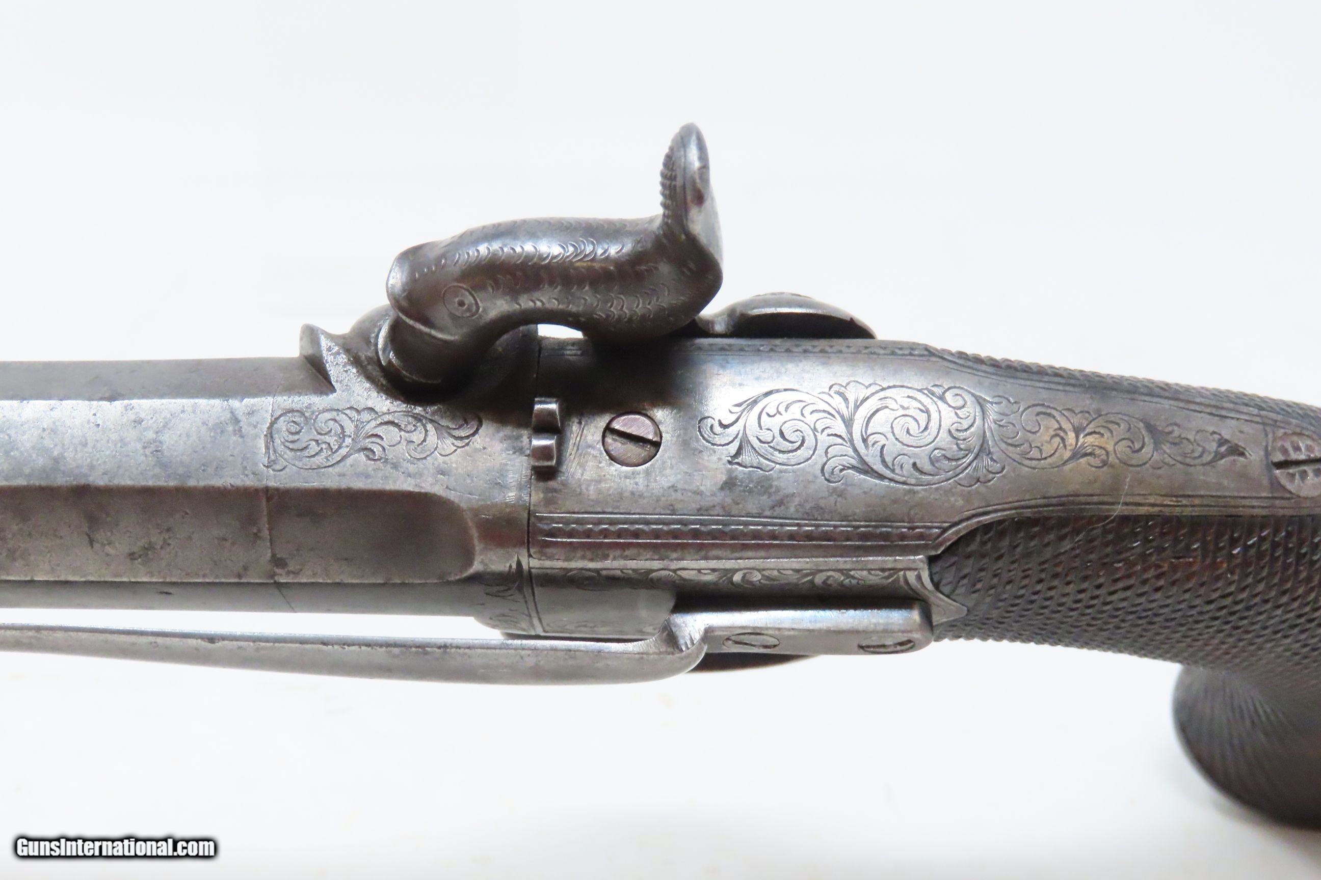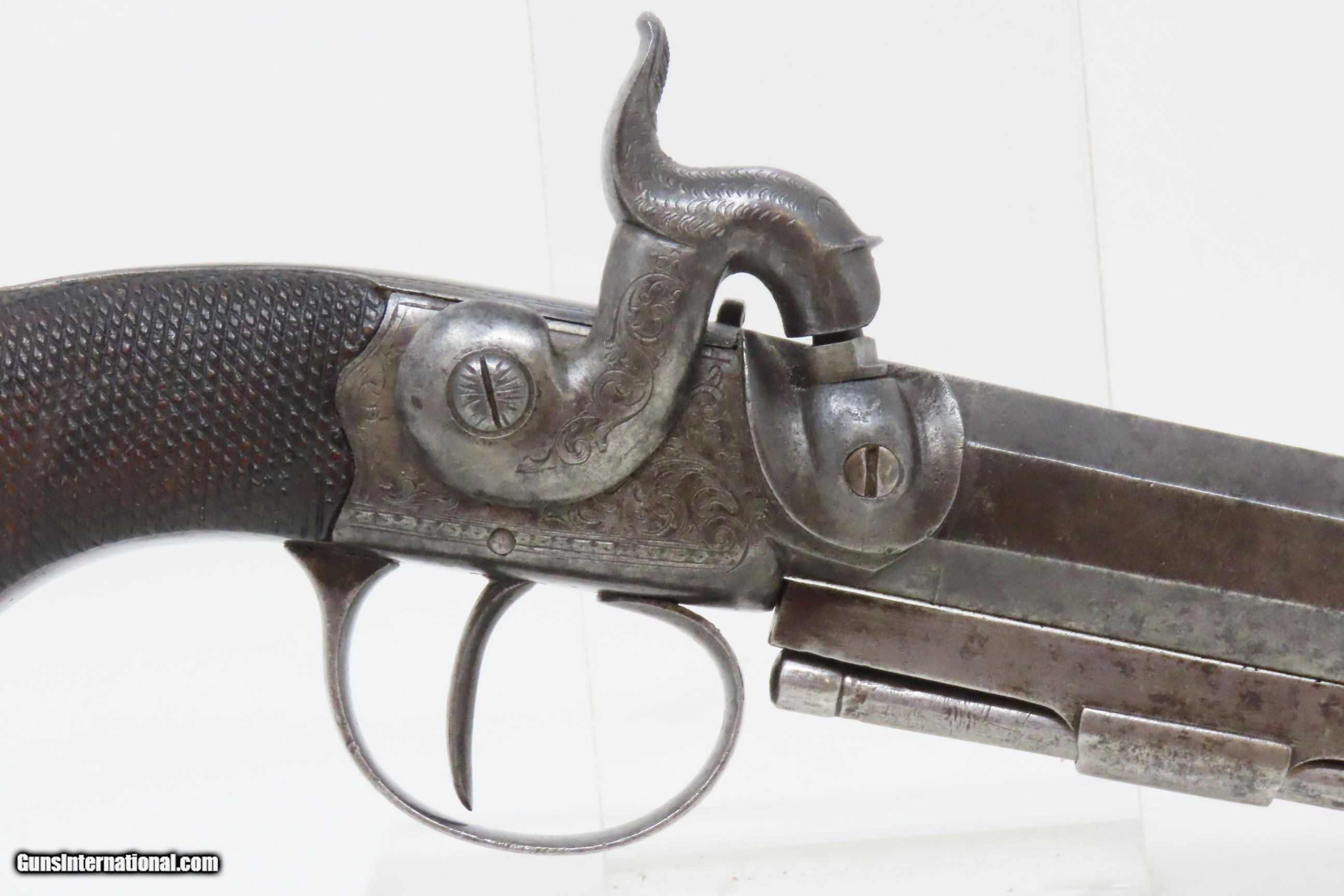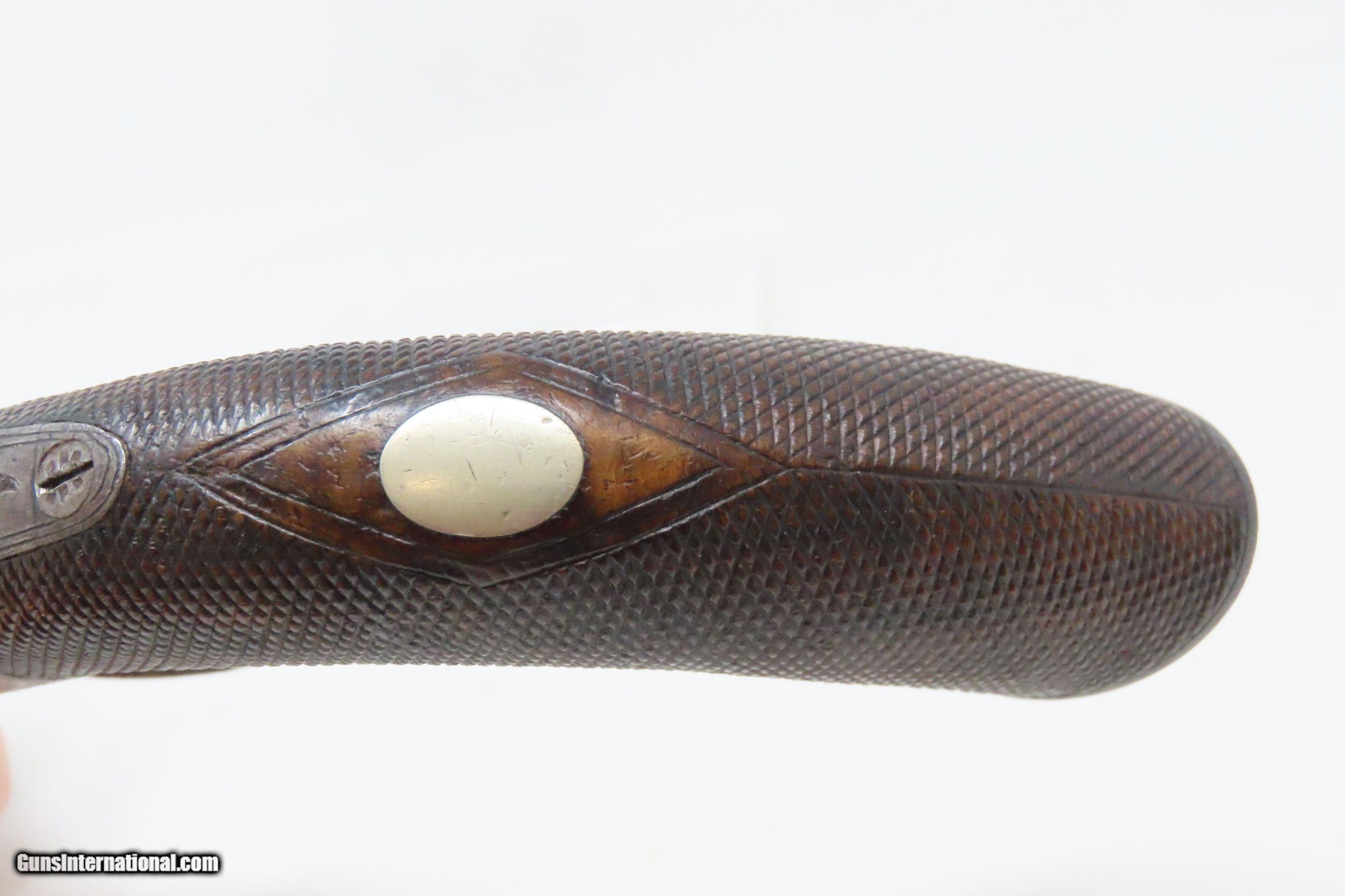 Description: ENGRAVED Antique BRITISH Boxlock .54 “MANSTOPPER” Percussion BELT Pistol Mid-1800s SIDEHAMMER Belt/Coat Pocket Pistol Here we present a nicely engraved antique British Sidehammer Boxlock Percussion Belt Pistol, made circa the 1850s in Birmingham, England. This little self-defense pistol would have been most at home in a gentleman’s coat pocket or hooked onto the belt of anyone in the busy cities of Europe during the mid-1800s. This pistol is light and simple. The “Pocket Pistol” name says it all. They were the "Saturday Night Specials" of the 16th-18th century. Before the Deringer, they were "Gentleman's" or "Muff Pistols", typically, a smaller pistol that was easily concealed. They were favored among the gentry and women because of these traits. Men would carry them concealed in a waistcoat pocket and women would hide them in a hand muff. It is elegantly engraved on the sides of the frame. With its .54 caliber “manstopping” bore, this pistol would have been quite the deterrent against ne’er do wells and ruffians roaming the city streets in tumultuous Europe in the early to mid-1800s. The overall condition is good. The grip has maintained sharp checkering and sits solidly against the frame. Sharp engravings. The action is strong. The bore is smooth and remains in good shape for its age. A few British proofs are present on the left lower barrel flat. Own the original! This is a legitimate antique and not a reproduction. Barrel is 5 inches. Caliber: .54 Percussion Overall condition as seen in photos. Very Fast. Very Safe. FREE SHIPPING WORLDWIDE. Delivered directly to your door by express mail! Guaranteed AUTHENTIC & Includes CERTIFICATE OF AUTHENTICITY. ancestryguns $1200 #233192 SOLD Antique: Yes |
