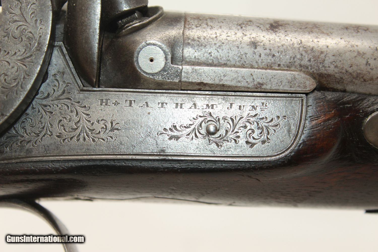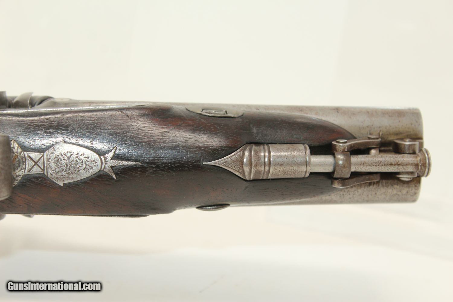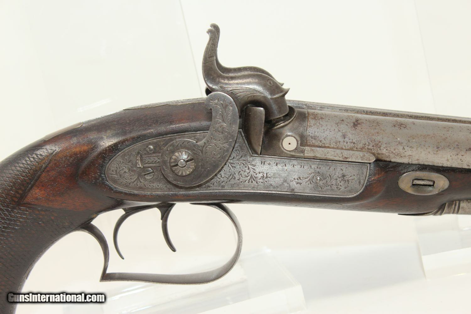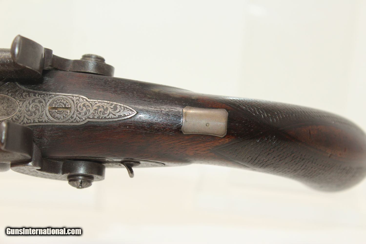 Description: ENGRAVED British DOUBLE BARREL Pistol by TATHAM Made Circa 1850 at Charing Cross, London! Here we present an antique Henry Tatham Junior Double Barrel Percussion Pistol in .42 Caliber, made circa 1850 in the family shop at 37 Charing Cross, London, England. This was a multi-generational family business, possibly extending further back than Henry Tatham Sr. (1770-1835), but certainly including his sons Henry Tatham Junior (1804-1860) and Charles Tatham (d.1846). This pistol shows good workmanship and is nicely engraved on the lock, trigger guard and barrel tang. Each of the hammers is shaped and engraved to resemble a creature. A double-barreled pistol in these days would have given the user an advantage over most adversaries since single shot pistols were the order of the day, being simpler and less expensive to make. This pistol features a single captive ramrod on a swivel to aid in loading both barrels. The trigger guard is distinct with its curvature and sharp bend in front of the knuckle. It was made for a .42 caliber projectile which would have been just right for this size of pistol that would have been carried on the belt. Each lock is marked “H TATHAM JUNR”, as is the rib between the barrels, along with “LONDON”. The overall condition is very good. The iron parts have an aged patina. The markings are clear. The stock is in very good shape. The bores are smooth and in very good condition. The actions are excellent. Here is a handsome and well-made pistol that would have given the user the upper hand! Own the original! This is a legitimate antique and not a reproduction. Barrel is 4-1/2 inches. Caliber: .42 (actual diameter .425 inches) Overall condition as seen in photos. Very Fast. Very Safe. FREE SHIPPING WORLDWIDE. Delivered directly to your door by express mail! Guaranteed AUTHENTIC & Includes CERTIFICATE OF AUTHENTICITY. ancestryguns $1695 #190404 SOLD Antique: Yes |
