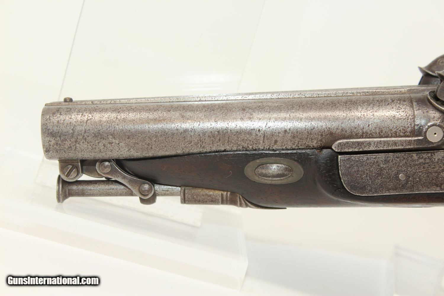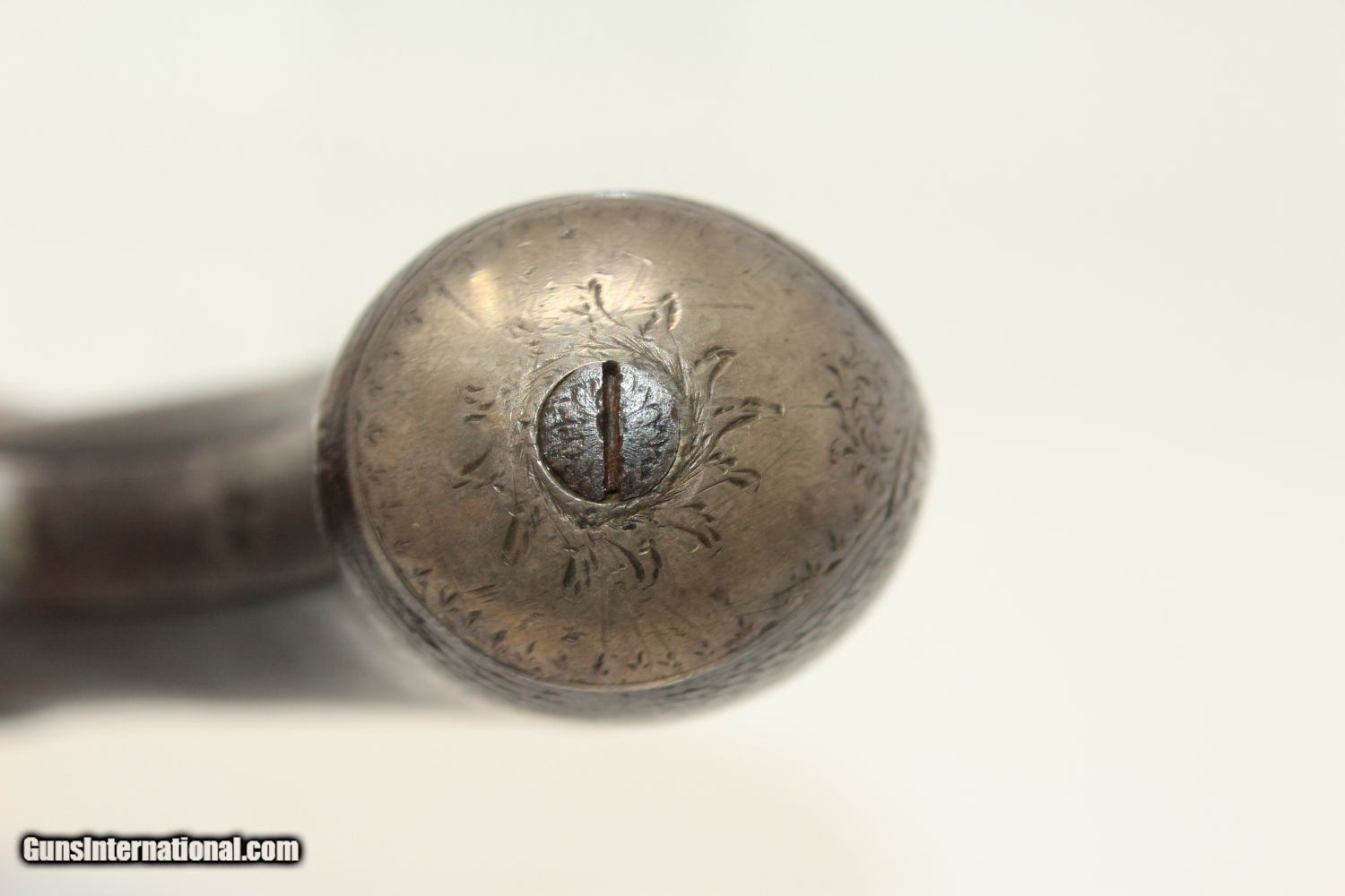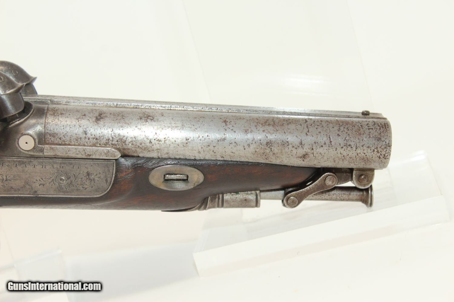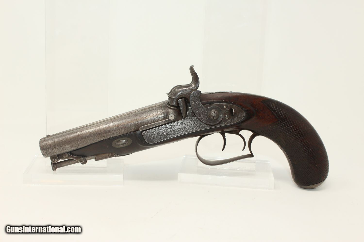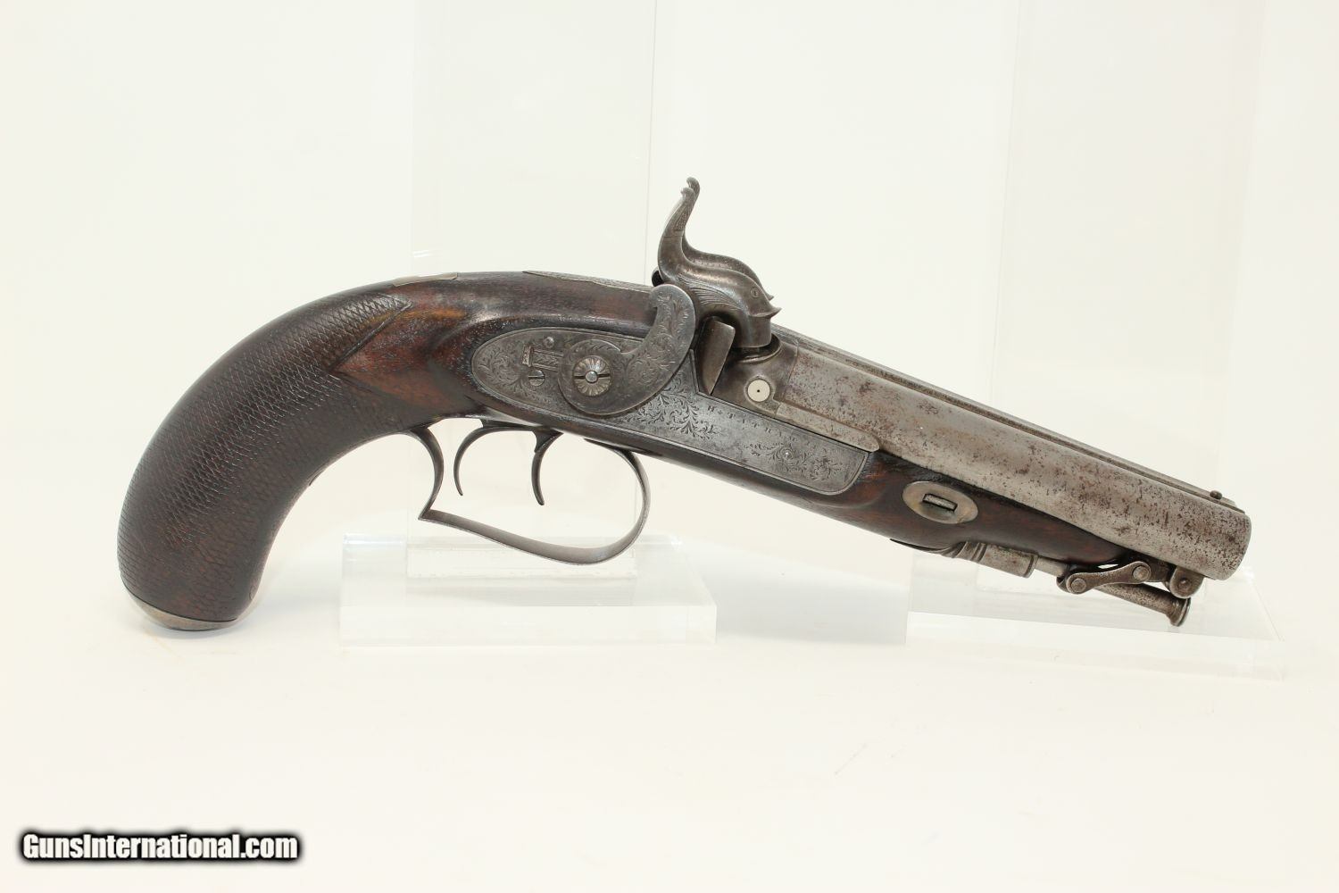 Description: ENGRAVED British DOUBLE BARREL Pistol by TATHAM Made Circa 1850 at Charing Cross, London! Here we present an antique Henry Tatham Junior Double Barrel Percussion Pistol in .42 Caliber, made circa 1850 in the family shop at 37 Charing Cross, London, England. This was a multi-generational family business, possibly extending further back than Henry Tatham Sr. (1770-1835), but certainly including his sons Henry Tatham Junior (1804-1860) and Charles Tatham (d.1846). This pistol shows good workmanship and is nicely engraved on the lock, trigger guard and barrel tang. Each of the hammers is shaped and engraved to resemble a creature. A double-barreled pistol in these days would have given the user an advantage over most adversaries since single shot pistols were the order of the day, being simpler and less expensive to make. This pistol features a single captive ramrod on a swivel to aid in loading both barrels. The trigger guard is distinct with its curvature and sharp bend in front of the knuckle. It was made for a .42 caliber projectile which would have been just right for this size of pistol that would have been carried on the belt. Each lock is marked “H TATHAM JUNR”, as is the rib between the barrels, along with “LONDON”. The overall condition is very good. The iron parts have an aged patina. The markings are clear. The stock is in very good shape. The bores are smooth and in very good condition. The actions are excellent. Here is a handsome and well-made pistol that would have given the user the upper hand! Own the original! This is a legitimate antique and not a reproduction. Barrel is 4-1/2 inches. Caliber: .42 (actual diameter .425 inches) Overall condition as seen in photos. Very Fast. Very Safe. FREE SHIPPING WORLDWIDE. Delivered directly to your door by express mail! Guaranteed AUTHENTIC & Includes CERTIFICATE OF AUTHENTICITY. ancestryguns $1695 #190404 SOLD Antique: Yes |