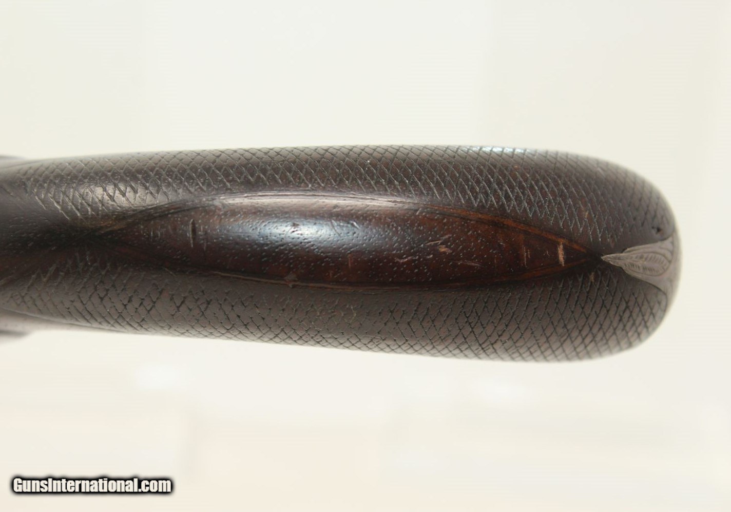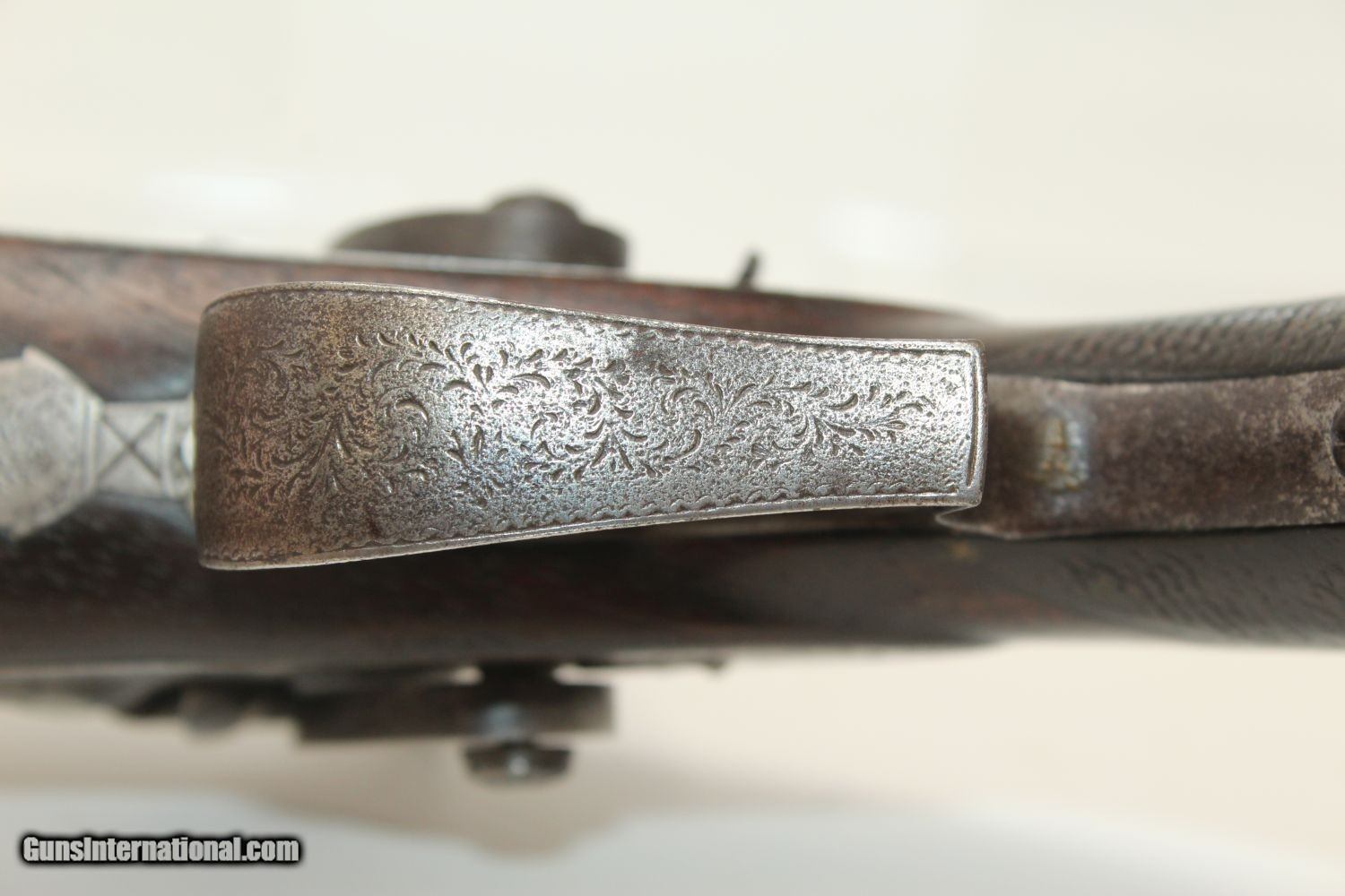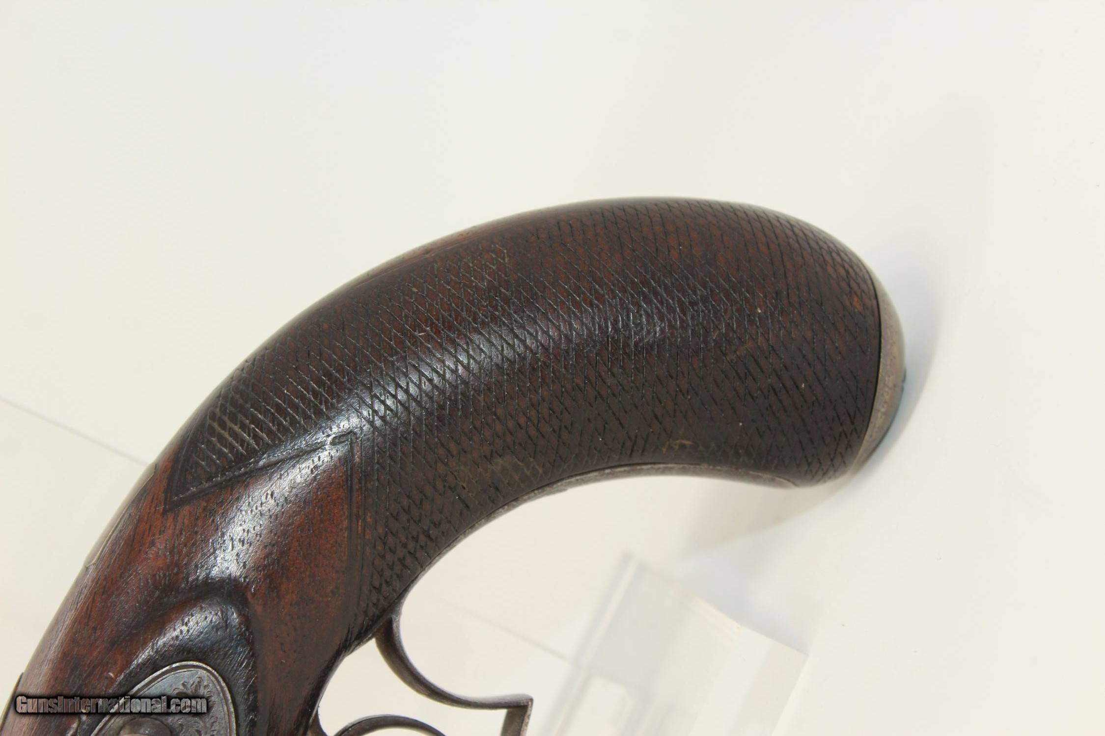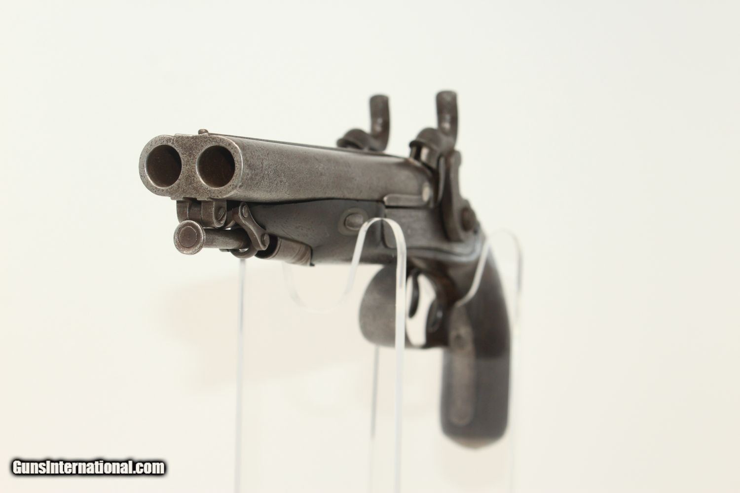 Description: ENGRAVED British DOUBLE BARREL Pistol by TATHAM Made Circa 1850 at Charing Cross, London! Here we present an antique Henry Tatham Junior Double Barrel Percussion Pistol in .42 Caliber, made circa 1850 in the family shop at 37 Charing Cross, London, England. This was a multi-generational family business, possibly extending further back than Henry Tatham Sr. (1770-1835), but certainly including his sons Henry Tatham Junior (1804-1860) and Charles Tatham (d.1846). This pistol shows good workmanship and is nicely engraved on the lock, trigger guard and barrel tang. Each of the hammers is shaped and engraved to resemble a creature. A double-barreled pistol in these days would have given the user an advantage over most adversaries since single shot pistols were the order of the day, being simpler and less expensive to make. This pistol features a single captive ramrod on a swivel to aid in loading both barrels. The trigger guard is distinct with its curvature and sharp bend in front of the knuckle. It was made for a .42 caliber projectile which would have been just right for this size of pistol that would have been carried on the belt. Each lock is marked “H TATHAM JUNR”, as is the rib between the barrels, along with “LONDON”. The overall condition is very good. The iron parts have an aged patina. The markings are clear. The stock is in very good shape. The bores are smooth and in very good condition. The actions are excellent. Here is a handsome and well-made pistol that would have given the user the upper hand! Own the original! This is a legitimate antique and not a reproduction. Barrel is 4-1/2 inches. Caliber: .42 (actual diameter .425 inches) Overall condition as seen in photos. Very Fast. Very Safe. FREE SHIPPING WORLDWIDE. Delivered directly to your door by express mail! Guaranteed AUTHENTIC & Includes CERTIFICATE OF AUTHENTICITY. ancestryguns $1695 #190404 SOLD Antique: Yes |