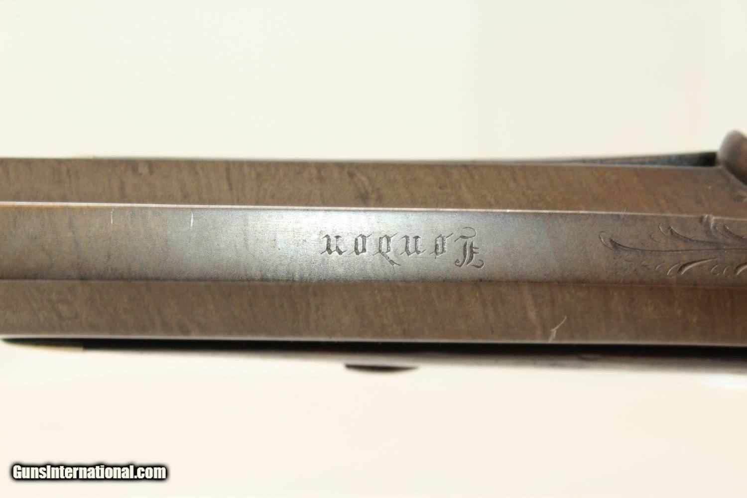 Description: Engraved MANTON Antique BACK-ACTION Perc. Pistol Gold and German Silver Banded Mid-19th Century English Pistol Here we present an antique engraved Manton Percussion Pistol, made Circa 1840 by John Manton Gunmakers of 6 Dover Street, London, England. There were two Manton brothers, John was the elder and Joseph was the younger. John was born in 1752, and after his apprenticeship, set up shop in London in Piccadilly. John Manton was active in London from 1781 to 1834. He began making percussion weapons in 1825. The firm used the name "John Manton and Son" from 1820, though his son George Henry Manton had joined him in 1814. After John's death the family continued to operate the business into the late 19th century with some slight changes in the name. Among the apprentices he trained in gunmaking are famous names such as William Greener and John Blanch, along with his famous brother, Joseph Manton. The overall condition is near fine. The twist pattern remains visible on the barrel. The engravings and markings are clear. The walnut stock is in great shape. The bore is smooth and clean. The action is excellent. A really nice mid-19th Century pistol! Own the original! This is a legitimate antique and not a reproduction. Barrel is 8-3/4 inches. Caliber: .53 (.537) Overall condition as seen in photos. Very Fast. Very Safe. FREE SHIPPING WORLDWIDE. Delivered directly to your door by express mail! Guaranteed AUTHENTIC & Includes CERTIFICATE OF AUTHENTICITY. ancestryguns $1800 #190350 SOLD Antique: Yes |