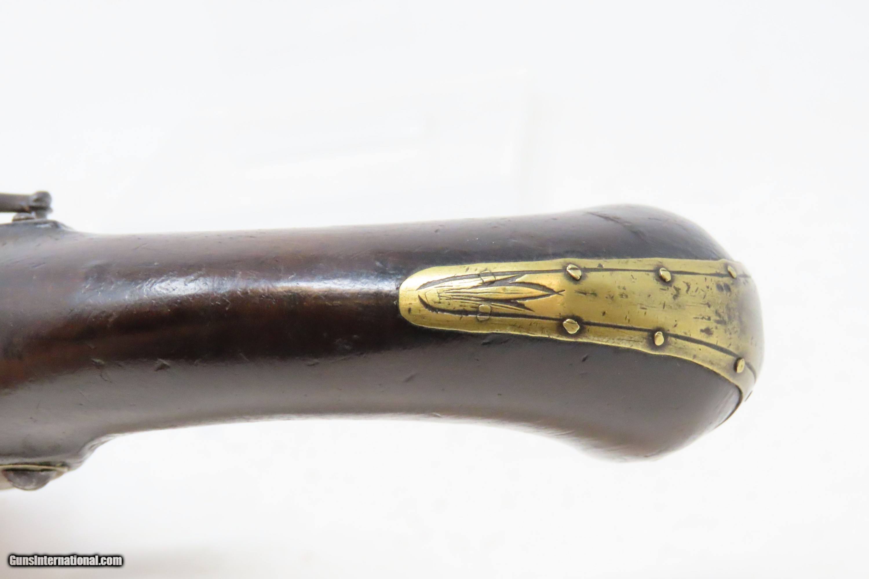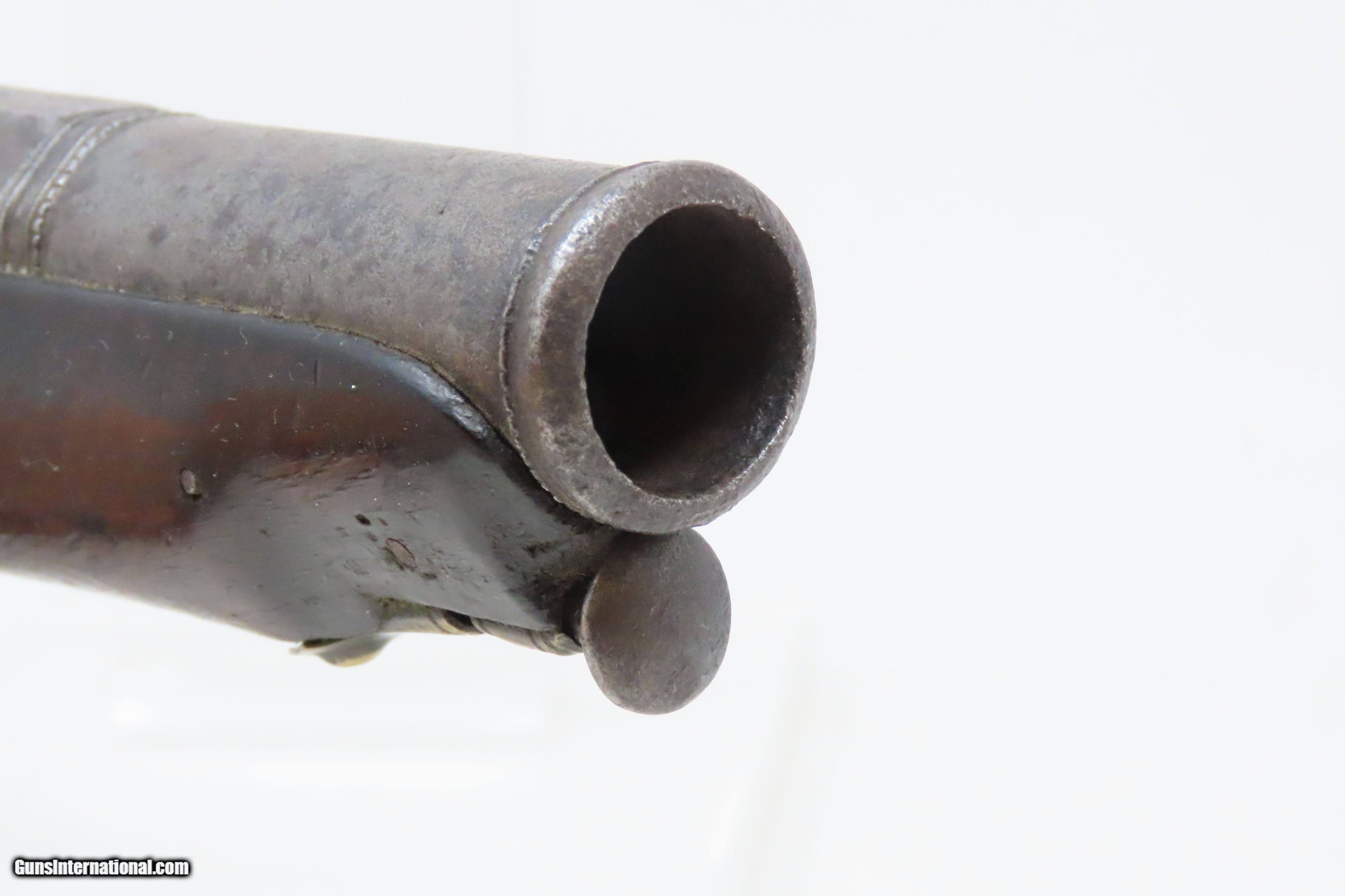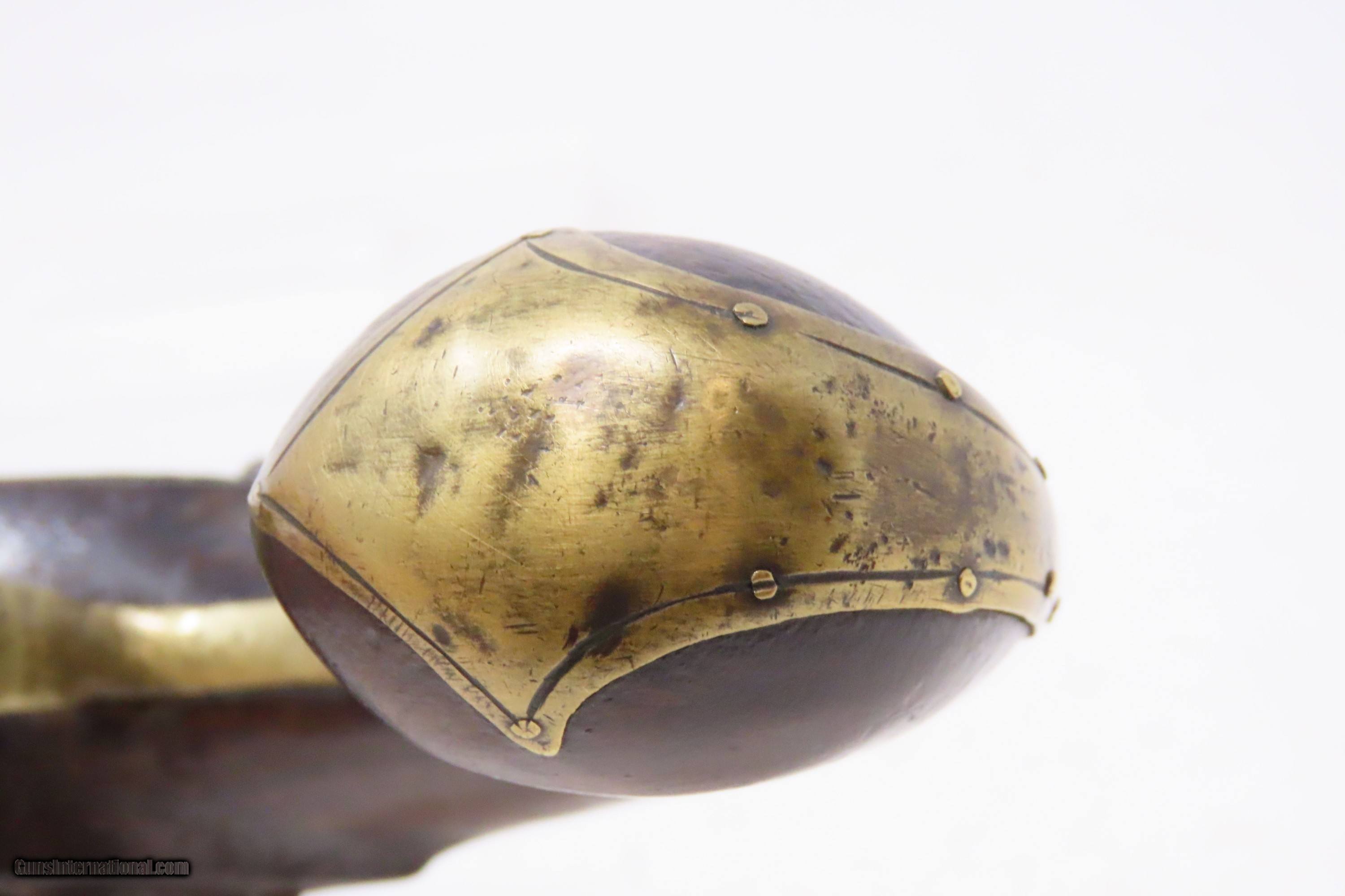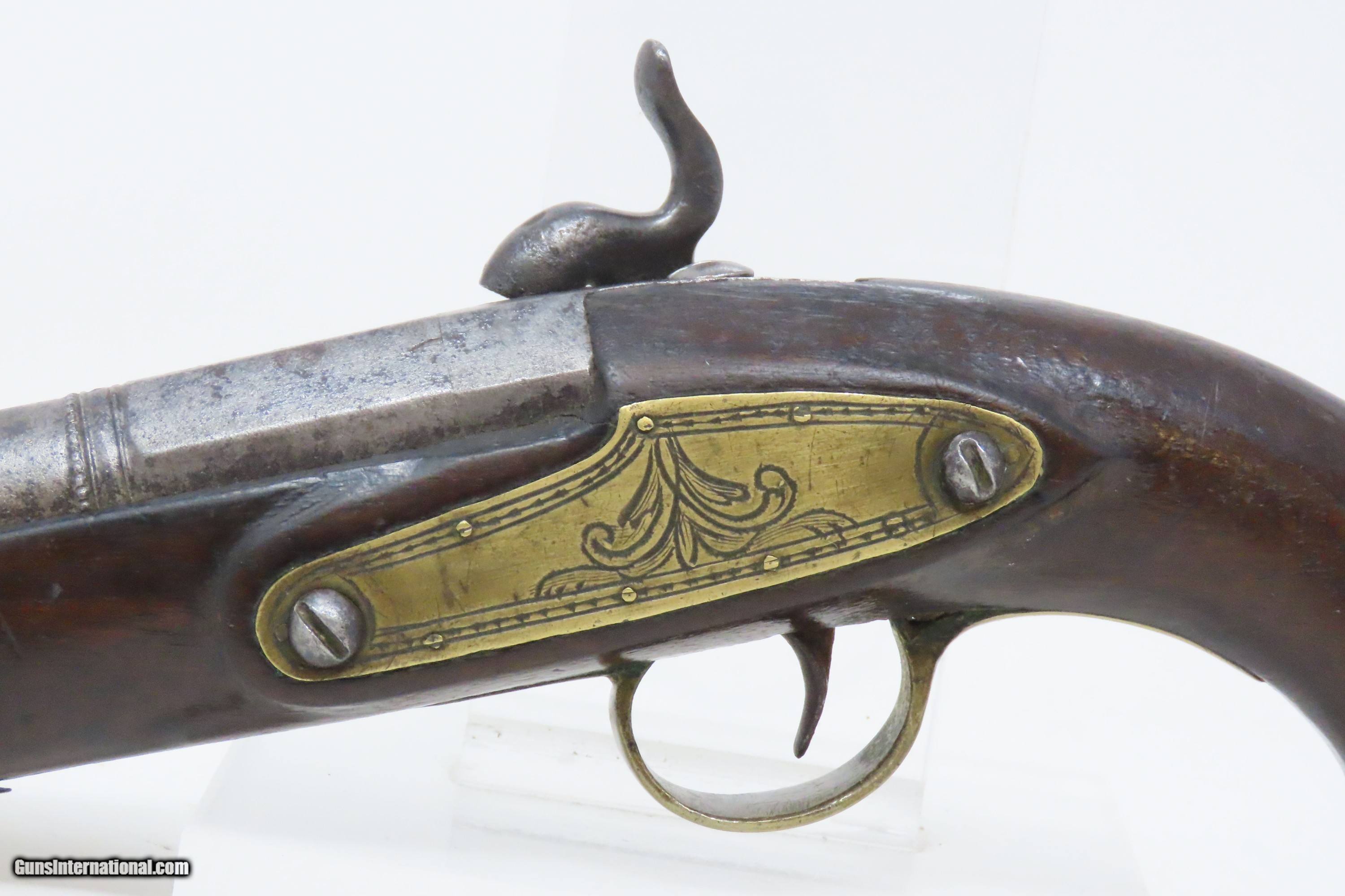 Description: Engraved PATILLA MIQUELET “Militia” Percussion Belt/Pocket Pistol EUROPEAN Early to Mid-19th Century Miquelet Pistol Here we present an antique Patilla, or “Militia” Miquelet Percussion Belt Pistol, made likely in mainland Europe circa the early to mid-19th century. The miquelet was an early and sturdy form of flintlock popular throughout Europe and the Ottoman Empire from the seventeenth into the early nineteenth century. A “Miquelet” is a type of flintlock developed in Spain. It is a distinctive form of snaplock, originally as a flint-against-steel ignition form, once prevalent in Spain, Portugal, Italy, the Balkans, North Africa and the Ottoman Empire from the late 16th to the mid-19th centuries. The miquelet lock, with its combined battery and pan cover was the final innovative link that made the flintlock mechanism possible. It proved to be both the precursor and companion to what we now call the "true" flintlock. The overall condition is good. Strong action. The bore is in good shape for its age. Some chipping is present in front of the lock, otherwise the wood is in good shape. Lightly engraved side plate. Own the original! This is a legitimate antique and not a reproduction. Barrel is 4-1/2 inches. Caliber: .71 Overall condition as seen in photos. Very Fast. Very Safe. FREE SHIPPING WORLDWIDE. Delivered directly to your door by express mail! Guaranteed AUTHENTIC & Includes CERTIFICATE OF AUTHENTICITY. ancestryguns $1200 #233686 SOLD Antique: Yes |