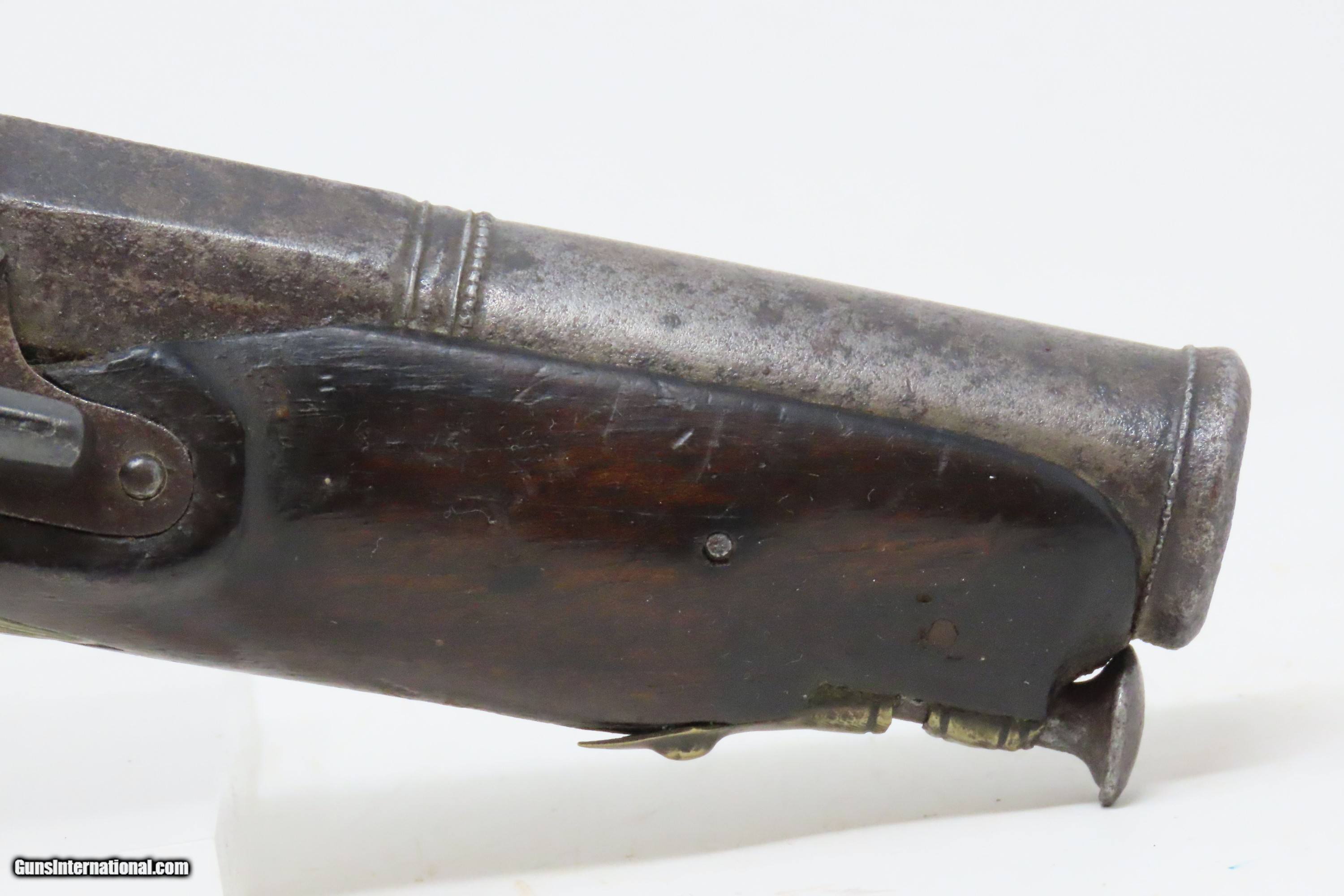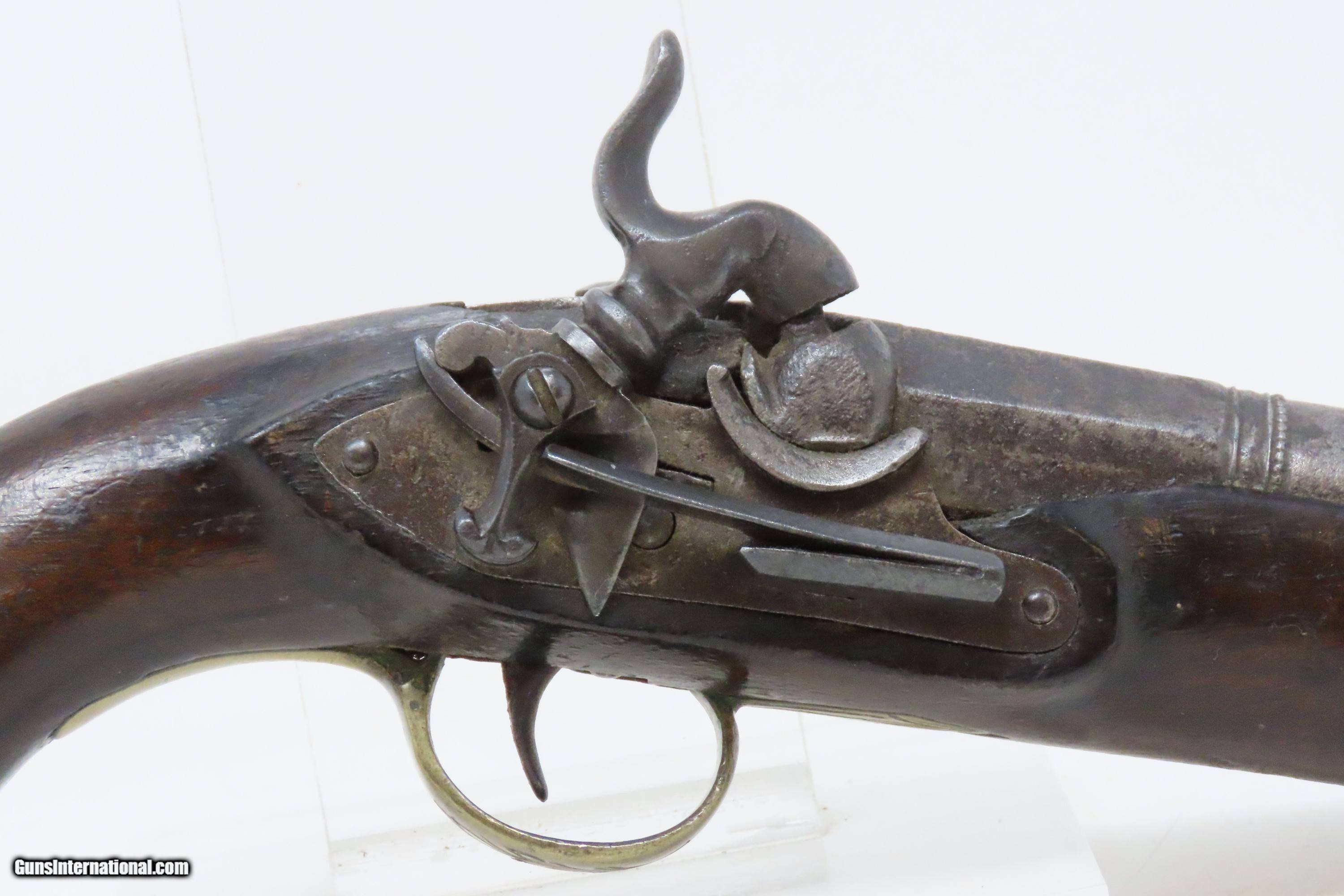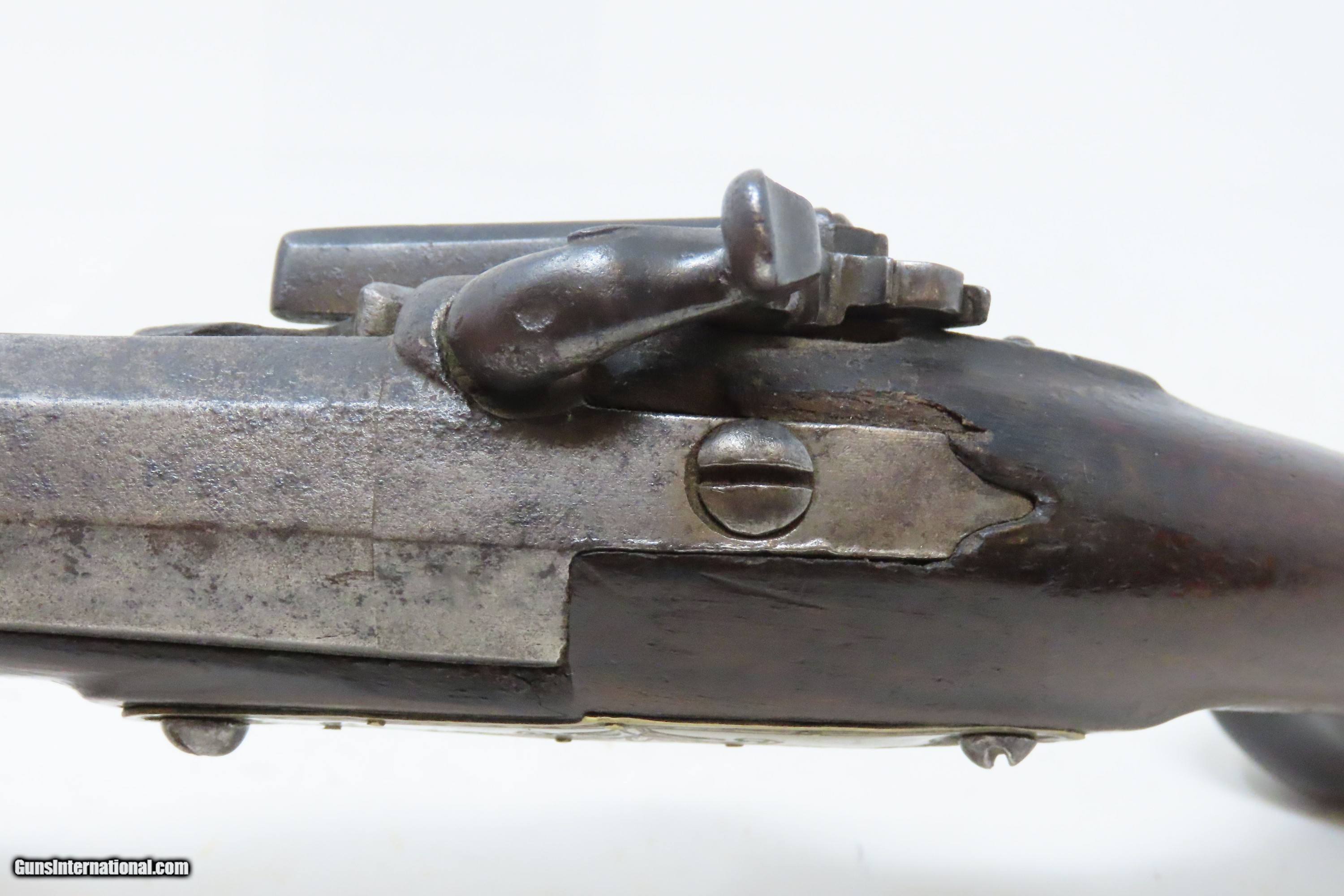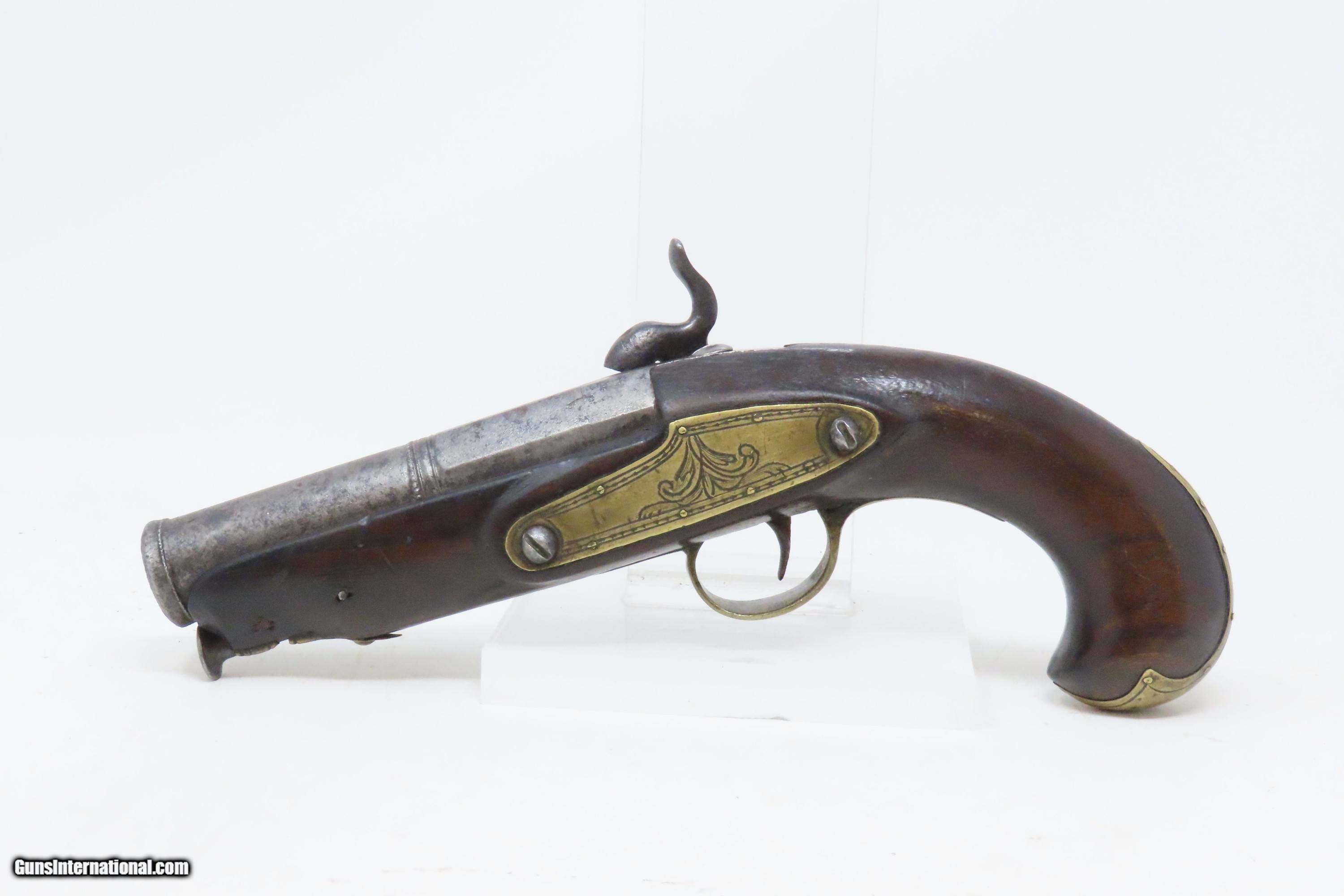 Description: Engraved PATILLA MIQUELET “Militia” Percussion Belt/Pocket Pistol EUROPEAN Early to Mid-19th Century Miquelet Pistol Here we present an antique Patilla, or “Militia” Miquelet Percussion Belt Pistol, made likely in mainland Europe circa the early to mid-19th century. The miquelet was an early and sturdy form of flintlock popular throughout Europe and the Ottoman Empire from the seventeenth into the early nineteenth century. A “Miquelet” is a type of flintlock developed in Spain. It is a distinctive form of snaplock, originally as a flint-against-steel ignition form, once prevalent in Spain, Portugal, Italy, the Balkans, North Africa and the Ottoman Empire from the late 16th to the mid-19th centuries. The miquelet lock, with its combined battery and pan cover was the final innovative link that made the flintlock mechanism possible. It proved to be both the precursor and companion to what we now call the "true" flintlock. The overall condition is good. Strong action. The bore is in good shape for its age. Some chipping is present in front of the lock, otherwise the wood is in good shape. Lightly engraved side plate. Own the original! This is a legitimate antique and not a reproduction. Barrel is 4-1/2 inches. Caliber: .71 Overall condition as seen in photos. Very Fast. Very Safe. FREE SHIPPING WORLDWIDE. Delivered directly to your door by express mail! Guaranteed AUTHENTIC & Includes CERTIFICATE OF AUTHENTICITY. ancestryguns $1200 #233686 SOLD Antique: Yes |