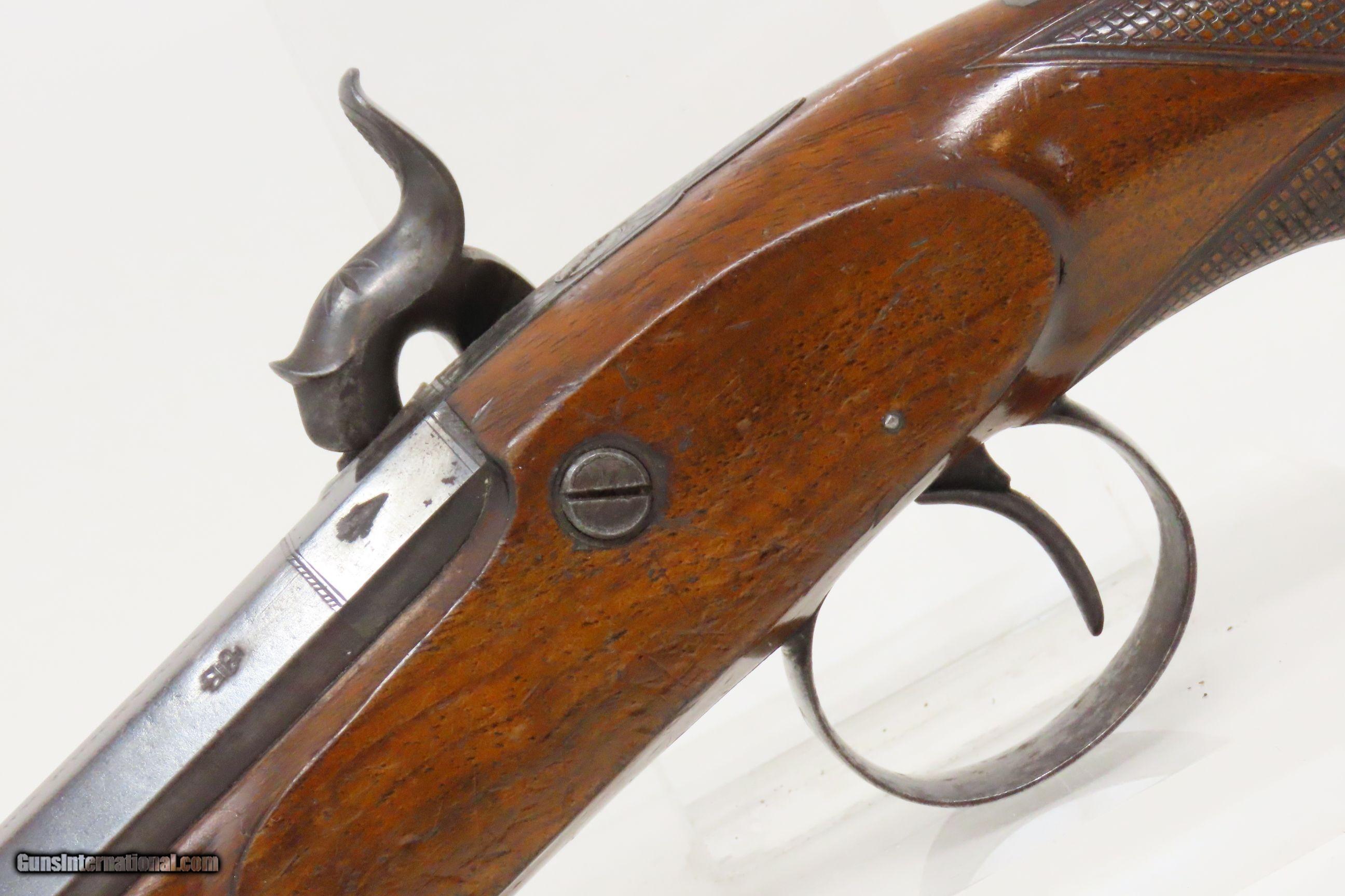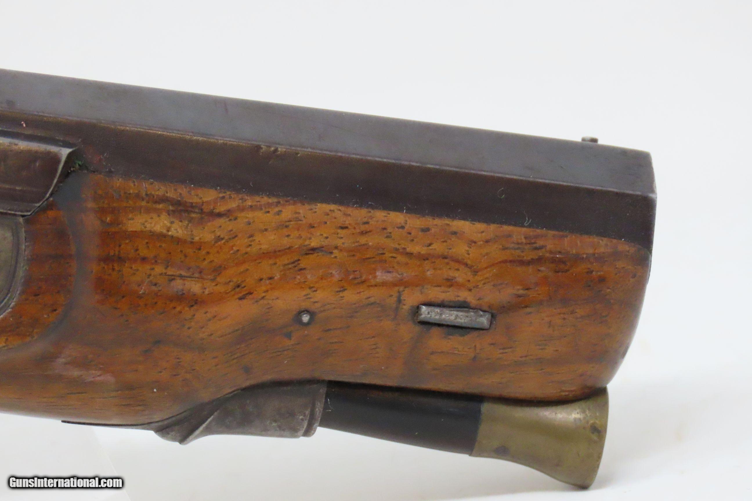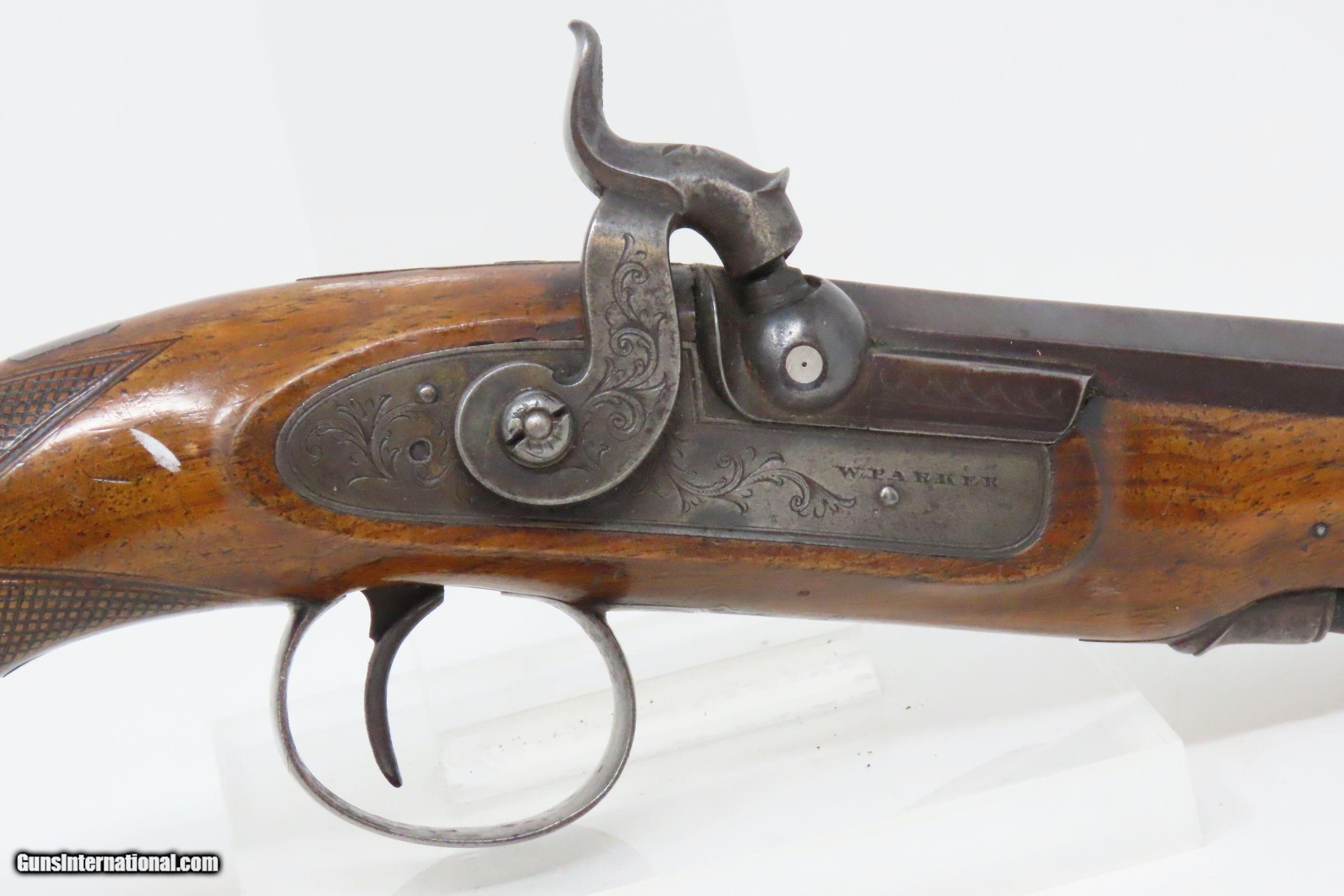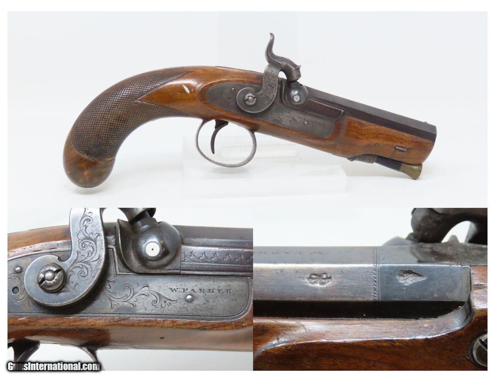 Description: ENGRAVED W. PARKER Antique SIDE-HAMMER .50 Caliber PERCUSSION BELT Pistol English Pistol Made Circa the Late 1830s Here we present an antique English W. Parker Percussion Belt Pistol, made circa the mid-1800s in London, England. William Parker was a gunmaker who worked in London, England. Between 1793 to 1839, he worked out of 233 High Holborn Street, and between 1839 and 1841 at 10 Chamber Street. He was gunmaker to the Duke of Kent, Prince Edward, and William IV. He held contracts to ordnance with the East India Company and the Hudson Bay Company. He supplied arms to the London Police between 1803 and the Metropolitan Police from 1829 until he died at age 68 in 1841. His company was succeeded by Park Field and Sons. This pistol features a large .50 caliber “manstopping” bore that would have been worn on the belt or holstered as it was possibly carried into battle by a soldier purchased for himself who was wanting a backup weapon. This is a neat old pistol and one can easily imagine the sight of its gaping bore would certainly be a deterrent to would be scoundrels and would have made a stately weapon for self defense in mid-19th Century Britain. It would have felt right at home in a gentleman’s coat pocket or inside a ladies purse or muff. The overall condition is good. Strong action. The bore is in good shape for its age. Solid stock/grip overall and has retained sharp checkering. Legible markings. Nicely engraved lock, hammer, and tang. This example has been refinished. Own the original! This is a legitimate antique and not a reproduction. Barrel is 3-1/2 inches. Caliber: .50 Percussion Overall condition as seen in photos. Very Fast. Very Safe. FREE SHIPPING WORLDWIDE. Delivered directly to your door by express mail! Guaranteed AUTHENTIC & Includes CERTIFICATE OF AUTHENTICITY. ancestryguns $1500 #230099 SOLD Antique: Yes |
