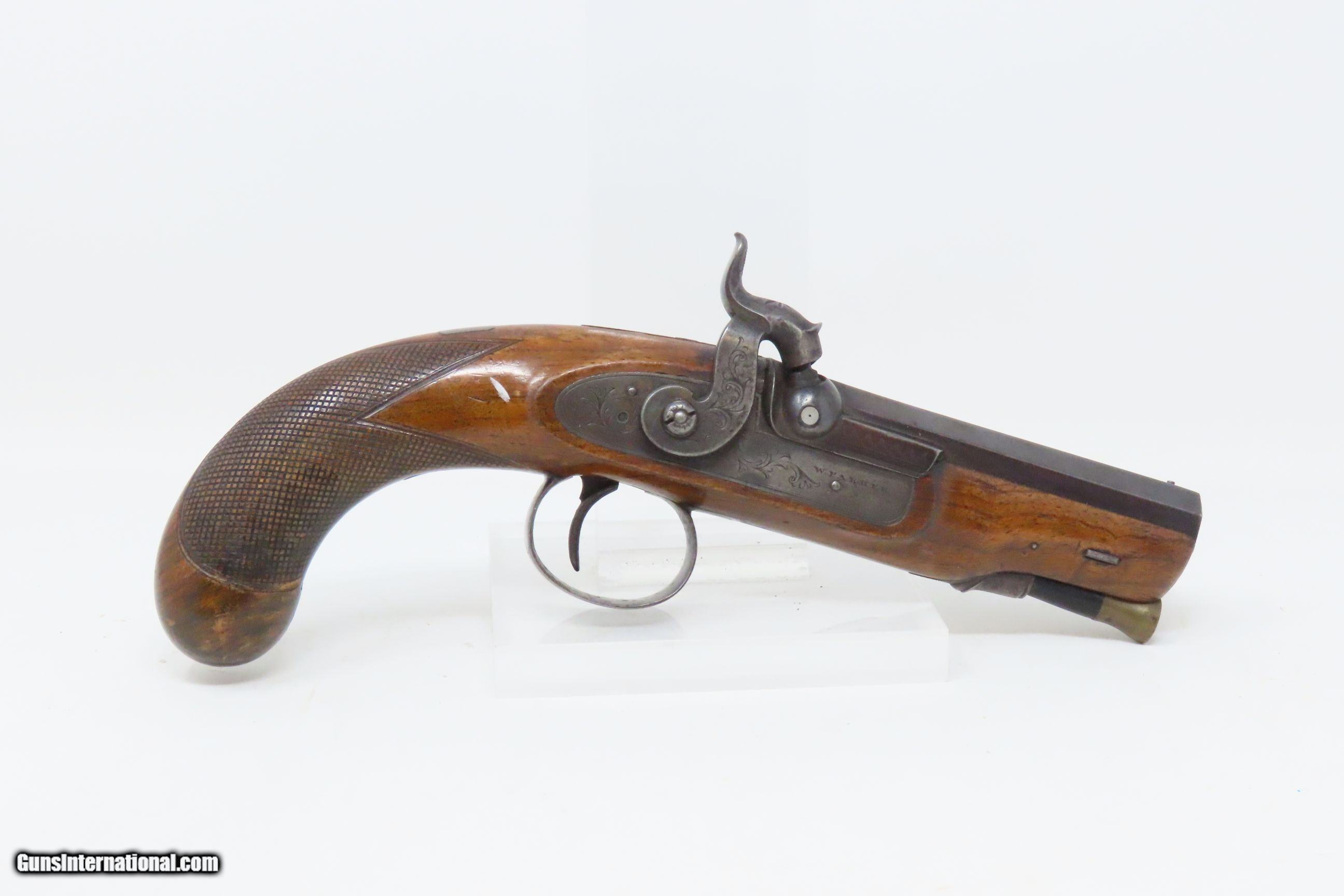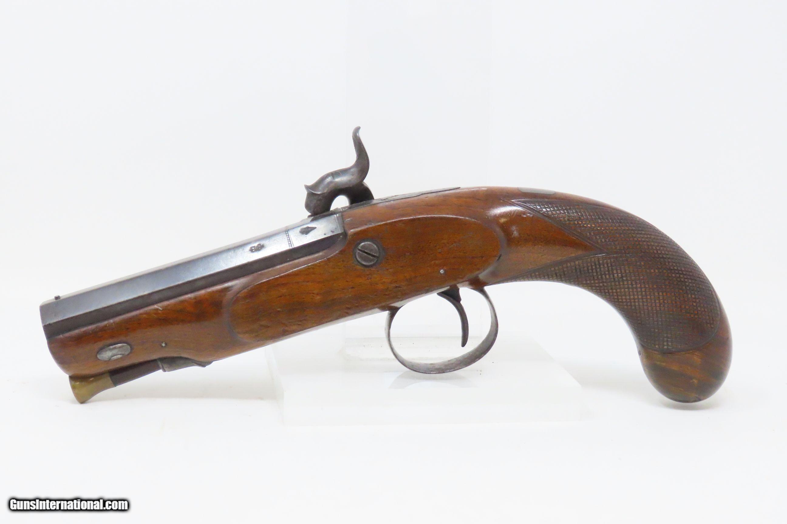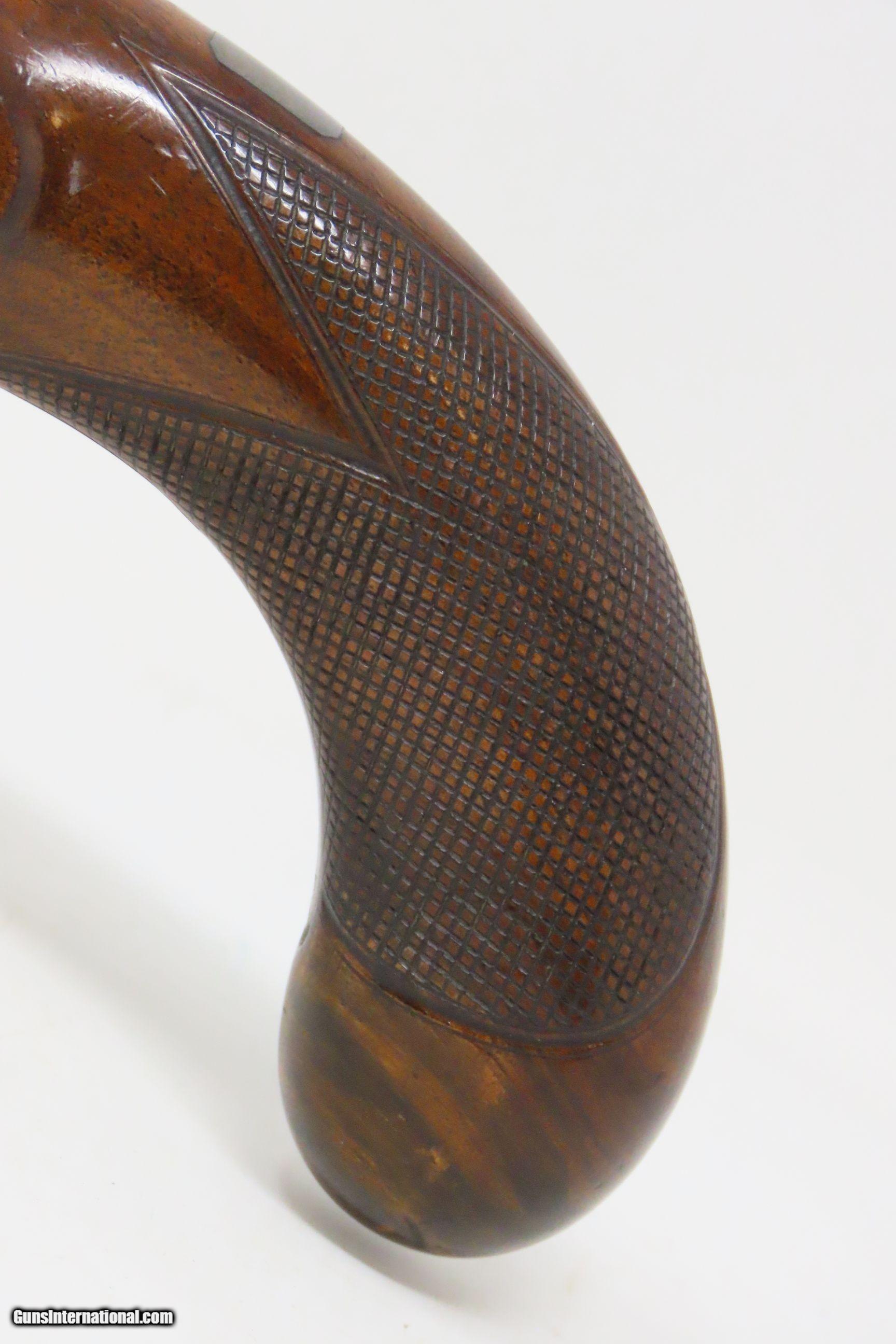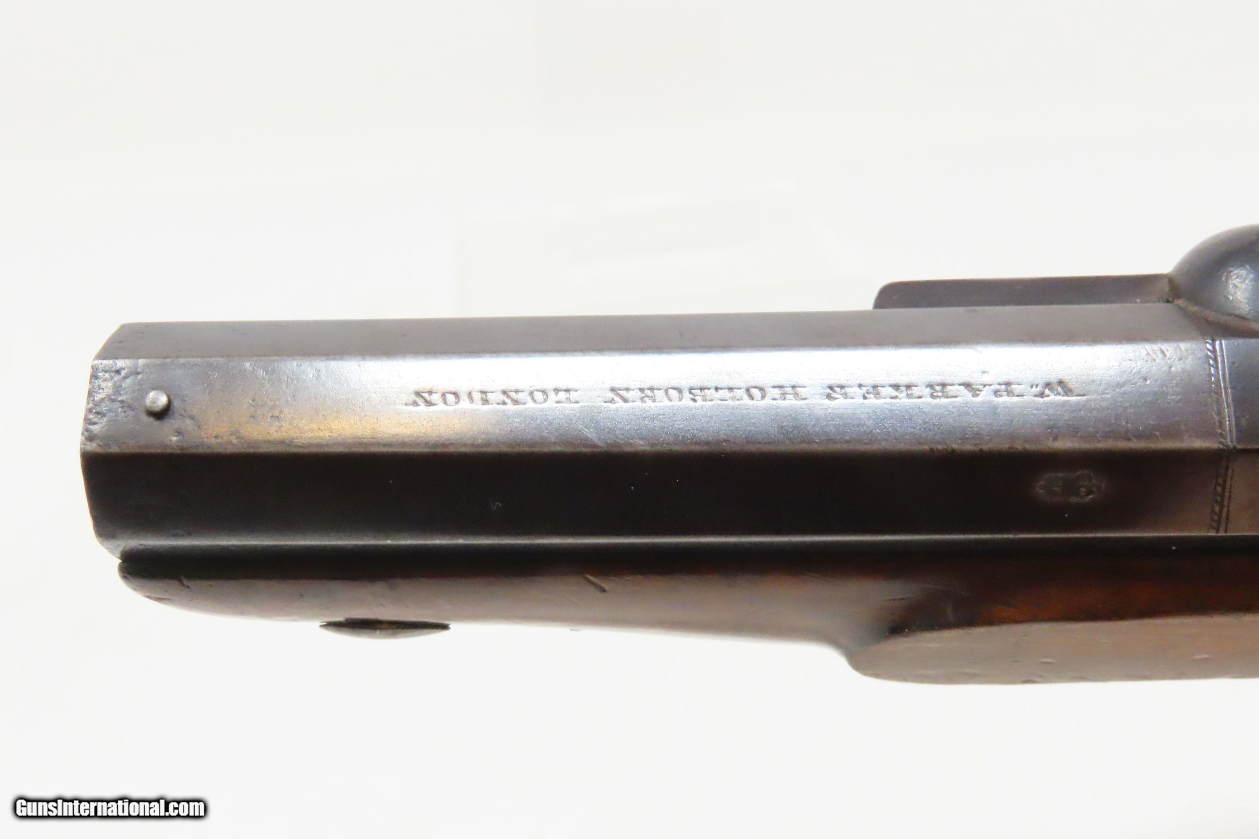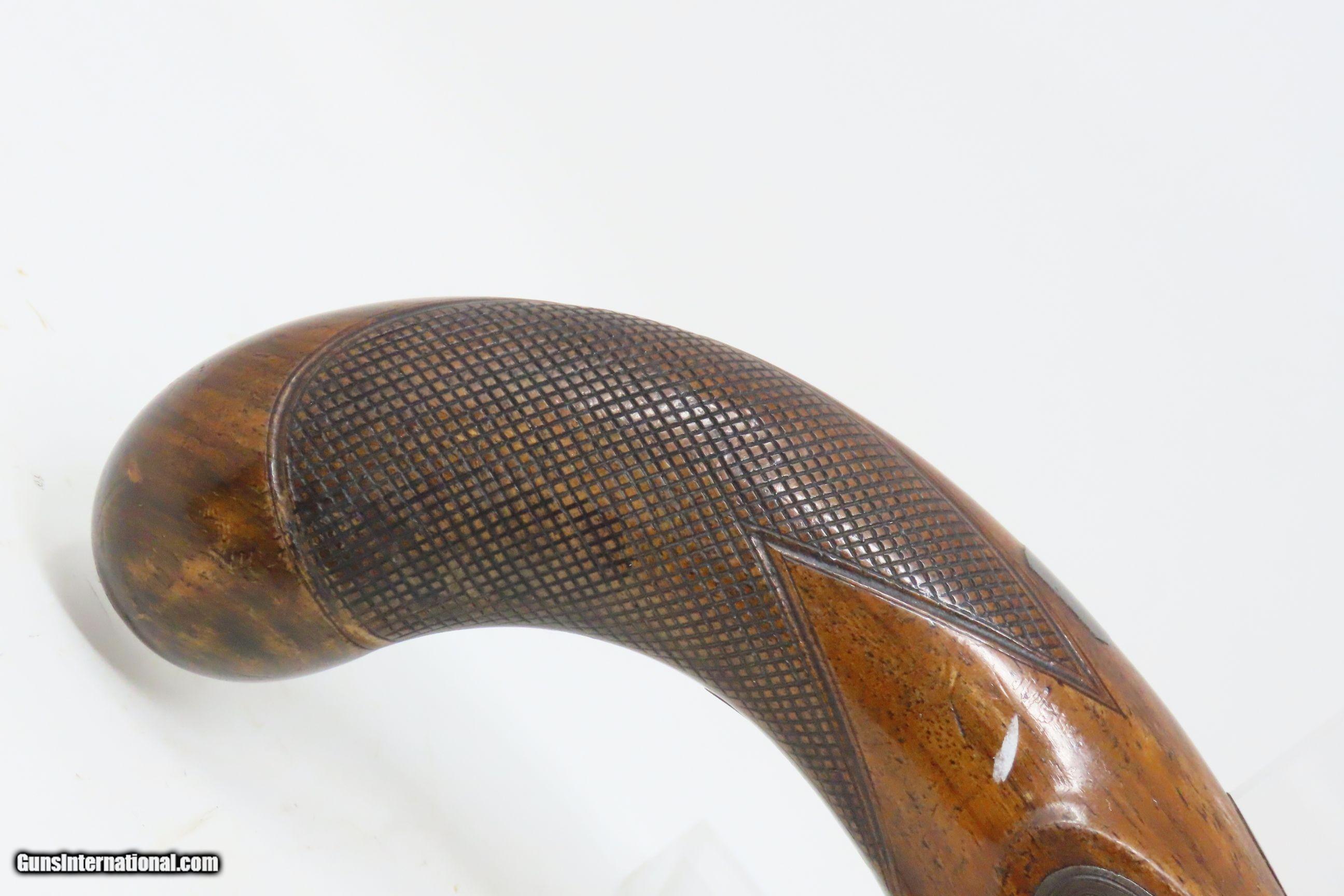 Description: ENGRAVED W. PARKER Antique SIDE-HAMMER .50 Caliber PERCUSSION BELT Pistol English Pistol Made Circa the Late 1830s Here we present an antique English W. Parker Percussion Belt Pistol, made circa the mid-1800s in London, England. William Parker was a gunmaker who worked in London, England. Between 1793 to 1839, he worked out of 233 High Holborn Street, and between 1839 and 1841 at 10 Chamber Street. He was gunmaker to the Duke of Kent, Prince Edward, and William IV. He held contracts to ordnance with the East India Company and the Hudson Bay Company. He supplied arms to the London Police between 1803 and the Metropolitan Police from 1829 until he died at age 68 in 1841. His company was succeeded by Park Field and Sons. This pistol features a large .50 caliber “manstopping” bore that would have been worn on the belt or holstered as it was possibly carried into battle by a soldier purchased for himself who was wanting a backup weapon. This is a neat old pistol and one can easily imagine the sight of its gaping bore would certainly be a deterrent to would be scoundrels and would have made a stately weapon for self defense in mid-19th Century Britain. It would have felt right at home in a gentleman’s coat pocket or inside a ladies purse or muff. The overall condition is good. Strong action. The bore is in good shape for its age. Solid stock/grip overall and has retained sharp checkering. Legible markings. Nicely engraved lock, hammer, and tang. This example has been refinished. Own the original! This is a legitimate antique and not a reproduction. Barrel is 3-1/2 inches. Caliber: .50 Percussion Overall condition as seen in photos. Very Fast. Very Safe. FREE SHIPPING WORLDWIDE. Delivered directly to your door by express mail! Guaranteed AUTHENTIC & Includes CERTIFICATE OF AUTHENTICITY. ancestryguns $1500 #230099 SOLD Antique: Yes |