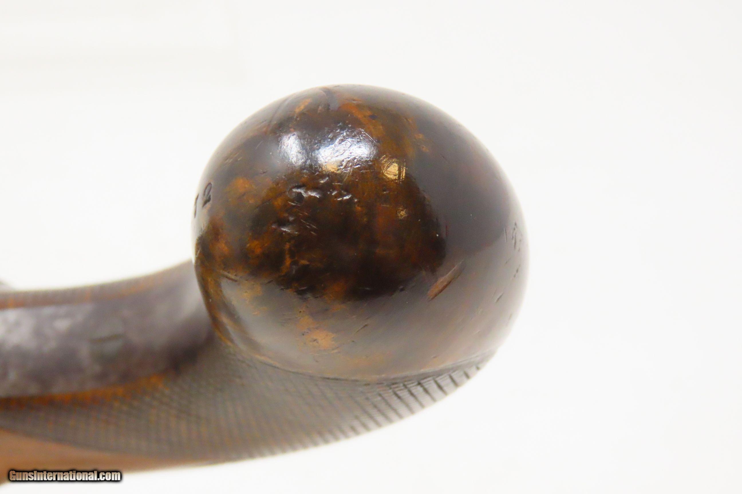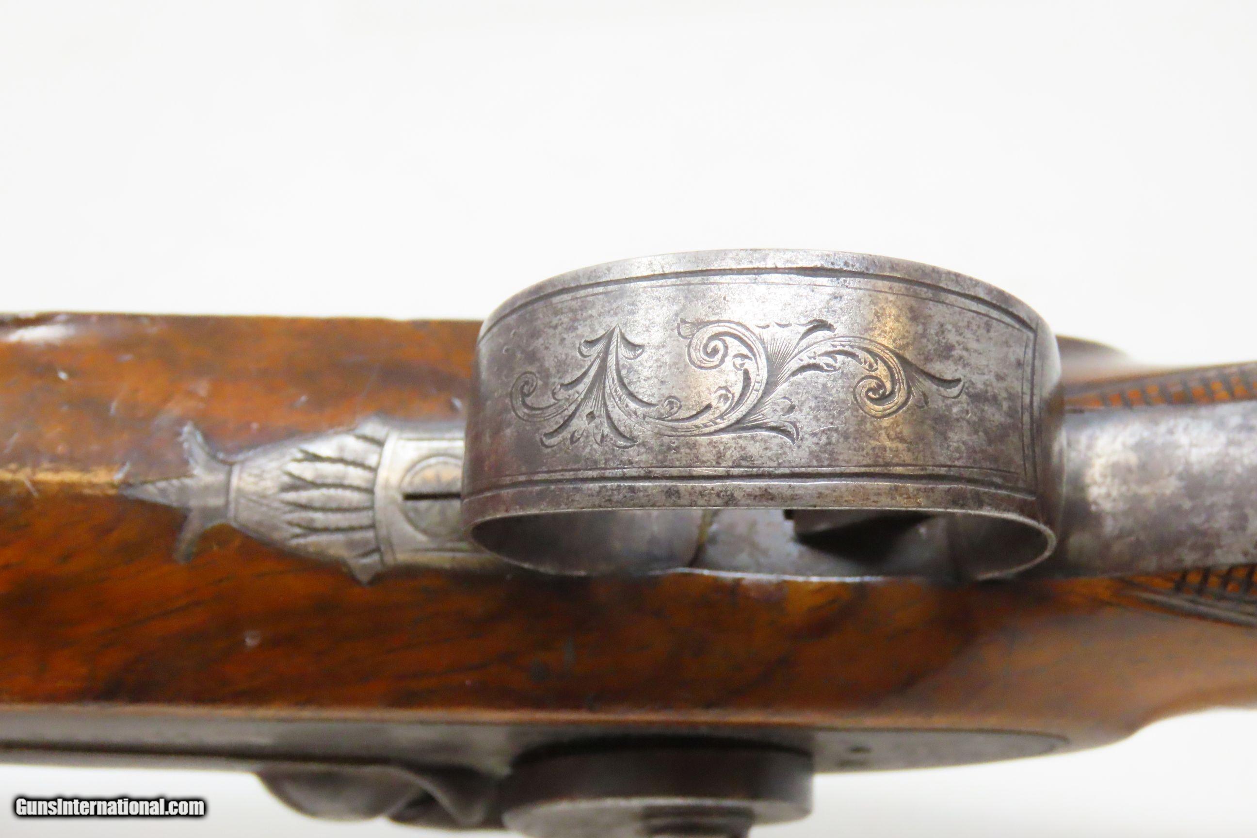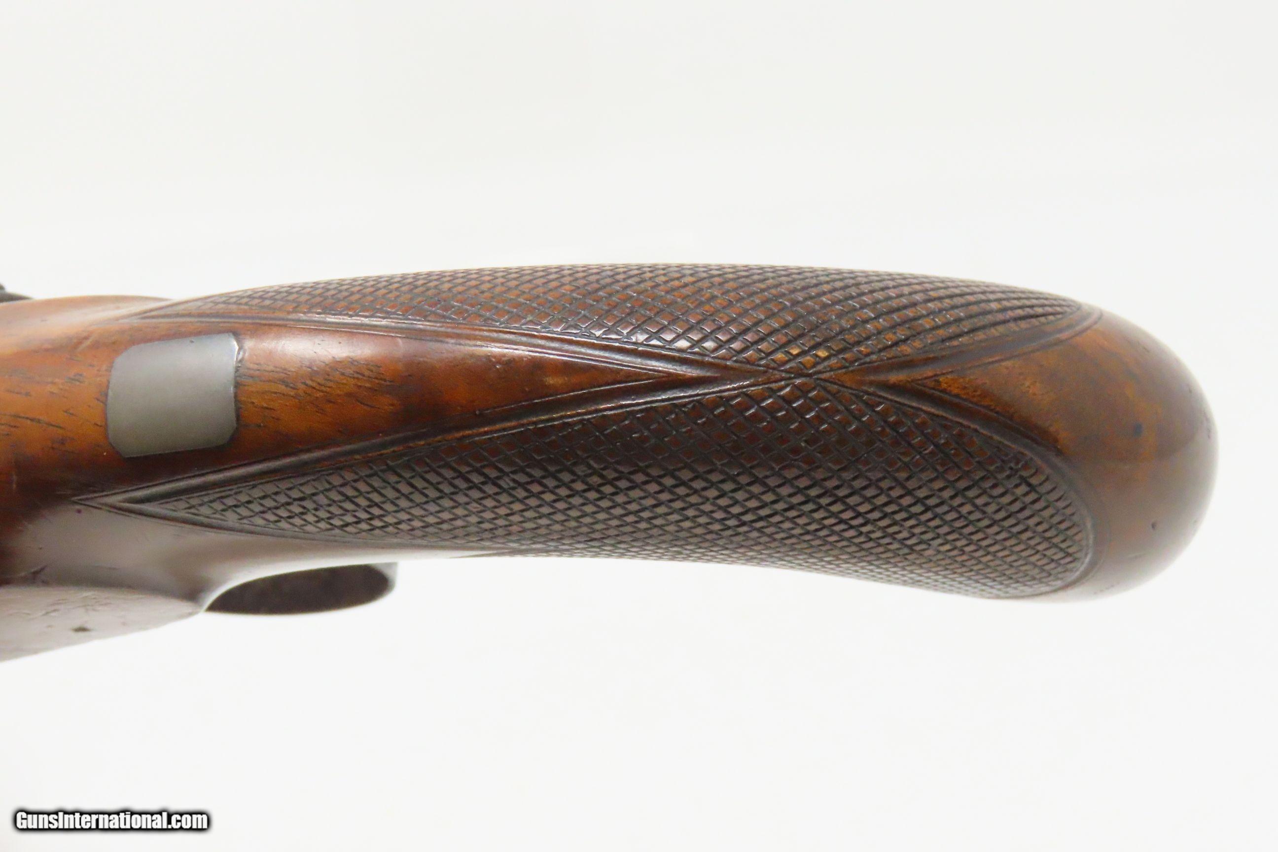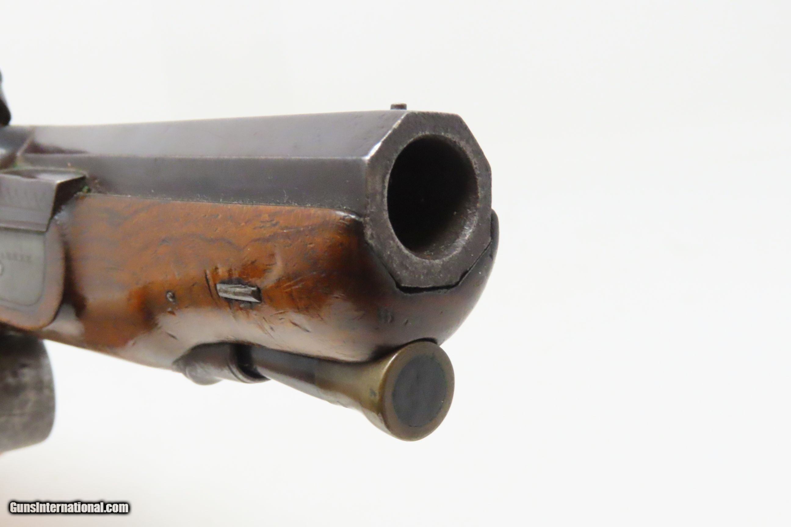Description: ENGRAVED W. PARKER Antique SIDE-HAMMER .50 Caliber PERCUSSION BELT Pistol English Pistol Made Circa the Late 1830s Here we present an antique English W. Parker Percussion Belt Pistol, made circa the mid-1800s in London, England. William Parker was a gunmaker who worked in London, England. Between 1793 to 1839, he worked out of 233 High Holborn Street, and between 1839 and 1841 at 10 Chamber Street. He was gunmaker to the Duke of Kent, Prince Edward, and William IV. He held contracts to ordnance with the East India Company and the Hudson Bay Company. He supplied arms to the London Police between 1803 and the Metropolitan Police from 1829 until he died at age 68 in 1841. His company was succeeded by Park Field and Sons. This pistol features a large .50 caliber “manstopping” bore that would have been worn on the belt or holstered as it was possibly carried into battle by a soldier purchased for himself who was wanting a backup weapon. This is a neat old pistol and one can easily imagine the sight of its gaping bore would certainly be a deterrent to would be scoundrels and would have made a stately weapon for self defense in mid-19th Century Britain. It would have felt right at home in a gentleman’s coat pocket or inside a ladies purse or muff. The overall condition is good. Strong action. The bore is in good shape for its age. Solid stock/grip overall and has retained sharp checkering. Legible markings. Nicely engraved lock, hammer, and tang. This example has been refinished. Own the original! This is a legitimate antique and not a reproduction. Barrel is 3-1/2 inches. Caliber: .50 Percussion Overall condition as seen in photos. Very Fast. Very Safe. FREE SHIPPING WORLDWIDE. Delivered directly to your door by express mail! Guaranteed AUTHENTIC & Includes CERTIFICATE OF AUTHENTICITY. ancestryguns $1500 #230099 SOLD Antique: Yes |