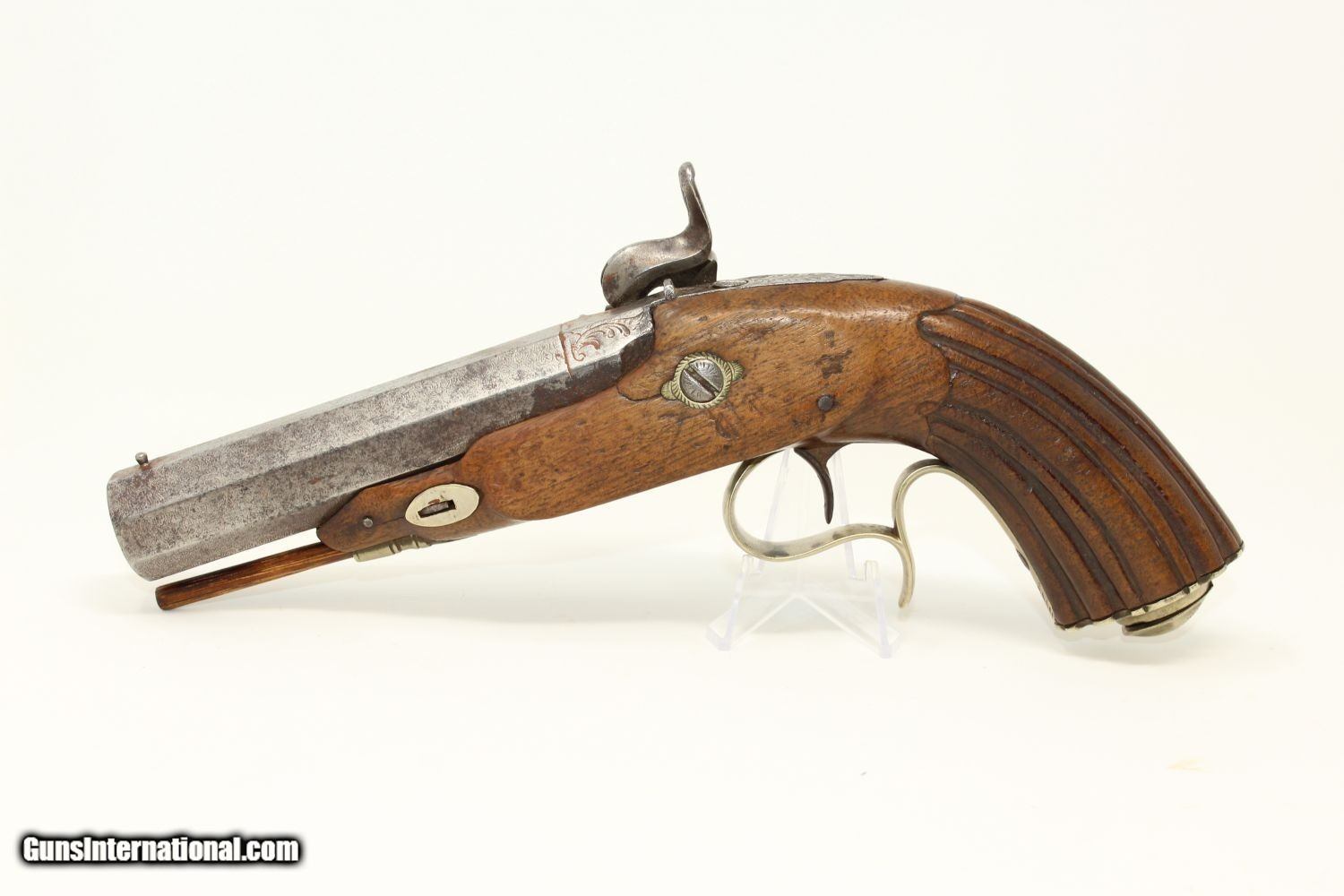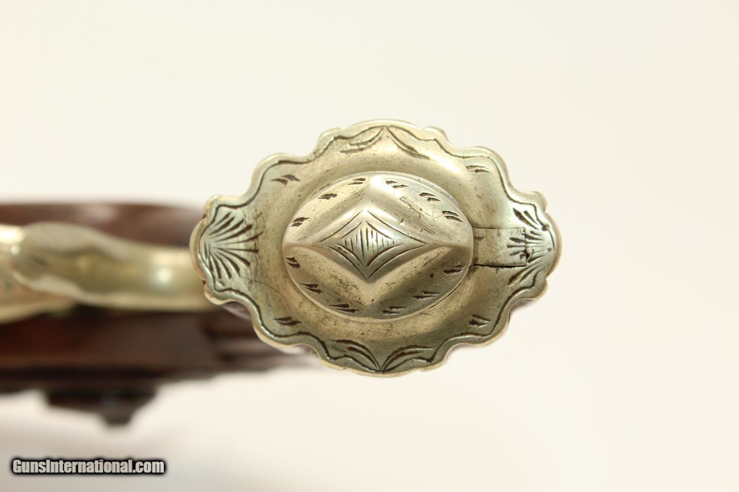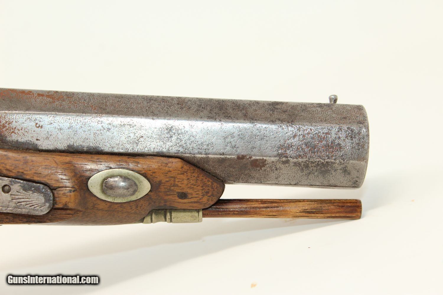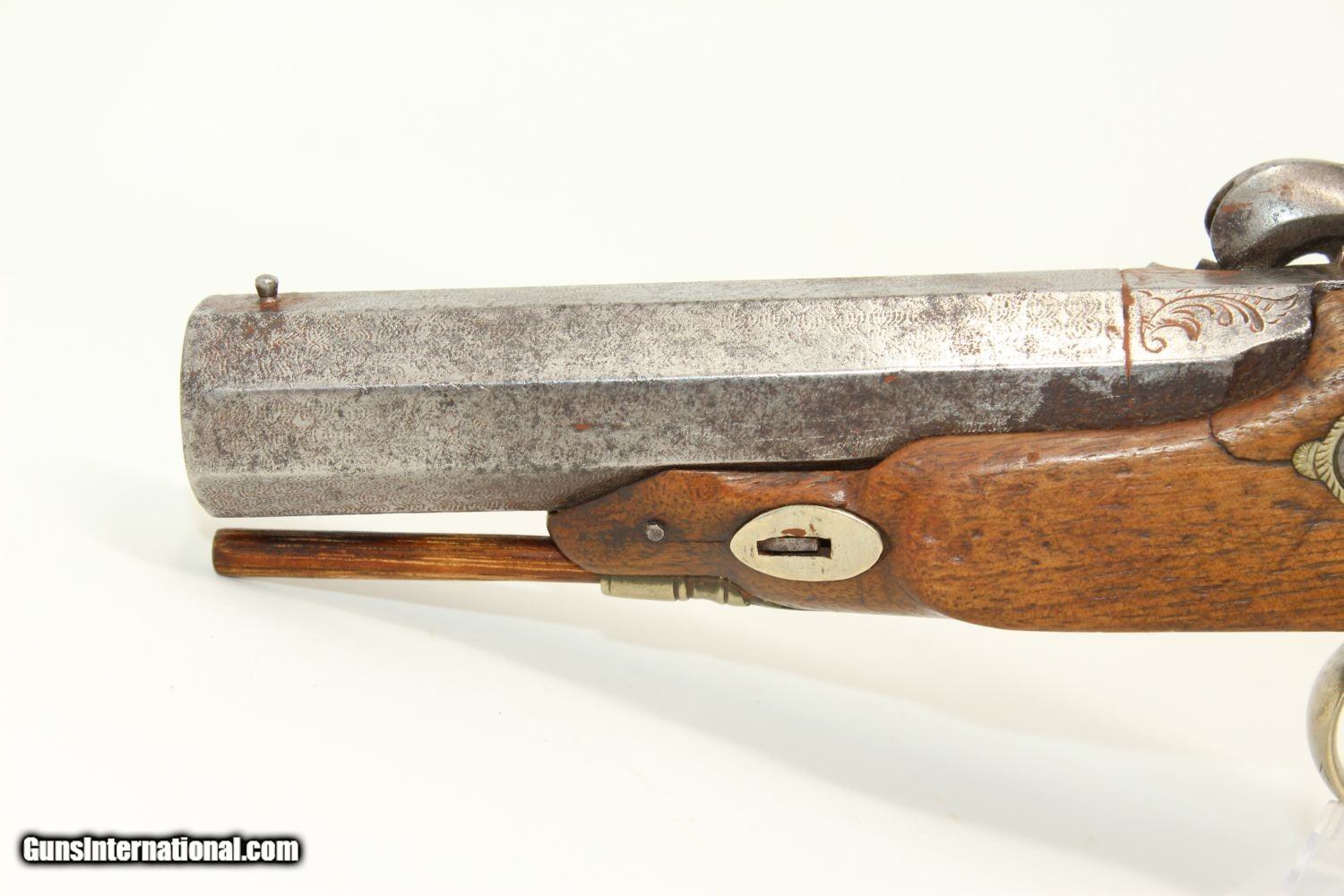 Description: EUROPEAN .70 CALIBER Antique Pistol from 1800s With Fluted Stock and Engraved Hardware Here we present an antique European Percussion Pistol, made circa 1850 in Mainland Europe. Belt-sized pistols like these were used to defend oneself when traveling or in public places. It was big enough to fight with, but not so large as to be cumbersome. They could be both as handsome or as plain as one desired or could afford. One can imagine that this pistol may have been purchased by a gentleman or a successful businessman. The trigger guard, lock, pommel and barrel are nicely engraved. German silver hardware. Fluted grip. Cap trap in the pommel. The overall condition is good. The stock lost a sliver under the lock long ago. The place is now smooth with years of use. The bore is dark with visible rifling. The action is strong. No half-cock. Own the original! This is a legitimate antique and not a reproduction. Barrel is 4-3/8 inches in length. Caliber: .70 Overall condition as seen in photos. Very Fast. Very Safe. FREE SHIPPING WORLDWIDE. Delivered directly to your door by express mail! Guaranteed AUTHENTIC & Includes CERTIFICATE OF AUTHENTICITY. ancestryguns $1100 #190412 SOLD Antique: Yes |