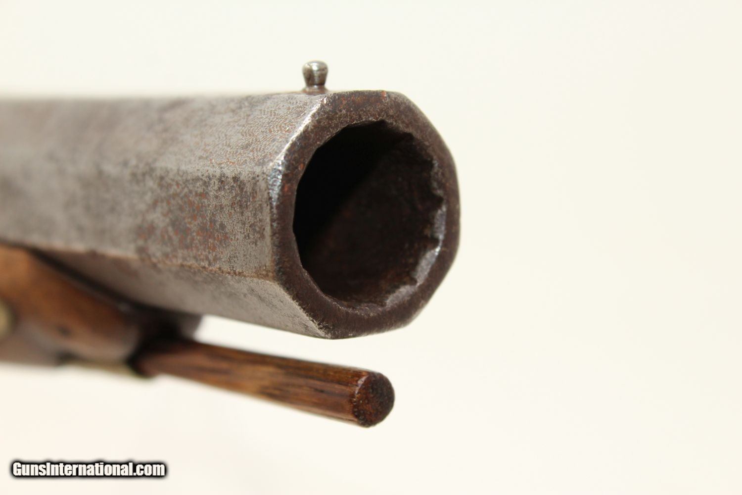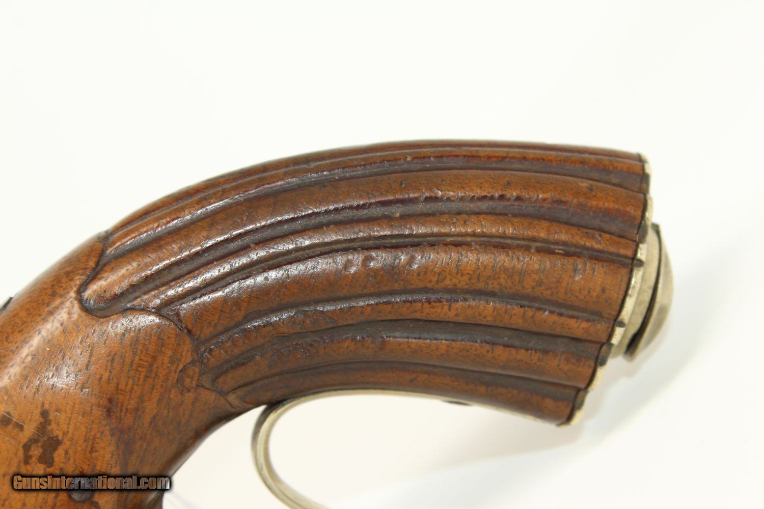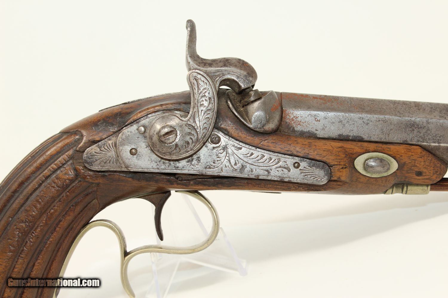 Description: EUROPEAN .70 CALIBER Antique Pistol from 1800s With Fluted Stock and Engraved Hardware Here we present an antique European Percussion Pistol, made circa 1850 in Mainland Europe. Belt-sized pistols like these were used to defend oneself when traveling or in public places. It was big enough to fight with, but not so large as to be cumbersome. They could be both as handsome or as plain as one desired or could afford. One can imagine that this pistol may have been purchased by a gentleman or a successful businessman. The trigger guard, lock, pommel and barrel are nicely engraved. German silver hardware. Fluted grip. Cap trap in the pommel. The overall condition is good. The stock lost a sliver under the lock long ago. The place is now smooth with years of use. The bore is dark with visible rifling. The action is strong. No half-cock. Own the original! This is a legitimate antique and not a reproduction. Barrel is 4-3/8 inches in length. Caliber: .70 Overall condition as seen in photos. Very Fast. Very Safe. FREE SHIPPING WORLDWIDE. Delivered directly to your door by express mail! Guaranteed AUTHENTIC & Includes CERTIFICATE OF AUTHENTICITY. ancestryguns $1100 #190412 SOLD Antique: Yes |