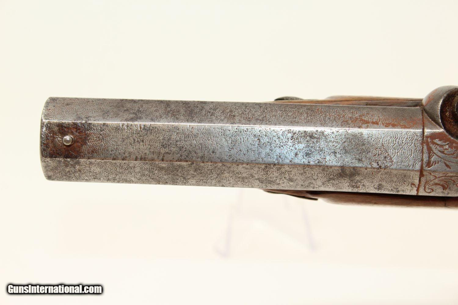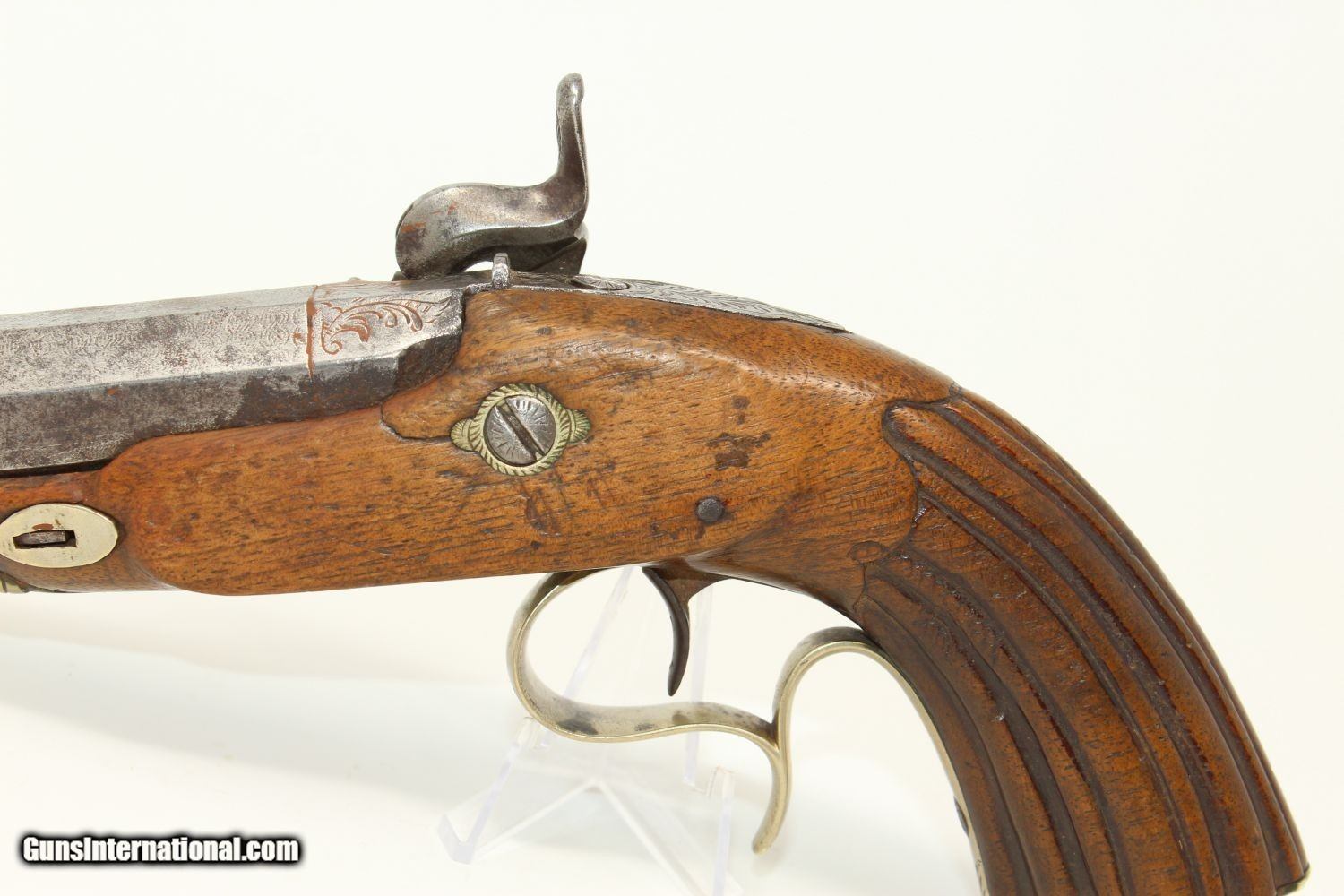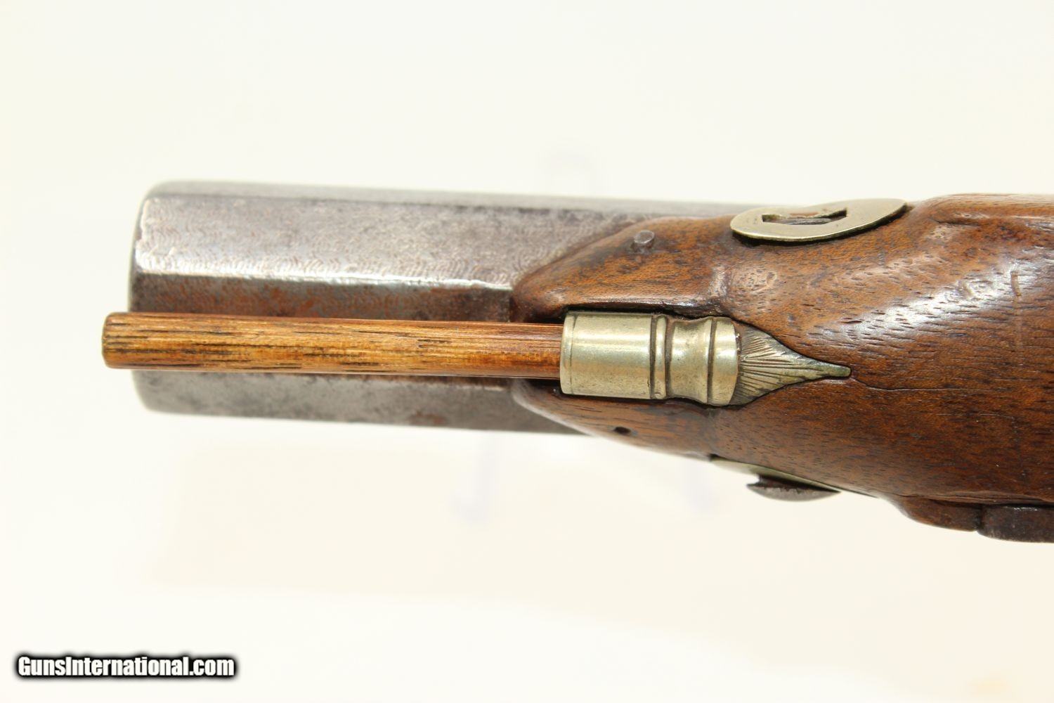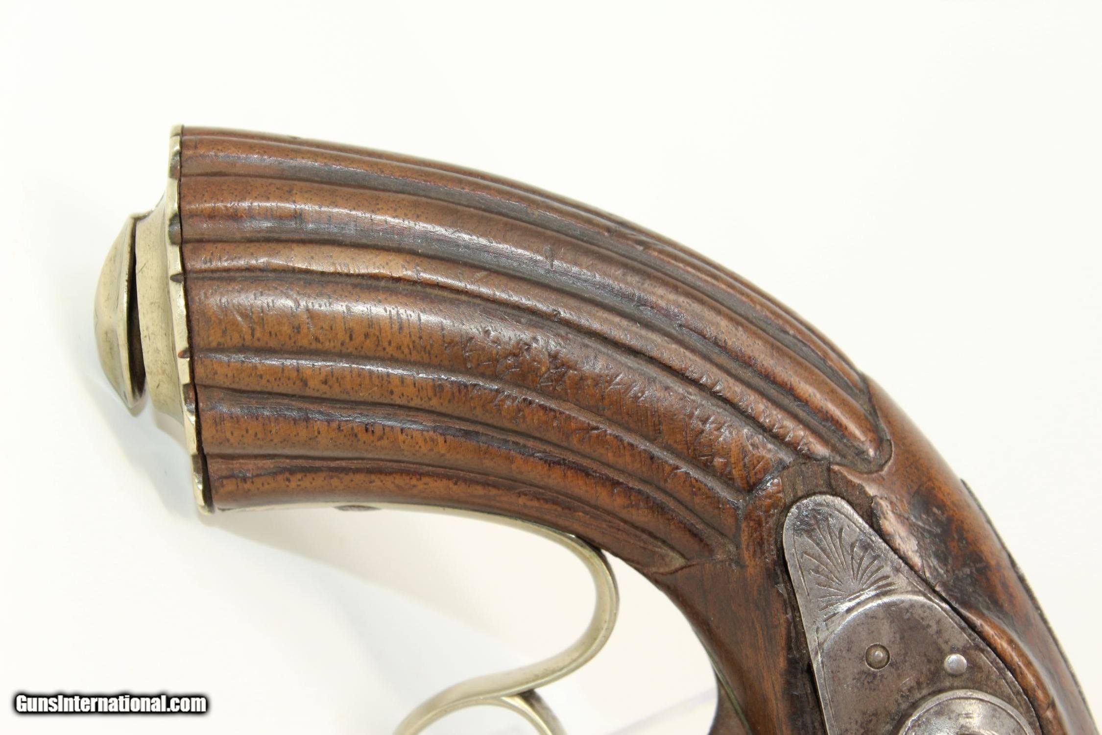 Description: EUROPEAN .70 CALIBER Antique Pistol from 1800s With Fluted Stock and Engraved Hardware Here we present an antique European Percussion Pistol, made circa 1850 in Mainland Europe. Belt-sized pistols like these were used to defend oneself when traveling or in public places. It was big enough to fight with, but not so large as to be cumbersome. They could be both as handsome or as plain as one desired or could afford. One can imagine that this pistol may have been purchased by a gentleman or a successful businessman. The trigger guard, lock, pommel and barrel are nicely engraved. German silver hardware. Fluted grip. Cap trap in the pommel. The overall condition is good. The stock lost a sliver under the lock long ago. The place is now smooth with years of use. The bore is dark with visible rifling. The action is strong. No half-cock. Own the original! This is a legitimate antique and not a reproduction. Barrel is 4-3/8 inches in length. Caliber: .70 Overall condition as seen in photos. Very Fast. Very Safe. FREE SHIPPING WORLDWIDE. Delivered directly to your door by express mail! Guaranteed AUTHENTIC & Includes CERTIFICATE OF AUTHENTICITY. ancestryguns $1100 #190412 SOLD Antique: Yes |