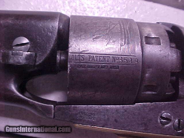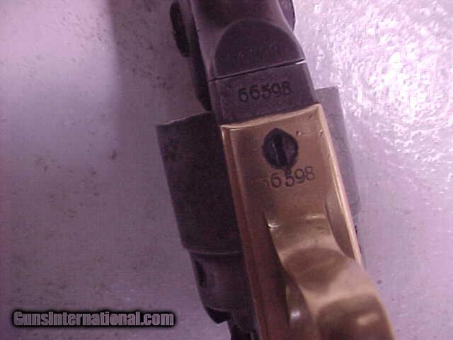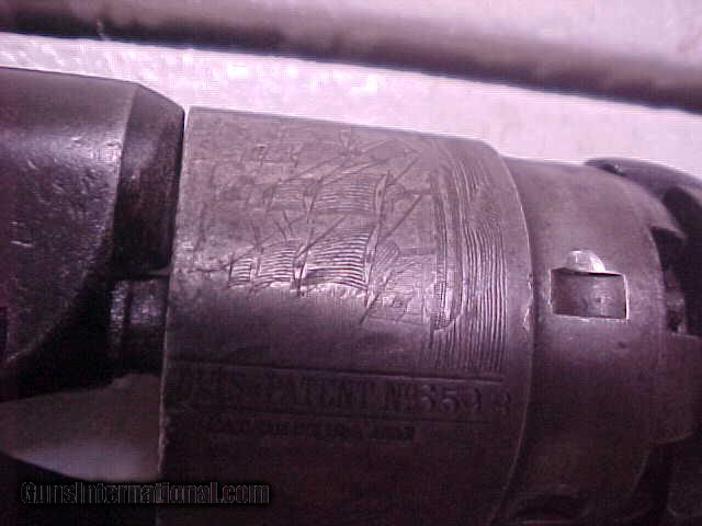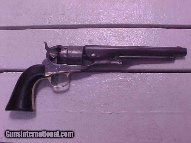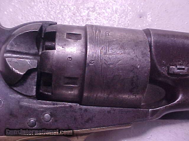 Description: A very fine Colt 1860 Army, SN 66XXX all match including arbor pin and wedge. The cylinder scene is quite extraordinary and is retained about 96%. There is a good 75% blue on the barrel and traces of case colors on the loading lever and the hammer and frame. The wooden walnut gripps are fine and avery strong cartouche on the left side, believed to be Ainsworth who customarily only stamped one grip. All subinspectors initials are present. The bore is excellent with strong rifling. Mechanically tight and indexes well.REDUCED!! SOLD Antique: Yes |