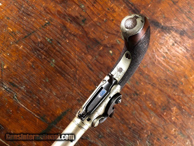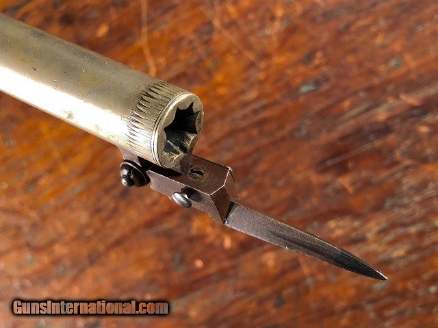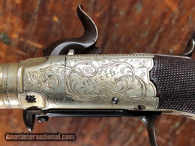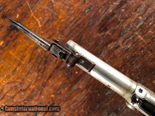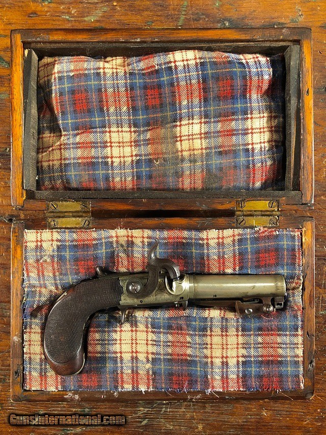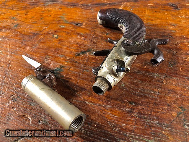 Description: Rare & Exceptional Solid Silver Merry Engraved English Percussion Folding Trigger/Folding Dirk Screw Barrel Pocket Pistol with Case, .36 Cal, mfg. circa 1835. This is an absolute gem of a gun. It is a highly unusual configuration in excellent original condition. The pistol measures 6 3/4" long overall (8 5/8" with dirk open) and features a 2 1/2" screw barrel which unthreads for loading from the breech. The frame and barrel are solid Nickel Silver and are both Birmingham proofed with the maker's name "Merry" inscribed opposite the hammer. The silver has a pleasing dulled luster while the iron components show a dark plum/blue patina. Bright original fire blued nipple with traces of fire bluing visible on the trigger. The gun is profusely engraved throughout. Checkered wood grip remains sharp with no cracks or chips and is fitted with a Nickel Silver shield escutcheon and buttcap with iron compartment door. The folding snap bayonet/dirk measures 2 3/8" long featuring a 1 3/8" triangular blade. It is released by a sliding lever under the frame and snaps out blindingly fast. The action is crisp and functions perfectly incorporating both a manual half cock safety and sliding external safety. The trigger drops down properly when cocked and clicks back up into the frame with just a little manual assistance. The pistol is housed in an attractive period cloth lined wood case. I can't recall us ever having a pistol with so many unique features let alone in such wonderful shape. A really choice little gun with tons of WOW factor! Jeremiah Johnson Trading sells antique firearms manufactured prior to 1899 and muzzleloading blackpowder reproductions only. For the purpose of these conditions the term "antique firearm" will hence include muzzleloading blackpowder reproductions. Buyers must be 21 years of age or older and have no felony convictions to purchase antique firearms. Antique firearms do not require Federal licensing and may be shipped directly to the buyer with the following exceptions. No antique firearms will be shipped to Washington D. C. or any of the five boroughs of New York City (or residents thereof). Some restrictions may apply to antique firearms shipped to California and will be noted in the item description if applicable. Any handgun (antique or muzzleloading blackpowder reproduction) shipped to New Jersey must ship to a licensed FFL holder. Any muzzleloading blackpowder reproduction rifle, shotgun, or handgun shipped to Illinois must ship to an FFL holder. No international sales of antique firearms which may fire conventional metallic cartridges or any reproductions regardless of ignition. Antique muzzleloaders, or antiques which fire obsolete cartridges, may be shipped internationally however it is the responsibility of the buyer to know and abide by their local laws and provide proof that the antique arm is legal to receive and own. Payment can be made by money order, banker's check, personal check, or credit card (no fees). Please allow 7-10 business days for clearance on personal checks. If paying by credit card please call us directly to process your order. If not satisfied with an item within 3 days of receiving it, simply return the item in the same condition as shipped for a full refund, minus return shipping costs. Cleaning, disassembly, or altering of a firearm in any way will void inspection privileges. Layaway may be allowed upon negotiation, but will void inspection privileges. Buyer pays actual shipping & insurance costs. Occasionally a post-1898 firearm from my personal collection may be sold under this account however it will be noted that any such transaction is a personal sale in no way affiliated with our business. Any such arm will be shipped to a licensed FFL or C&R holder in accordance with Federal law. All firearms are sold as collector's items and are not warranted safe for shooting. Please consult a competent gunsmith prior to shooting any firearm. Message or call with any questions about this firearm, or any of our other items at 860-873-1092 (office) or 860-345-2100 (shop). SOLD Antique: Yes Handgun Caliber: .36 Manufacturer: Merry Barrel Length: 2 1/2 Triggers: Folding Finish: Solid Nickel Silver Manufacture Date: Circa 1835 Engraving: Yes Extras: Snap Bayonet/Dirk Case: Yes |