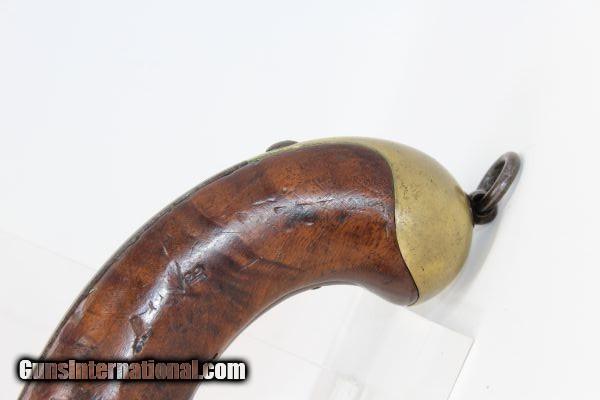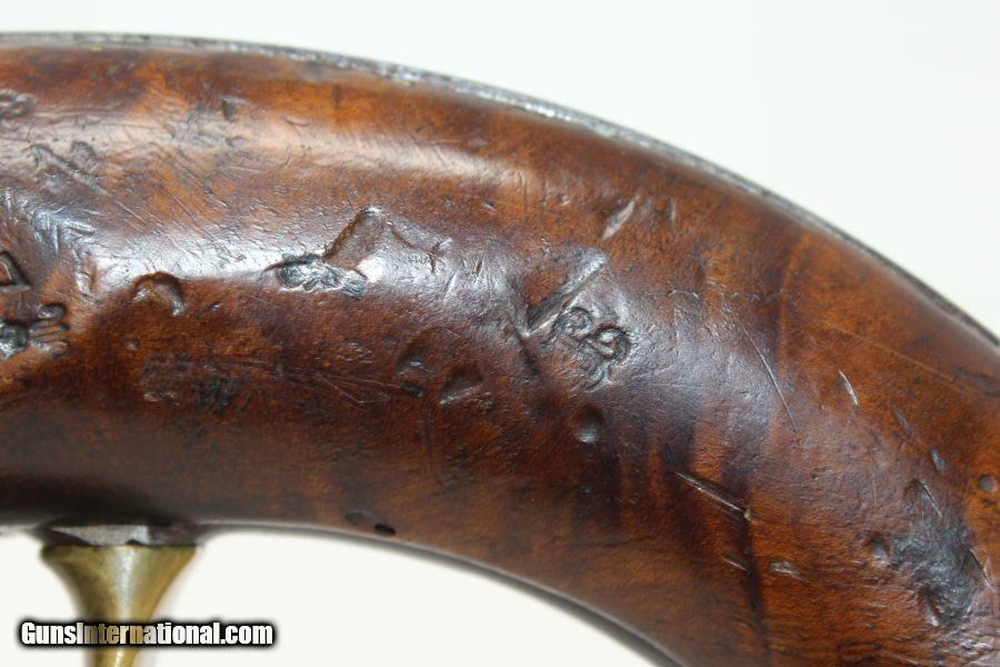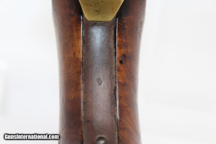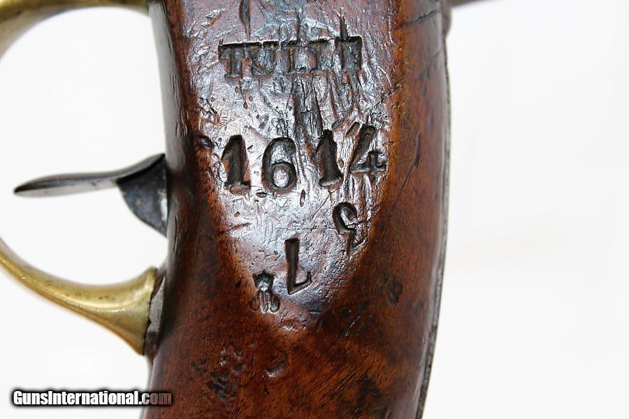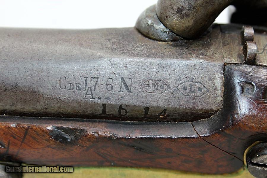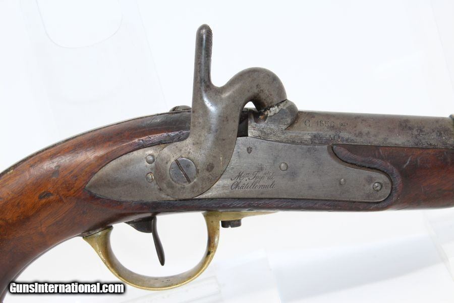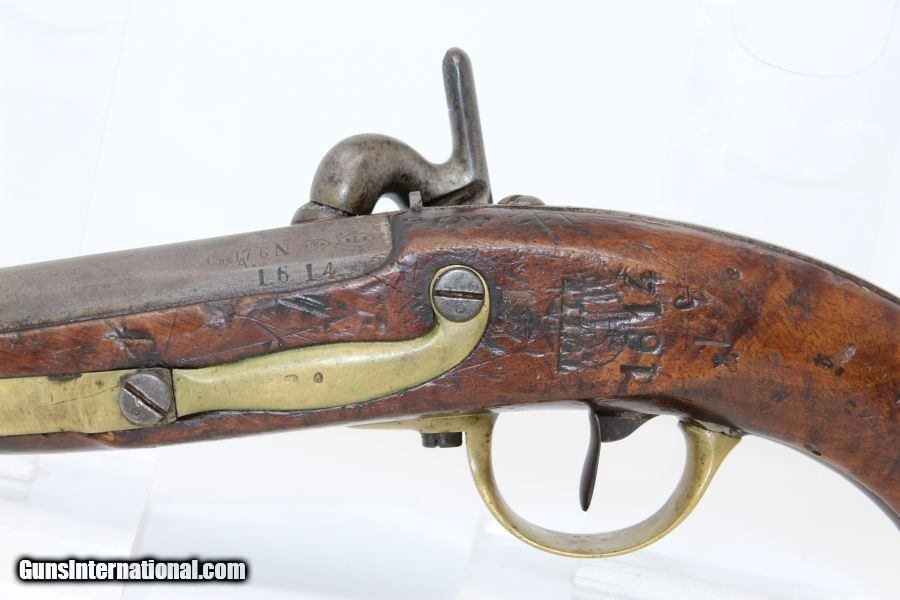 Description: FRENCH Antique Model 1822 T-Bis MILITARY Pistol French Proofed & “1856” Dated Here we present an antique French Model 1822 T-Bis Military Pistol, made circa 1856 at the armory at Chatellerault. The arsenal produced arms such as swords from medieval times to 1816, when it became a primary French firearms production facility. It produced arms all the way through the World Wars and finally closed in 1968.This pistol was built new in the percussion format, while many of its predecessors had been built as flintlocks before being converted to percussion. It was used by cavalry and marines alike. This pistol is very likely to have seen action in any of France’s many colonies during this period. Other significant conflicts include the Second French Intervention in Mexico as well as the Franco-Prussian War. The pistol is of robust construction with lots of brass for support. The bore is a substantial .69 caliber. The brass pommel cap is equipped with a lanyard ring. The markings on this pistol are plentiful. The lock is marked “Mre. Impale. de/Chatellerault”. The barrel is dated “C 1856”. The left side of the barrel is proof marked “C de 17-6 N” & “M” and “L”. Multiple other proof and acceptance marks can be found throughout. The barrel tang is marked “Mle. 1822 T Bis”. The number “1614” is an assembly number found throughout. The left side of the stock is marked “TULLE”, another French arsenal, so this one went back at some point for repair or refurbishment. The overall condition is good. The metal surfaces have a gray patina. The markings are clear. The stock shows much use and remains solid. The bore is in good shape with clear rifling. The action is strong. The percussion nipple was broken off long ago and some old solder remains where someone tried to fasten something. Overall, a neat piece of history! Own the original! This is a legitimate antique and not a reproduction. Barrel is 8 inches. Caliber: .69 Overall condition as seen in photos. Very Fast. Very Safe. FREE SHIPPING WORLDWIDE. Delivered directly to your door by express mail! Guaranteed AUTHENTIC & Includes CERTIFICATE OF AUTHENTICITY. ancestryguns $850 #8067 SOLD Antique: Yes |