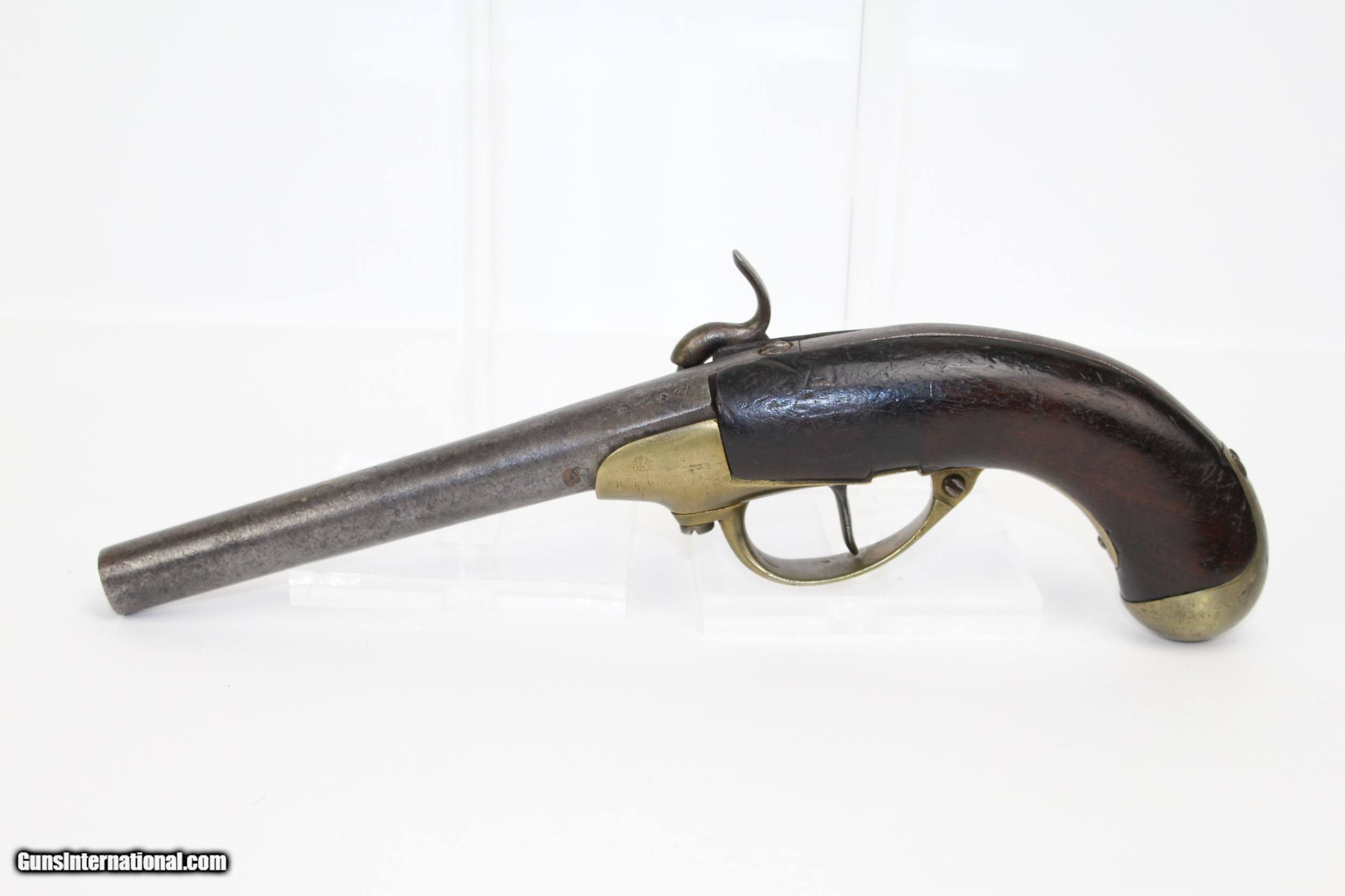 Description: FRENCH Antique ST. ETIENNE 1777 Pistol REVOLUTIONARY WAR Dated “1779”! Here we present an antique French Model 1777 Pistol, originally made as a flintlock at the armory at St. Etienne in 1779. The Model 1777 is historically significant to the American Revolutionary War, as the French recognized the United States of America’s independence and sovereignty in 1778 and declared war on Britain as the fledgling nation’s ally. The French had begun sending arms and supplies in 1775, but secretly. With their new alliance, France provided the U.S. with loans, arms and even troops to fight on U.S. soil. Both French and American troops were armed with these pistols during the war. After the American Revolution, the first U.S. martial pistol made and officially adopted in America was the incredibly scarce Model 1799, made by Simeon North & Elisha Cheney. The Model 1799 was patterned very closely to the Model 1777, with only a few changes. Only 2,000 1799s were made, making them incredibly rare and very expensive, valued in the tens of thousands. Finally, the Model 1777 is also historically significant to the French. At the time of this particular pistol’s making, in 1785, King Louis XVI was on the throne. In 1789, the French Revolution began and chaos ensued for the next 10 years, characterized by insurrections, mob violence, execution and assassination. King Louis XVI was executed in 1793. Simultaneously, France was at war with much of Europe. Eventually, Napoleon Bonaparte rose out of the ranks through coup and became emperor. This Model 1777, as noted above, is dated “(17)79” on the barrel and “1779” on the right side of the wooden grip, during the Revolutionary War. It was made at the arsenal at St. Etienne as marked on the frame under the hammer. In 1779 this pistol would have had a flintlock firing system, however, percussion ignition technology was a vast improvement in many ways and flintlocks were commonly updated to give longer service life. This is one such example. The overall condition is very good. The metal surfaces have a dark patina. The markings are clear. The wooden grip shows a good amount of wear owing to a long service life. The bore is dark. The action is strong and crisp. Here is a great example of a historical pistol! Own the original! This is a legitimate antique and not a reproduction. Barrel is round and 7-3/8 inches in length. Caliber: .69 Percussion Overall condition as seen in photos. Very Fast. Very Safe. FREE SHIPPING WORLDWIDE. Delivered directly to your door by express mail! Guaranteed AUTHENTIC & Includes CERTIFICATE OF AUTHENTICITY. ancestryguns $3150 #7145 SOLD Antique: Yes |