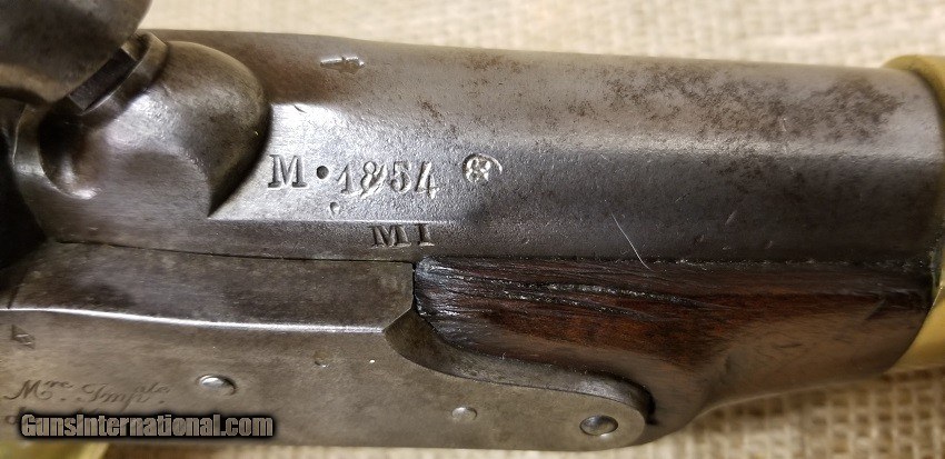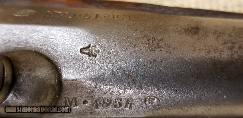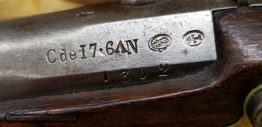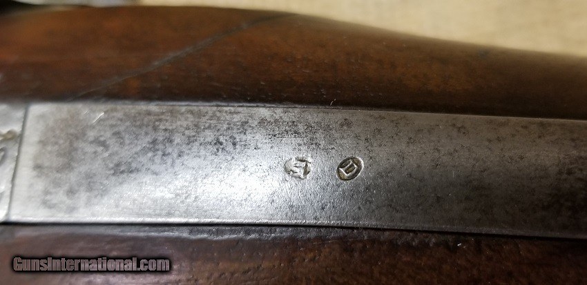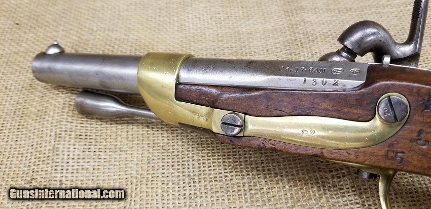 Description: French Model 1822, .69 caliber round barrel 7 3/4 inches long, overall length is 13 3/4 inches, octagonal at the breach, serial number 1302, tang marked "Mle 1822 T Bis", breach marked "C de 17.6AN", converted from flintlock to percussion in 1854, lockplate marked "Mre. Imp ale de Mutzig", marked Mutzig on walnut stock, checkered hammer, fixed front and rear sights, arsenal proofs on brass, iron and wood throughout, complete with iron tulip end ramrod, lanyard ring, two stage action is in good working order. SOLD Antique: Yes |