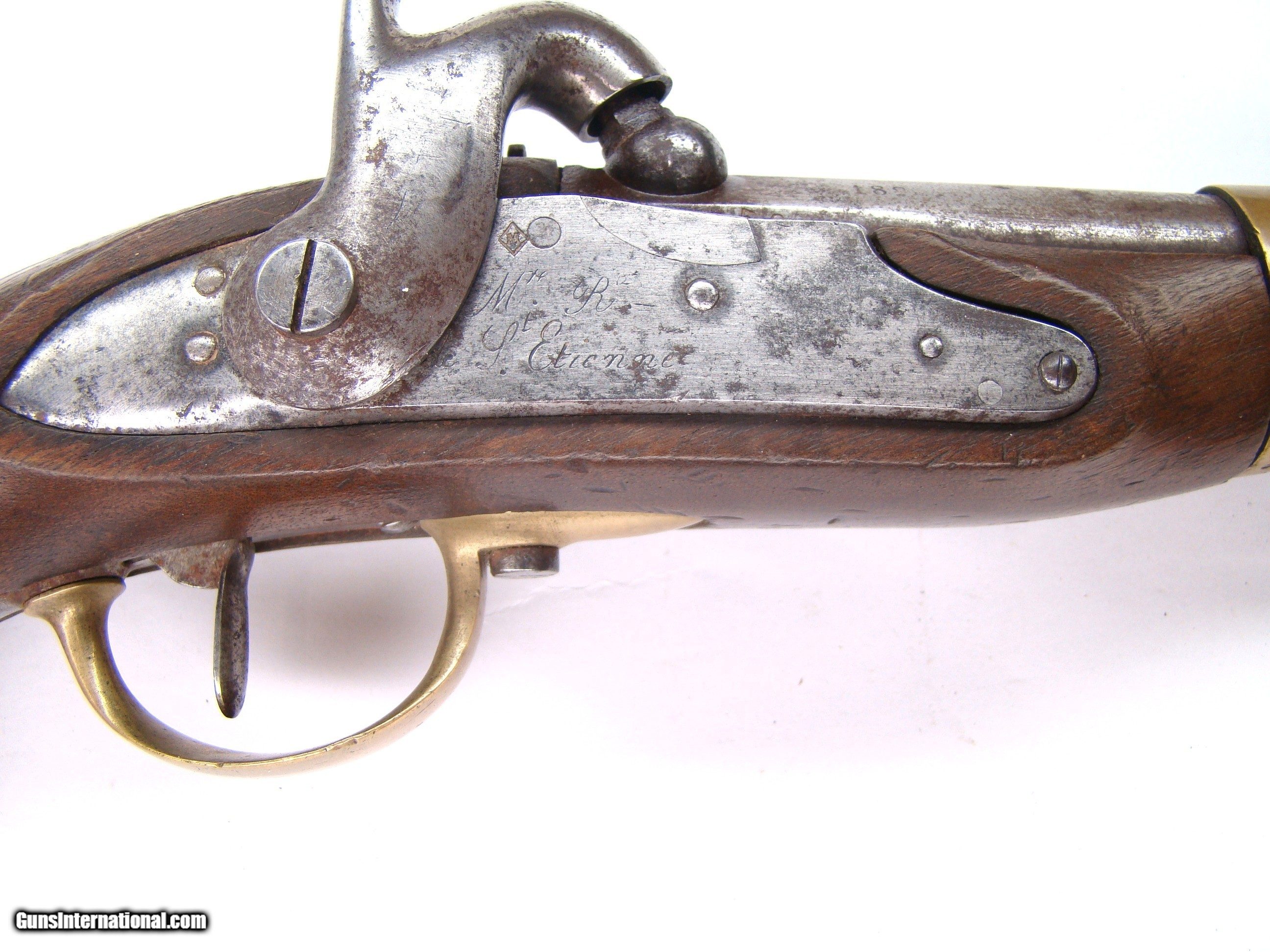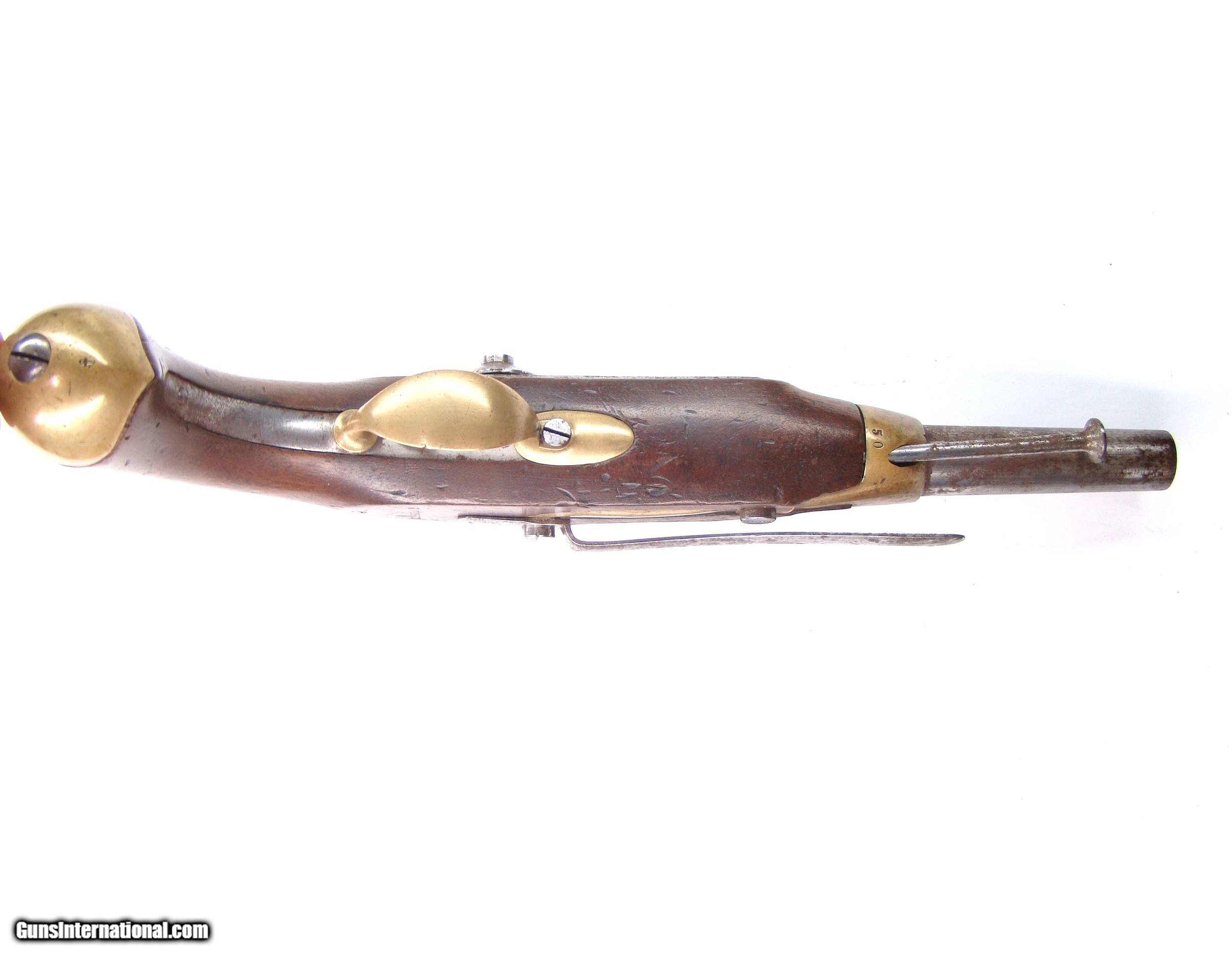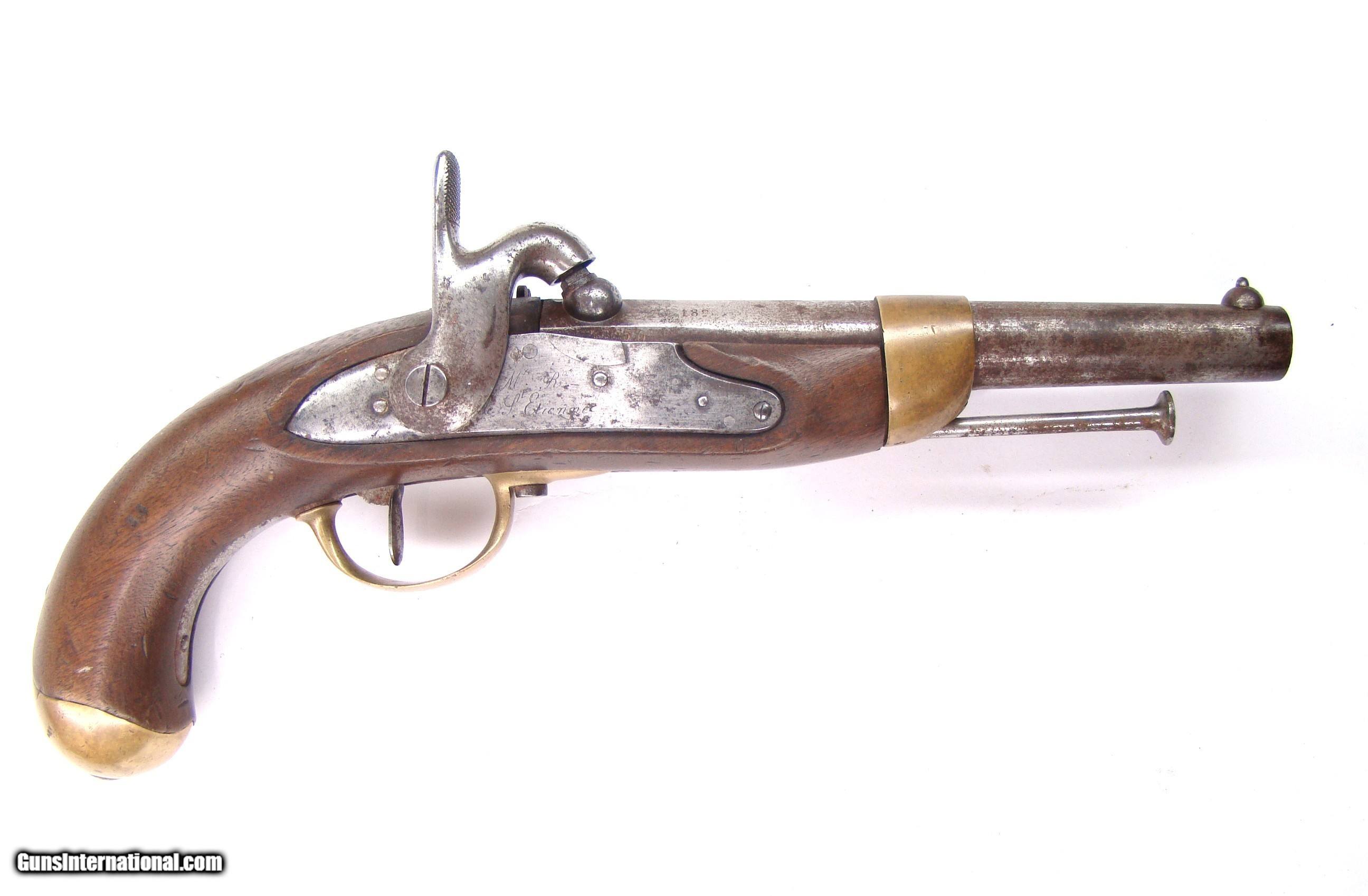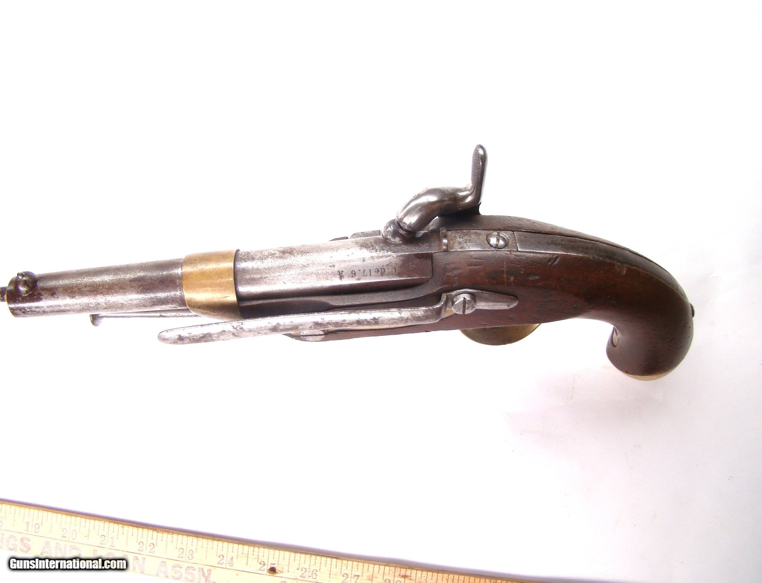 Description: French Naval Percussion Pistol with belt hook conversion from flint 1822 dated Mech Exc, Wood is near Exc has a couple small dings. .Has a 72 cal rifled bore Exc ,8” long with original sights and marked 1822 in a couple places. The lockplate has markings M R and St Etienne. The left side has the belt hook. The wood is near exc with E.Pinet marked on the left side. There is a anchor marking on the brass buttcap and several other proofs. Has an original ramrod. Metal overall has an aged grey brown patina finish with traces of some very fine pitting mainly on the ramrod. The barrel ,endcap and wood are stamped 50 . Antique: Yes Price: $995.00 Contact Seller |