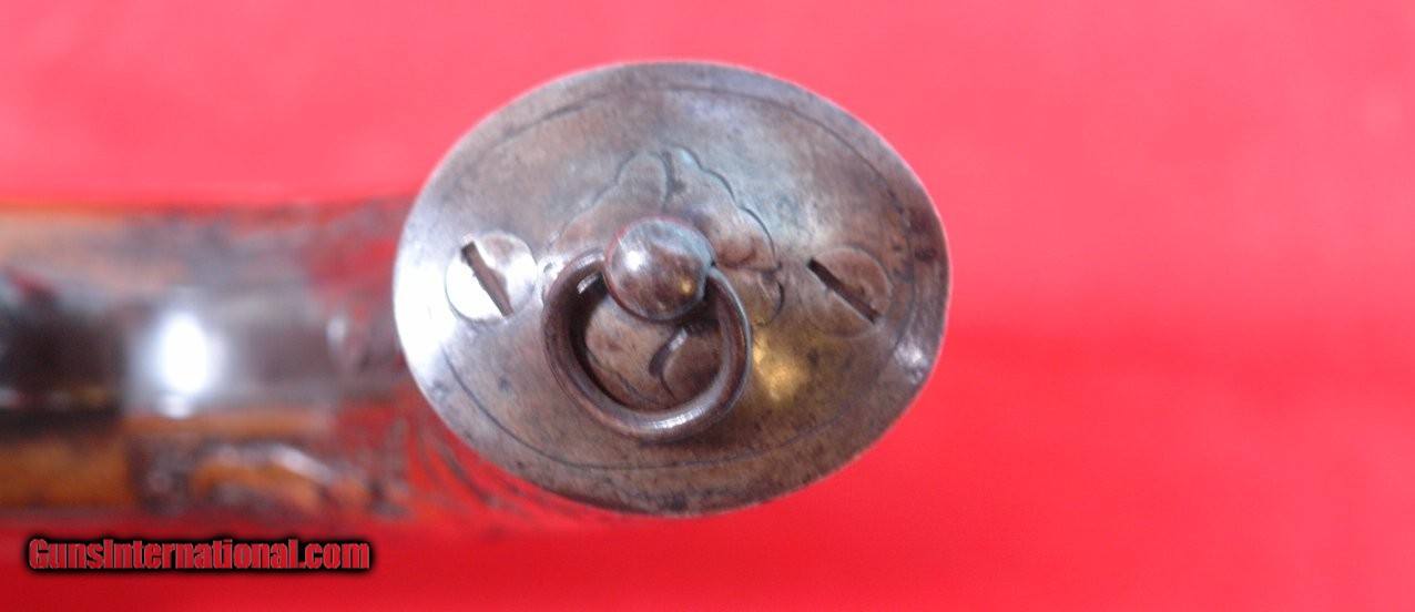 Description: 32674-FRENCH PERCUSSION DOUBLE BARREL .70 CALIBER OFFICER’S PISTOL CIRCA 1840’S-50’S. 14”overall with 7.5 inch .70 caliber Damascus barrels. Walnut stock with floral carved grip and steel pistol grip cap with lanyard ring. Engraved locks and hammers. Double triggers. Floral engraved trigger guard. Steel button head ramrod. Very good plus to fine overall and all original with exception of barrel wedge which is a replacement. Locks in working order and good bores. Very handsome. $650. Antique: Yes Price: $650.00 Contact Seller |