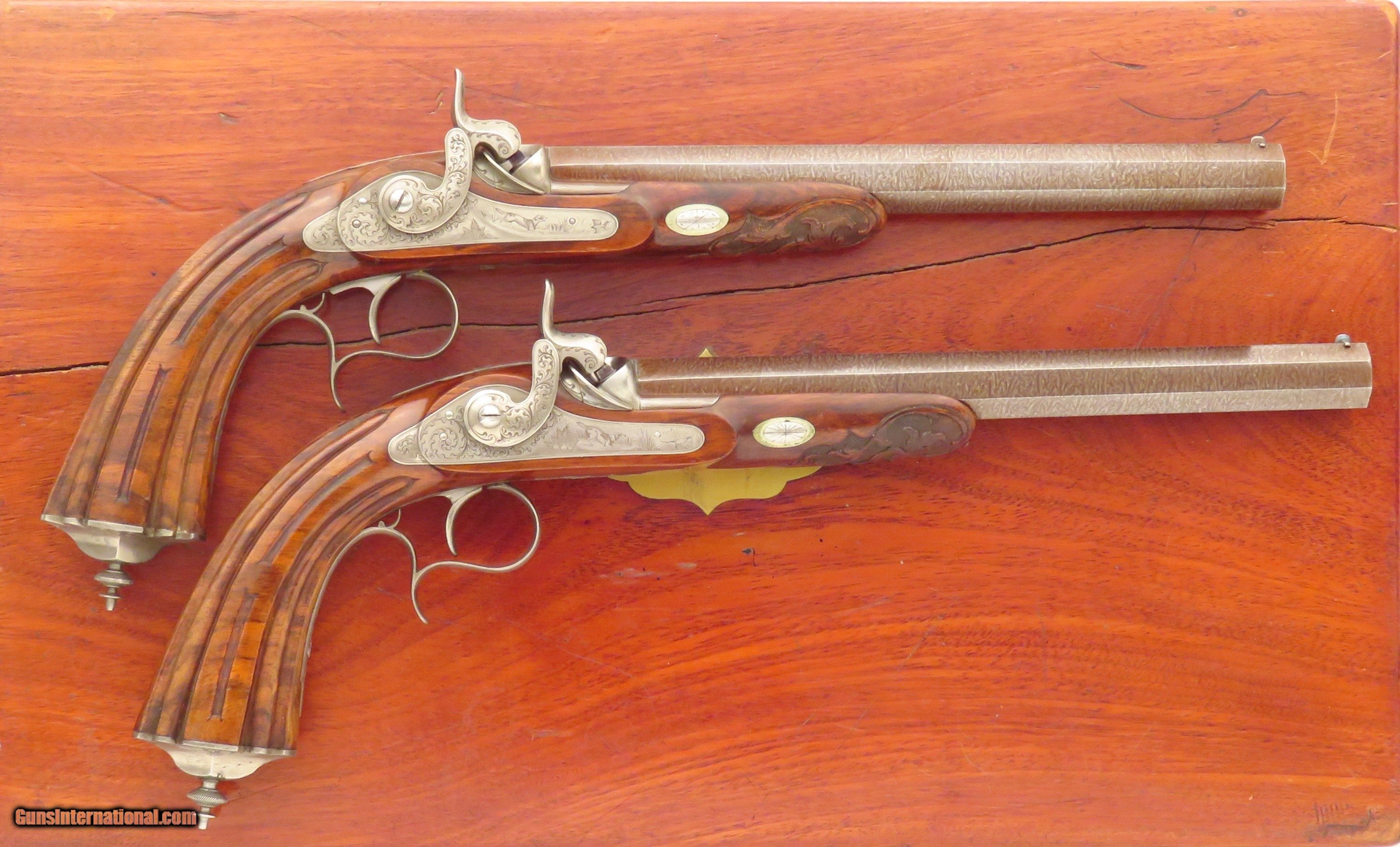 Game scene engraved pair of percussion target pistols, .495-inch bore diameter, high condition, cased, layaway
