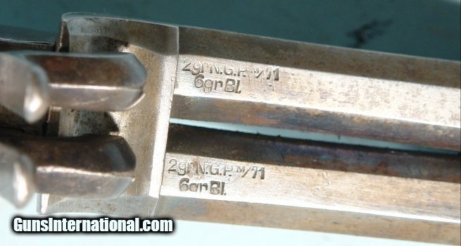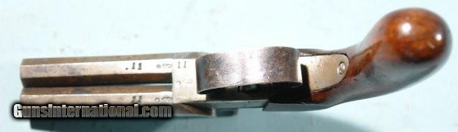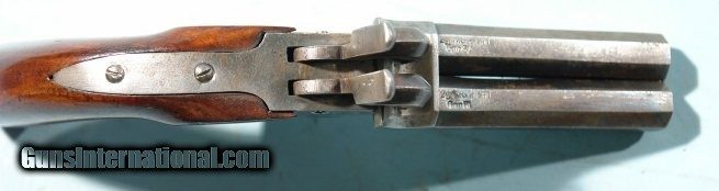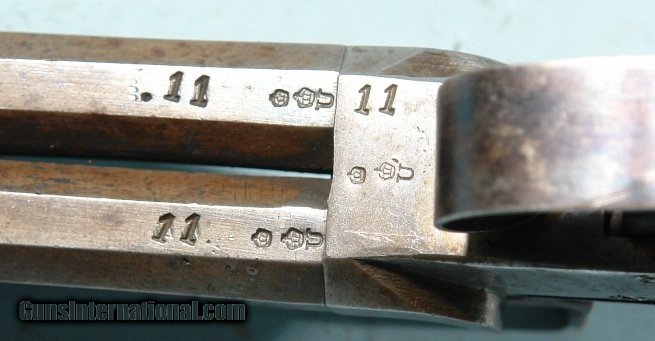 Description: GERMAN PERCUSSION DOUBLE BARREL BOXLOCK POCKET PISTOL CA. MID TO LATE 1800’S. 9” o/a with 3” octagon .40 cal. smoothbore barrels with German proofs at both the underside and topside of the breeches. Bag shaped walnut grip. Very good to fine all original condition with minor amounts of original blue. Grip with all the original finish. Superior working condition and excellent bores. Far above the condition usually encountered in this popular model which was exported widely during the 1800’s and even into the early 1900’s. SOLD Antique: Yes |