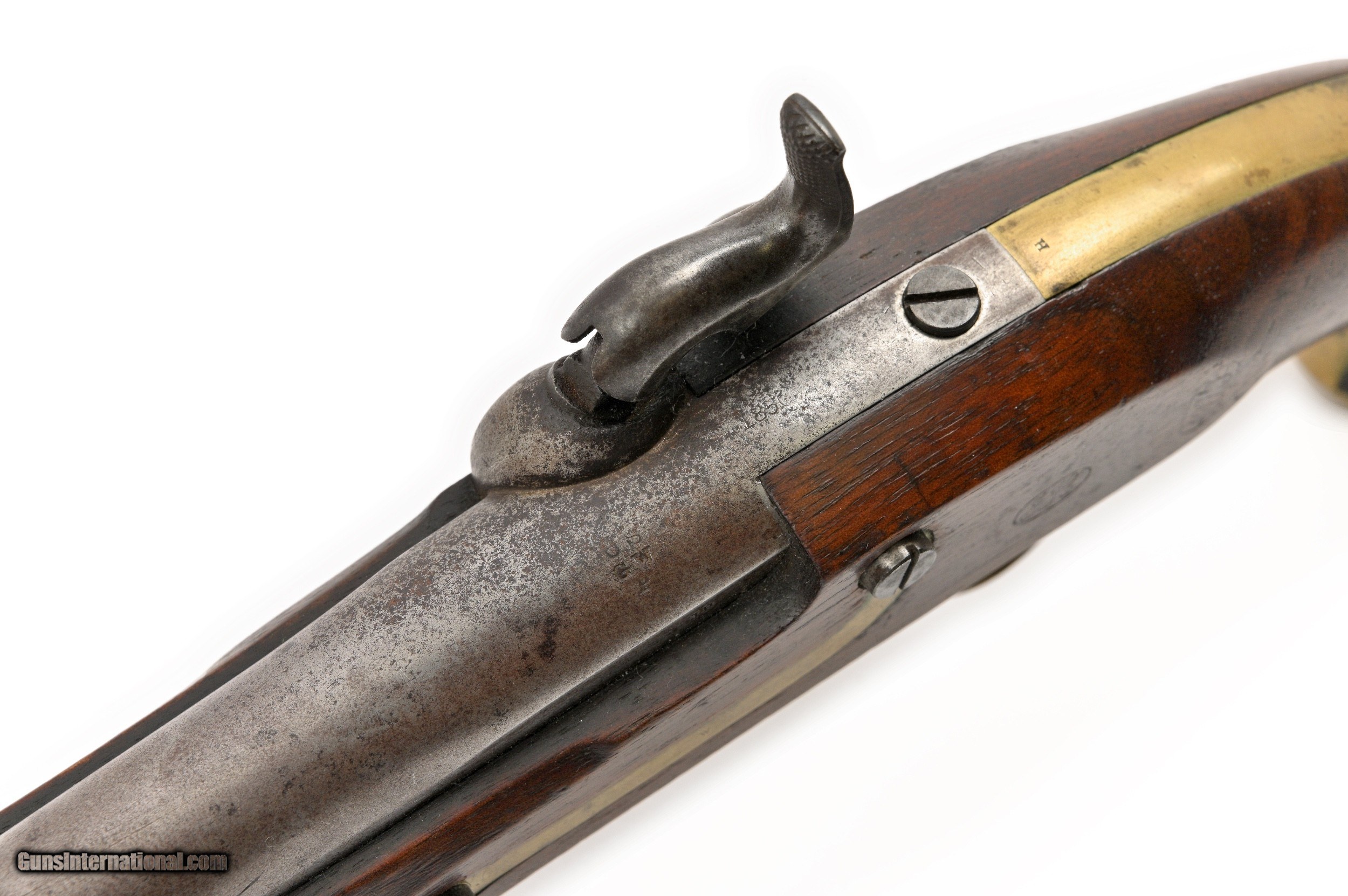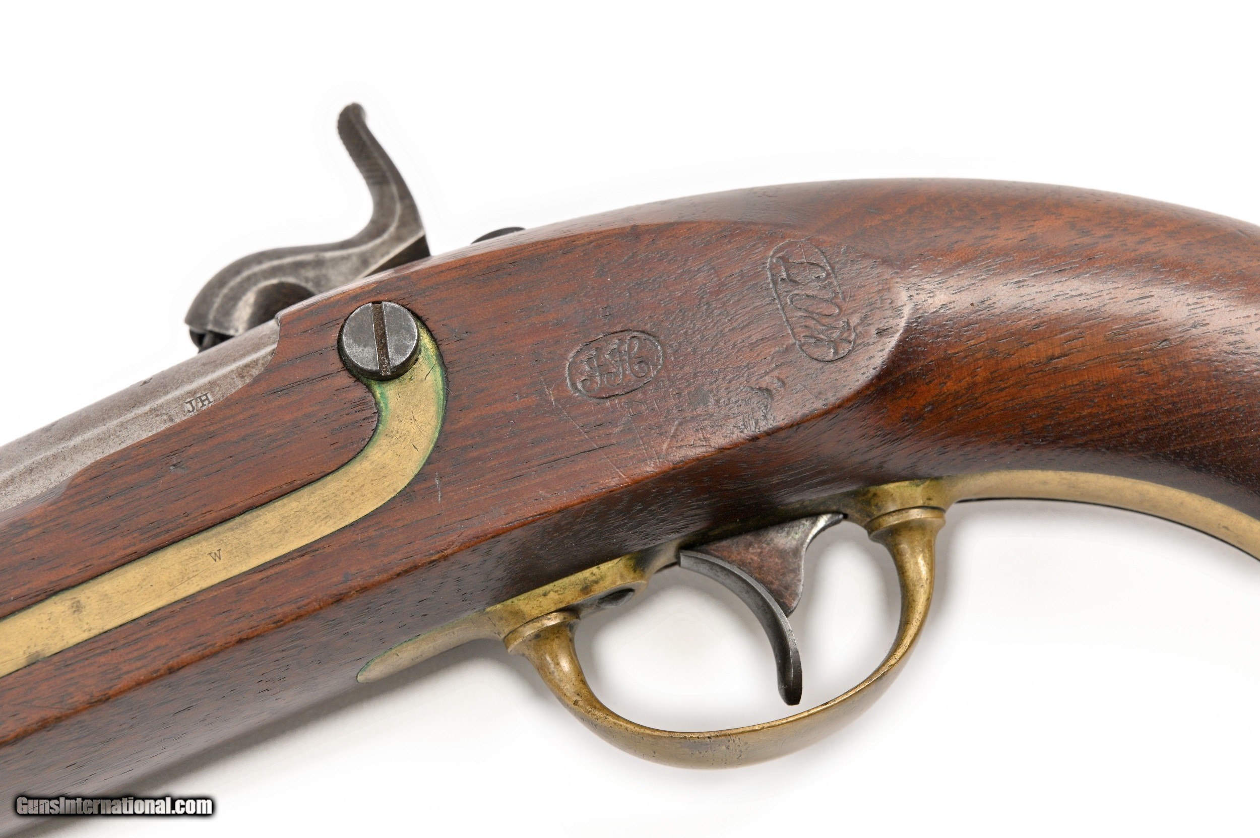 Description: An above average example of an 1842 U.S. martial, single shot, smoothbore, percussion “horse” pistol. It is stamped “U.S. H. ASTON” on the lock plate, just in front of the hammer, and ” MIDD TN CONN 1850? vertically, behind the hammer. The walnut stock is clearly marked with two cartouches stamped in the left side. Several parts are stamped with inspector’s initials, including the barrel lug, which is also dated “1850”. It still retains its original captured, swivel type, iron ramrod. Caliber: .54 percussion Overall Length: 14.30? Barrel Length: 8.50? Condition: Iron parts are a grey age patina with some spotting, and light pitting, especially at the breech area – Brass furniture has a medium mustard color age patina – Stock is excellent with no cracks and strong cartouches – Action is crisp – Bore is good. SOLD Antique: Yes |