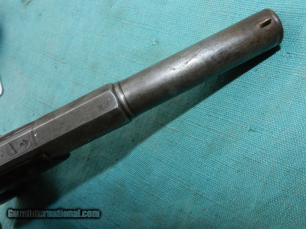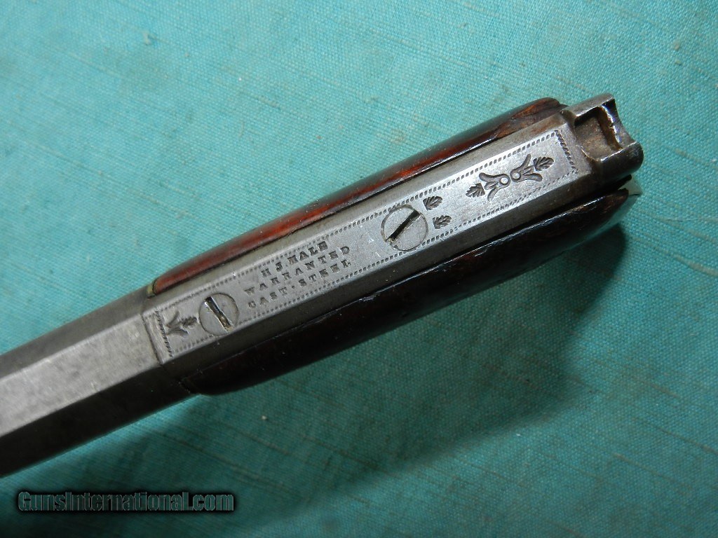 Description: <<<<SOLD>>>>> A very fine condition rare maker of an 1830's underhammer pistol this H.J. Hale is very fine conditon with clear markings, action works well, and the burl wood is clean and strong. Brass back strap is very good, overall museum quality.H.J. Hale, Bristol, Connecticut-made Underhammer Pistol, c. 1830s-40s, .31 caliber, walnut grip, brass back strap, marked on the top strap in front of the rear sight "H.J. HALE/WARRENTED/CAST-STEEL," octagonal to round barrel, barrel lg. 4, overall lg. 7 in. When buying a gun always have it examined by a competent gunsmith before shooting. To buy a gun from me you must get a direct email for me, with details, and shipping cost. We don’t have a web site .I prefer money orders or a check. Item ships when funds come in. I try to keep guns affordable, which means I make less money than most dealers. You won’t get altitude sickness, or nose bleed, with my prices! I consistently have the best selection of older guns If you attempt to buy, you must still contact us for details . Best to email to buy. Sometimes a local person can stop buy and purchase before the gun is removed. Sometimes not home to get calls. Some guns are required shipment to a gun dealer near you for a transfer to you when it arrives. Otherwise many older or black powder guns ship to your door. With the widest selection of older guns at great prices, We don’t have a store, and sell on the internet only. I’m easy to get along with. Thank You. SOLD Antique: Yes |