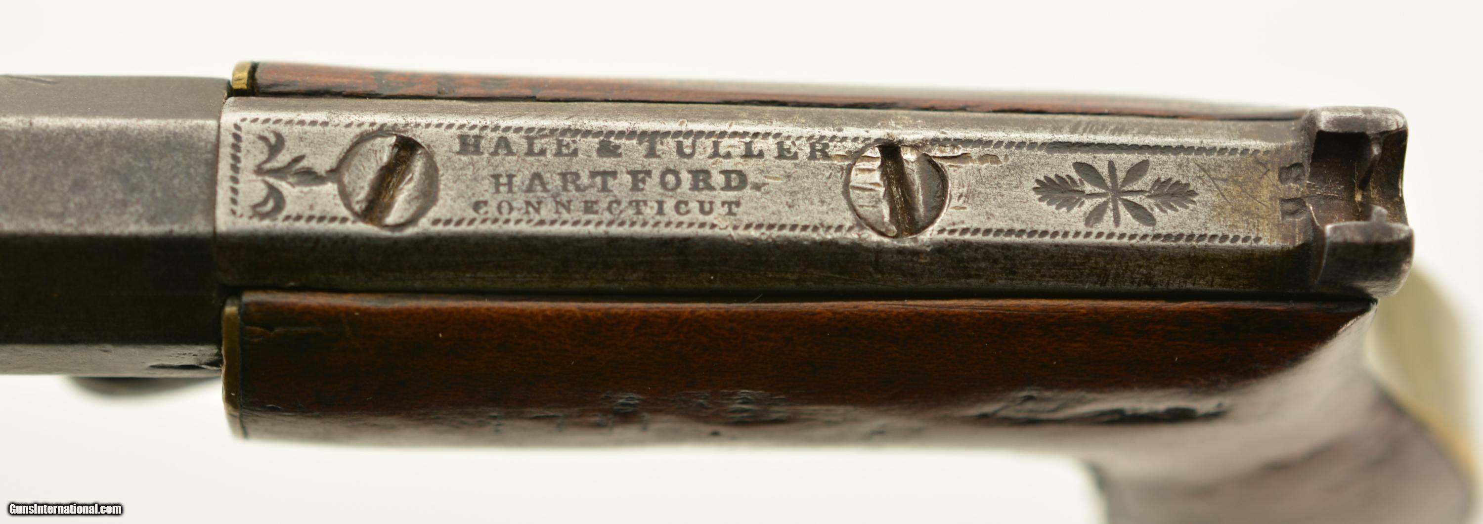 Description: Serial #150, .32 cal., 4" part octagon part round barrel with a heavily pitted bore. The barrel has a simple “wedding band" transition and has a mottled gray-brown patina along its length, with scattered impact marks on the octagonal section as well. The rear top flat is marked "HALE & TULLER / HARTFORD / CONNECTICUT", with a light foliate and angled dot border, and the left side flat is marked, "WARRANTED / CAST STEEL". The action is functional, but the mainspring is weak, and the hammer spur was milled away at some point. The saw handle grip rates about very good with light handling marks and a thin crack across the left side. The number “1741" is faintly scratched into the wood on the left side. The brass grip frame has toned to a mellow ochre patina, with light handling marks and a legible "ER" scratched into the backstrap. There is a small chip missing along the front left of the grip causing the gripstrap to lift slightly. These are very interesting guns that seem to be the product of a commercial partnership between H.J. Hale (a CT gunmaker), Tuller (a Hartford, CT tin and stove merchant), and the Connecticut State Prison. As such, these guns were built by convicts at the prison. This is a seldom seen American pistol, manufactured under highly unusual circumstances. Antique SOLD Antique: Yes Manufacturer: Hale & Tuller Model: Boot Pistol Serial Number: 150 Caliber Info: .32 Gauge Info: .32 |