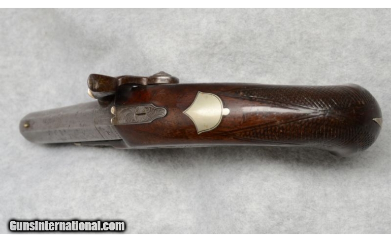 Description: SOLD Antique: Yes Caliber Info: .52 Caliber Metal Condition: Gray patina with some pitting. Wood Condition: Good, checkering worn. One crack on left side of action by the breech. Bore Condition: Dark with rust. Barrels: 3 3/4 Stock: Walnut with checkering and silver inlay. Weight: 14.5 oz Sights: Brass blade front, fixed "V" notch rear Item Location: Fort Worth, TX |