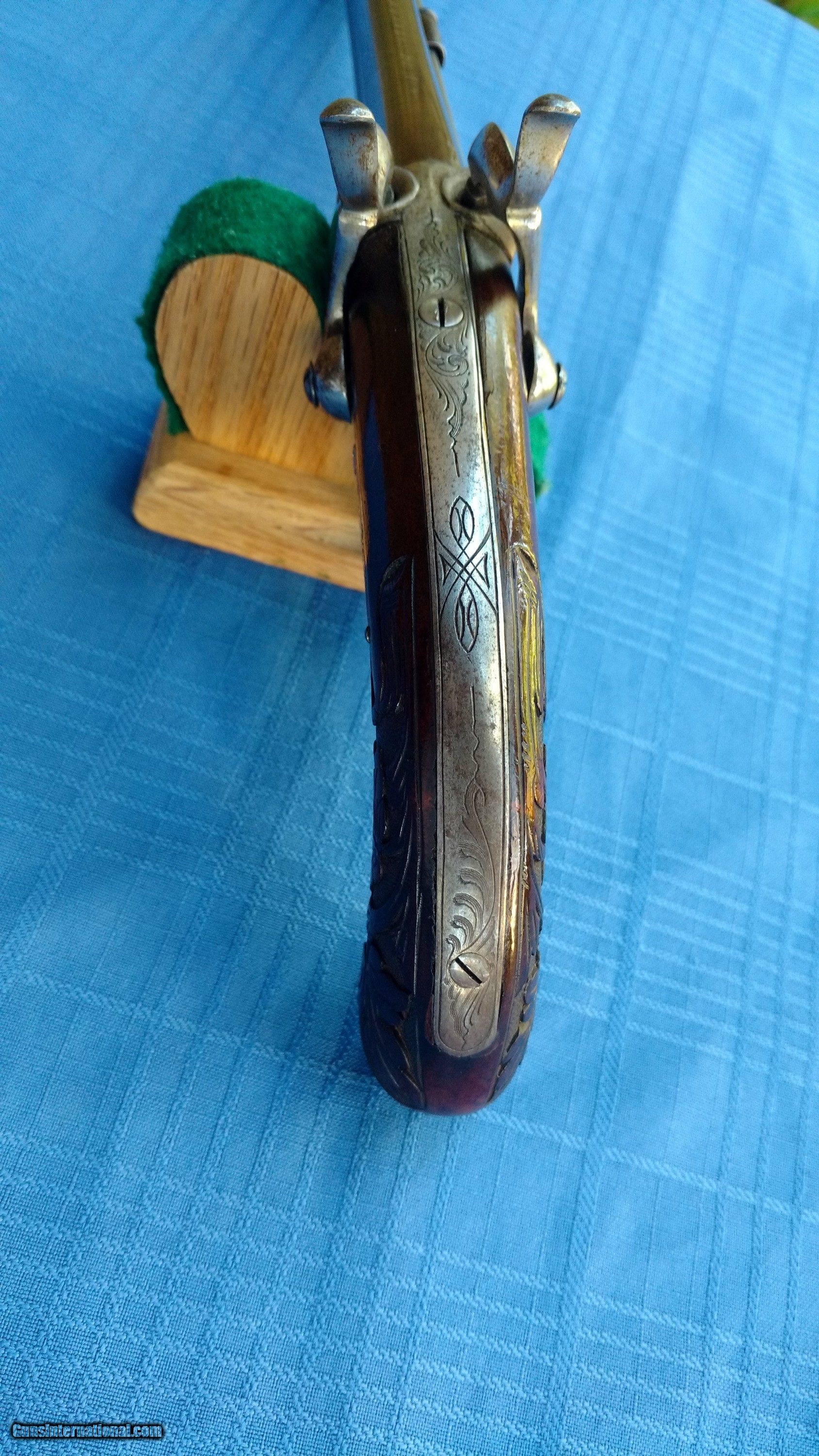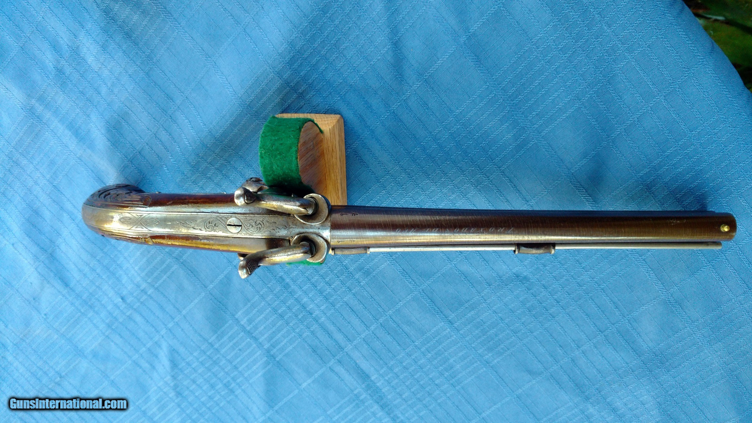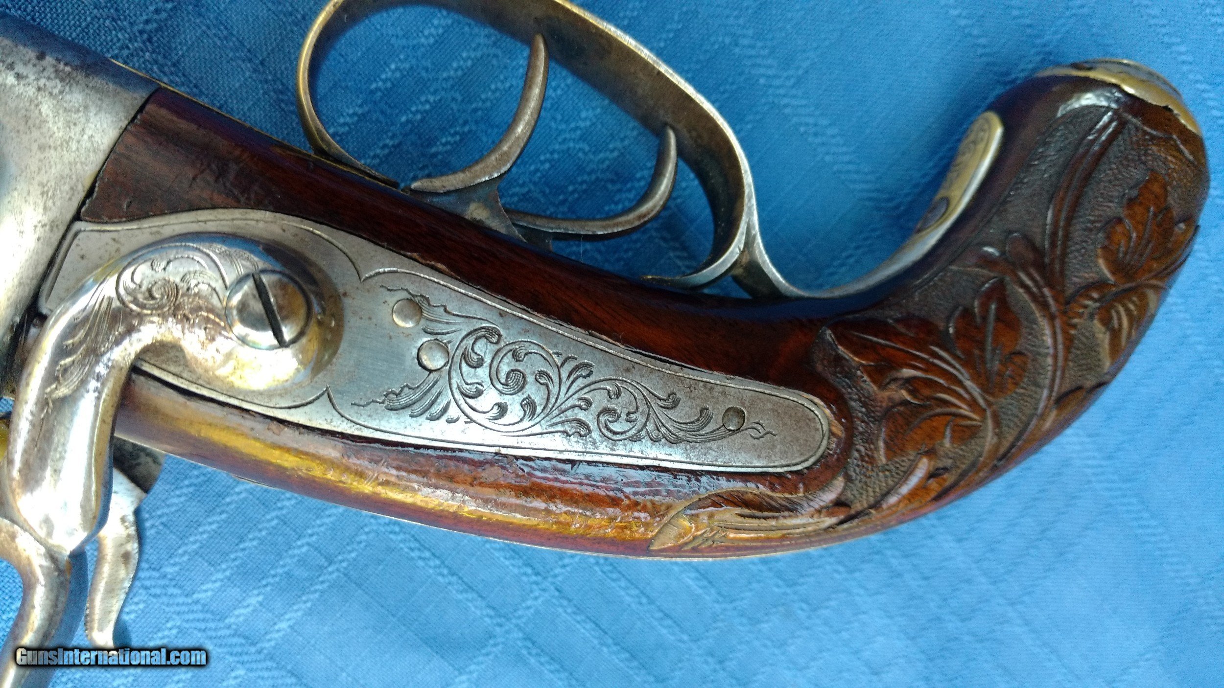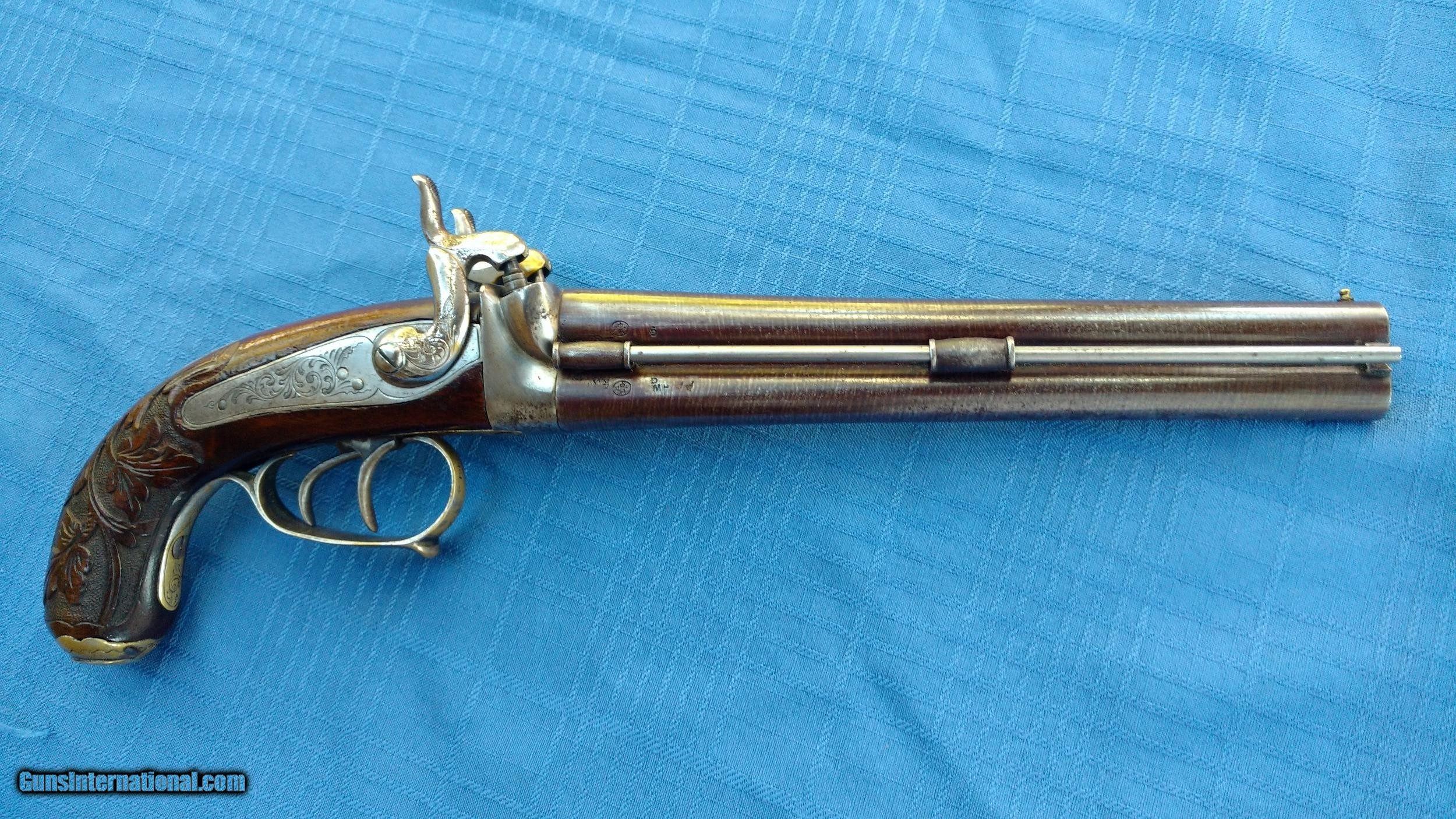 Description: Here's a rare Howda Pistol European . Maker marked on barrel with Platinum letters. Proof marks on barrels. Condition is Stunning. Barrel has all it's original Brown finish with most all of the Damascus still visible. Top of barrel has maker written with Platinum inlay. Gun is finely Engraved. Wood is Carved in Fantastic floral Pattern. Mechanics are excellent . Overall a fine example of a fancy Hoeda pistol. Please review my photos and please email me with any questions ? 3 day inspection. Thank you for looking , Little Jo SOLD Antique: Yes |