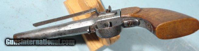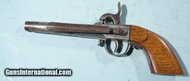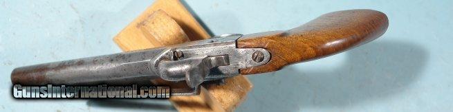 Description: JAPANESE PERCUSSION BOX LOCK SINGLE SHOT .50 CAL. PISTOL WITH KANJI INSCRIPTION. CIRCA 1860’S. 11” o/a with 5” round smoothbore barrel having a Japanese Kanji inscription on the right side. Probably an official inscription related to police or constabulary use. Original grey patina. Wood grip refinished. Belt hook on left side of frame. Working order. SOLD Antique: Yes |