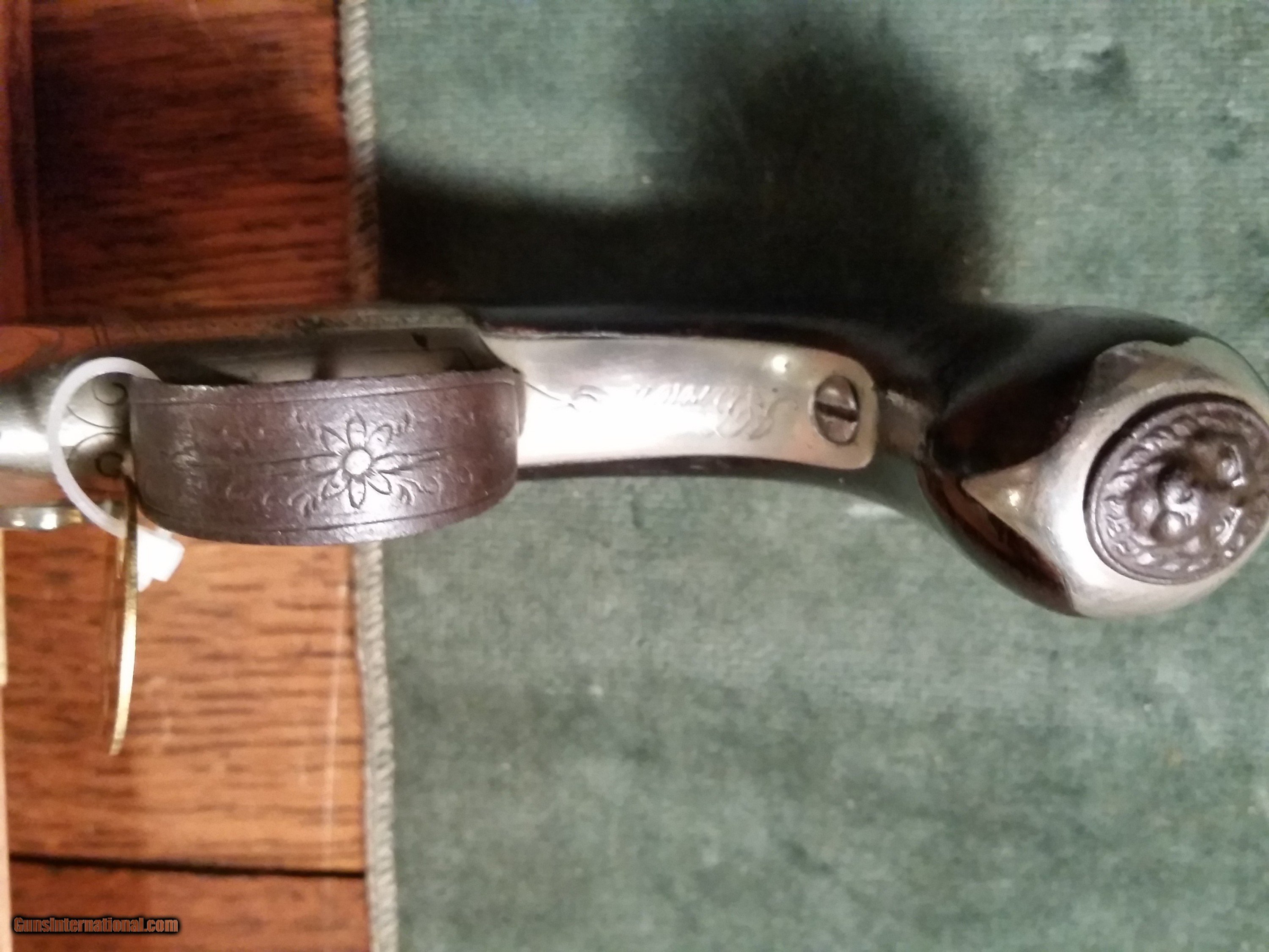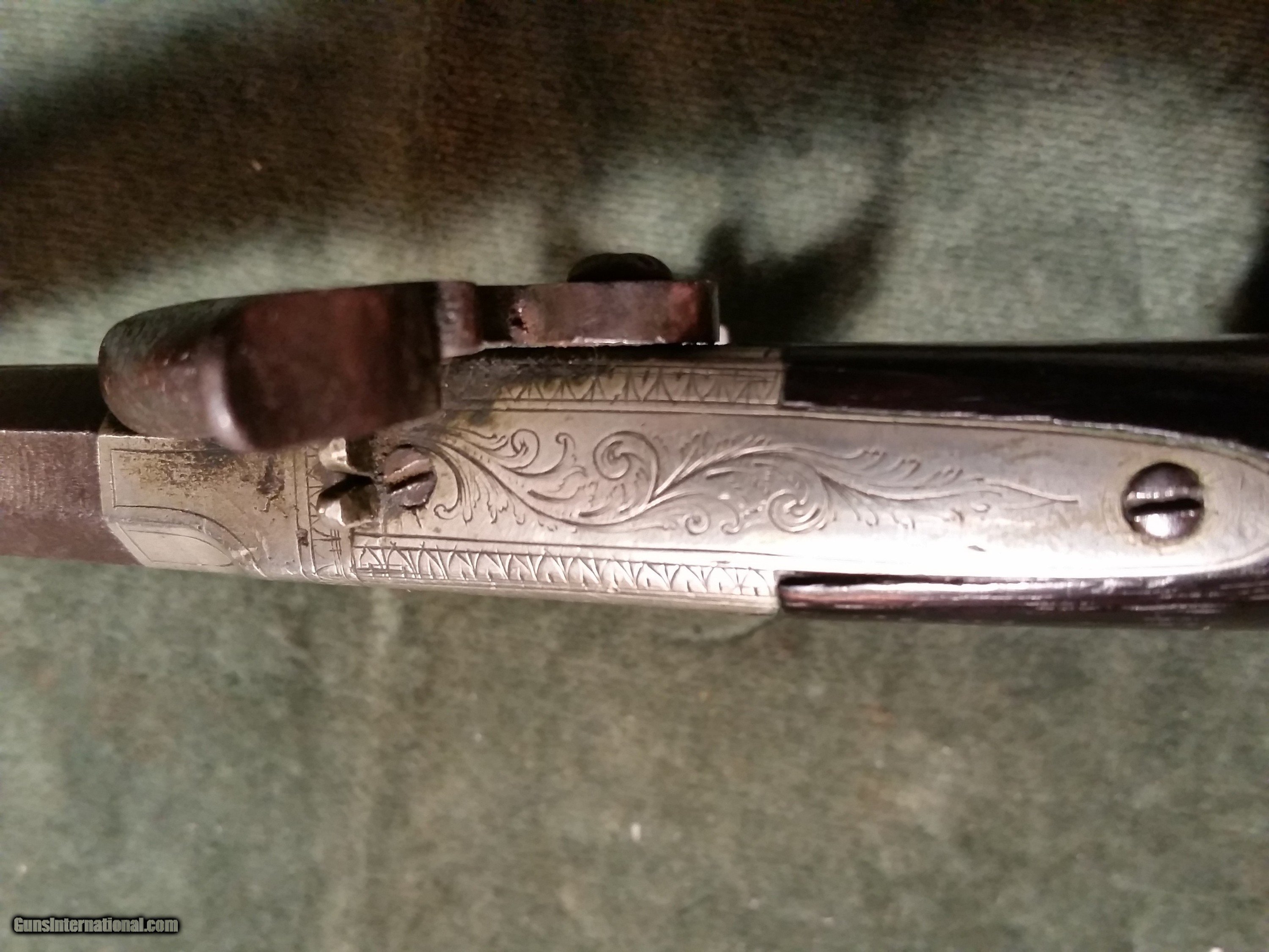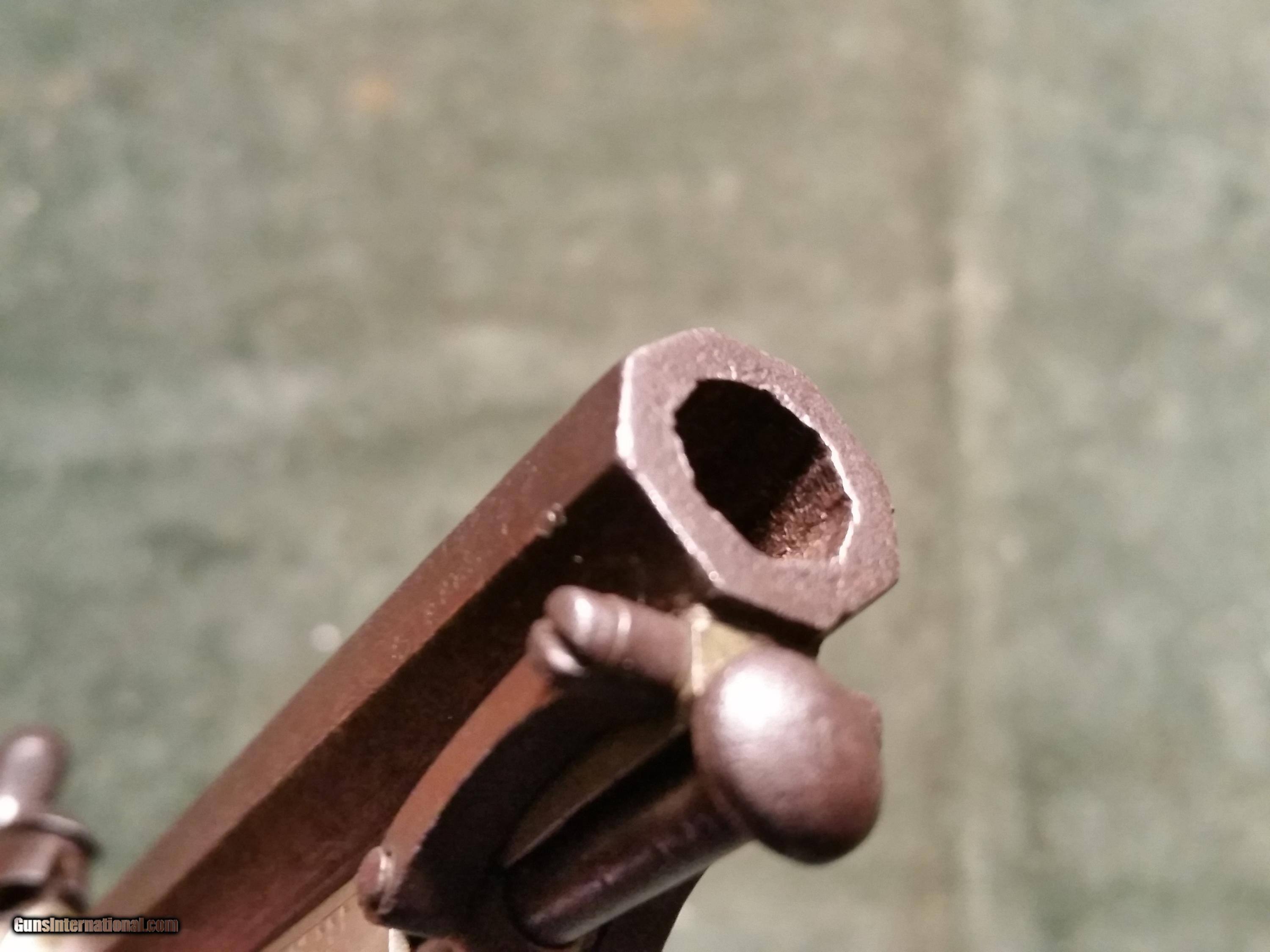 Description: Price Drop...John Brown Engraved, silver plated, 38 cal. Percussion Pistol with attached Ramrod, 1845, s/n 8 This unique little pistol is nicely engraved and signed J. Brown on the trigger guard strap. It has a covered compartment on the butt for holding caps and a unique attached ramrod. John Brown was born in Poplin, NH in January 1806. John married 3 times and had 5 children, he built his home which still stands at 402 Main Street, in 1830. Around 1845, John Brown of Poplin built this gun shop at 390 Main Street and with his son Andrew spent many years manufacturing pistols, shotguns, rifles, and doing repair work. They manufactured a gun that was very interesting, it was a “side by side“with a rifle barrel and a shotgun barrel. Some rifles made by John were inlaid with silver. John and his son Andrew became very highly respected gunsmiths in the mid to late 19th century. SOLD Antique: Yes Manufacturer: John Brown Serial Number: 8 |