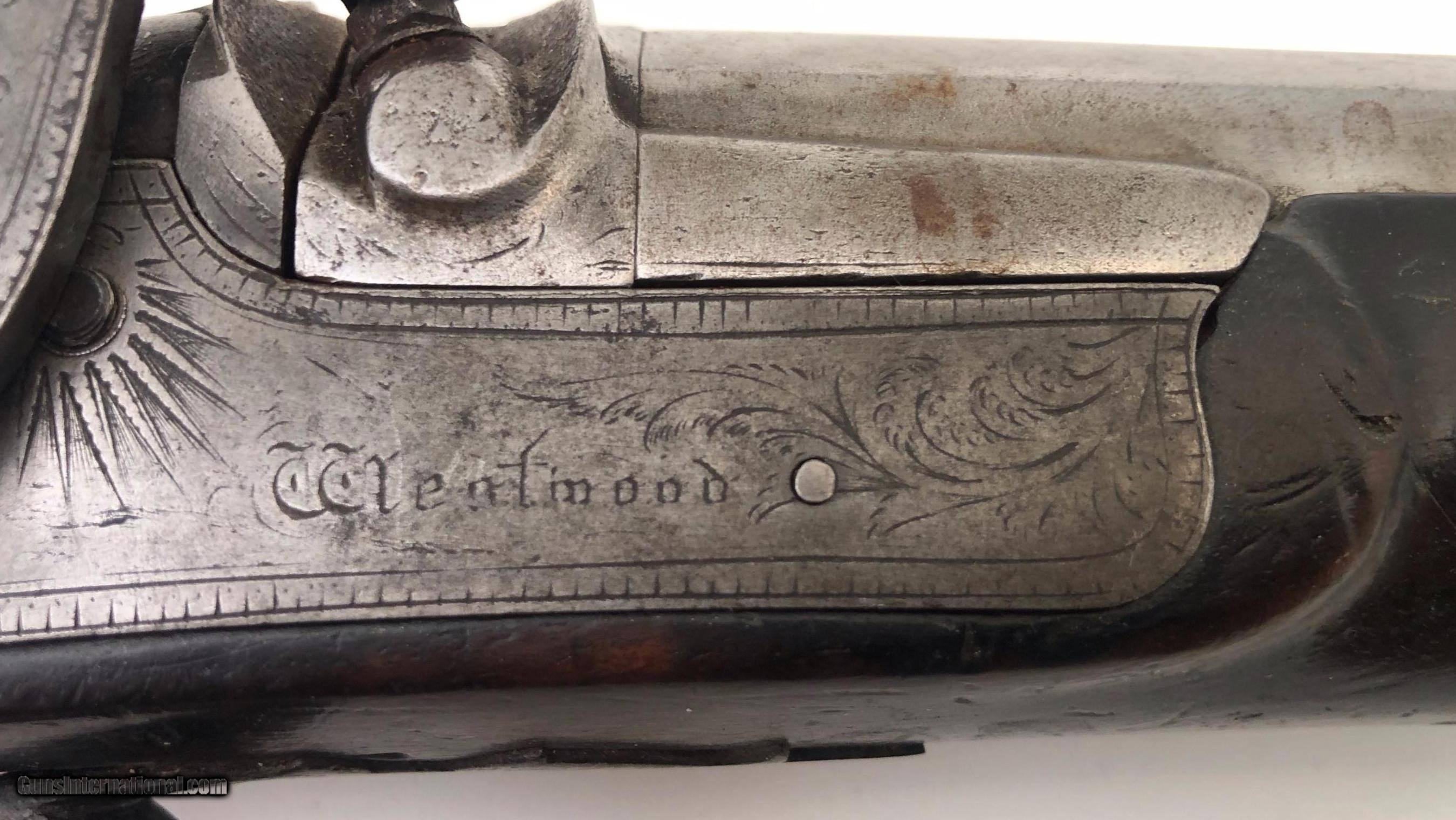 Description: Bore measuers .66 The action works but the set trigger does not. The barrel is rifled with some roughness. Metal and wood condition--See photos. Overall Length 15.35 SOLD Antique: Yes Manufacturer: Joseph Westwood Barrel Length: 9 |