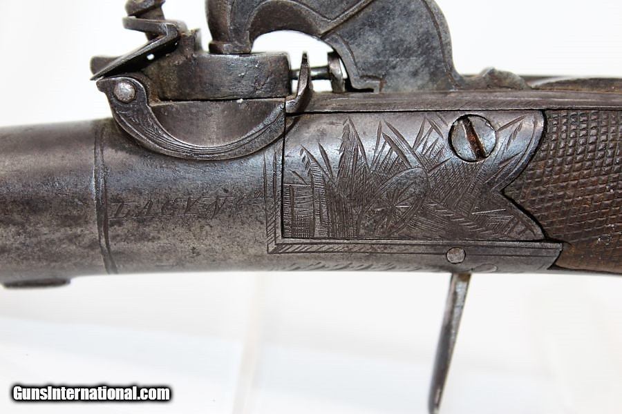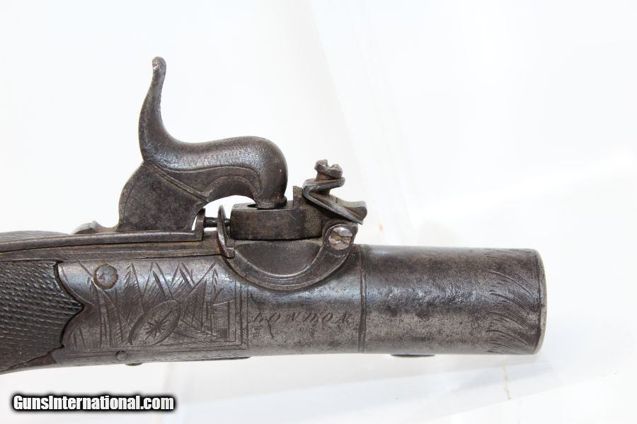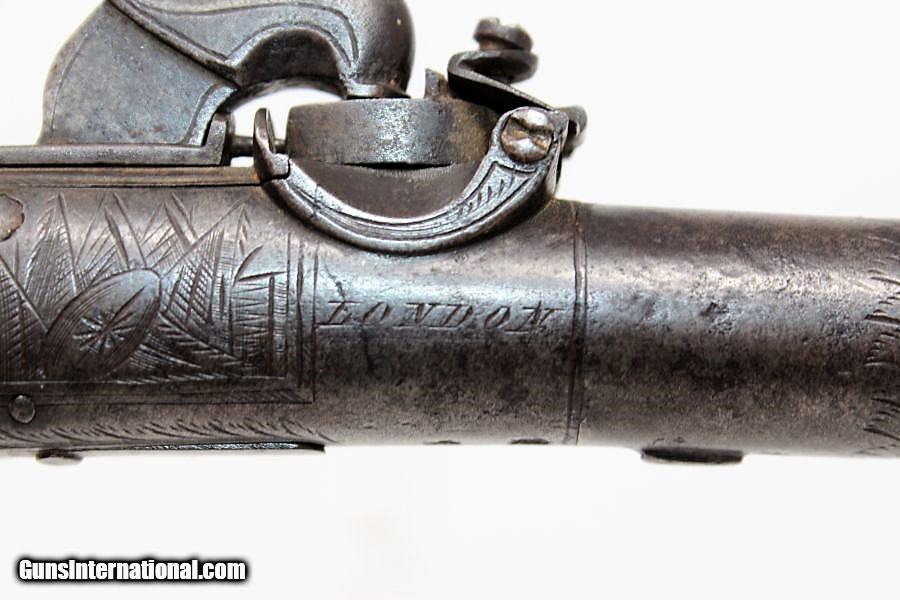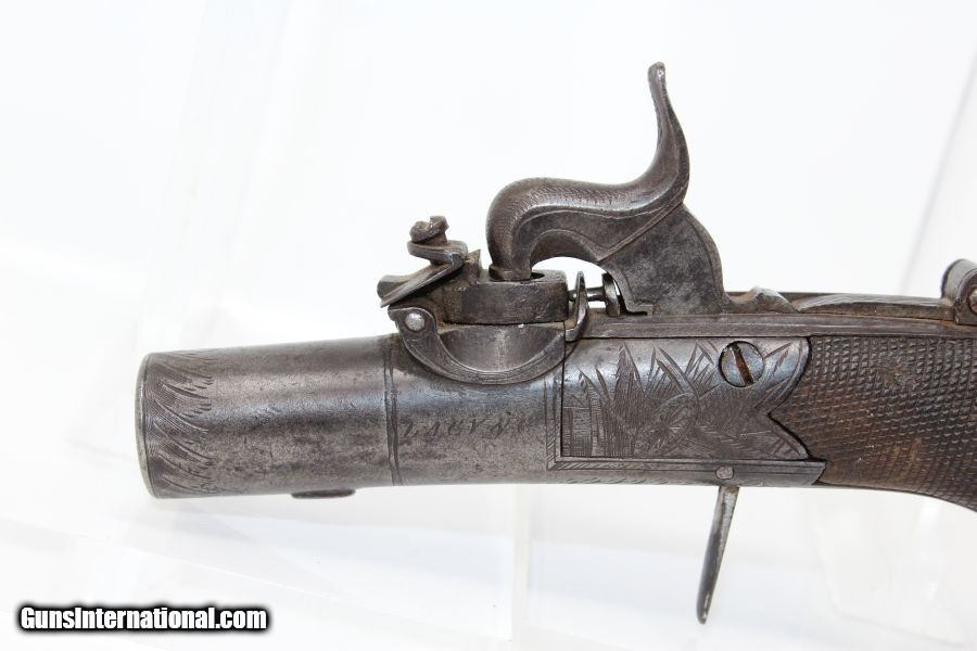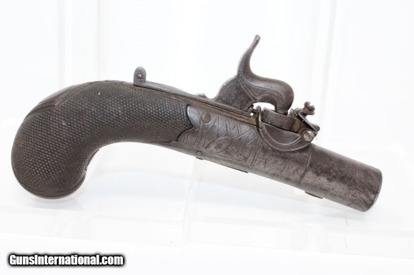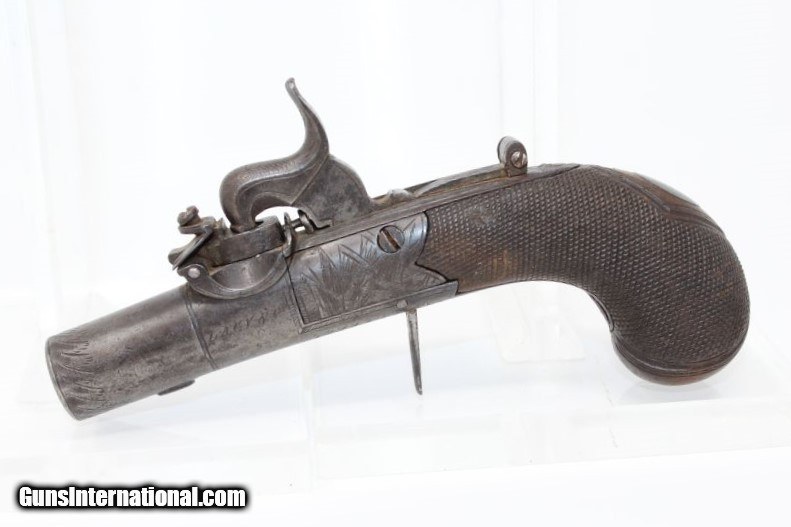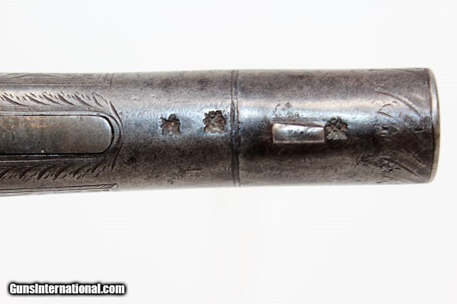 Description: LACY & COMPANY BOX LOCK Percussion Pocket Pistol Nicely ENGRAVED “London” Marked Mid-1850s Pistol Here we present an antique Lacy & Co. Percussion Pocket Pistol, made in England circa 1853. This pistol is small, light and simple. This “Pocket Pistol” name says it all. They were the "Saturday Night Specials" of the 16th-18th century. Before the Deringer, they were "Gentleman's" or "Muff Pistols", Typically, a smaller pistol that was easily concealed. They were favored among the gentry and women because of these traits. Men would carry them concealed in a waistcoat pocket and women would hide them in a hand muff. Bore is a massive .48 caliber. There are three British proof marks on the underside of the barrel. This one appears to have been originally a flintlock before being updated to the more reliable percussion firing system. The overall condition is very good. Iron surfaces very dark patina. Markings and engravings are clear. Hand-checkered walnut grip is in great shape. Bore is smooth. Action is excellent. Own the original! This is a legitimate antique and not a reproduction. Barrel is 1-1/4 inches. Caliber: .48 Percussion Overall condition as seen in photos. Very Fast. Very Safe. FREE SHIPPING WORLDWIDE. Delivered directly to your door by express mail! Guaranteed AUTHENTIC & Includes CERTIFICATE OF AUTHENTICITY. ancestryguns $685 #8542 SOLD Antique: Yes |