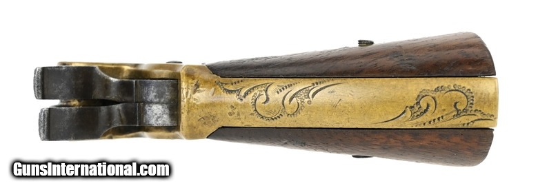 Description: Lindsay Two Shot Pocket Pistol. This is a superposed load where the percussion loads were stacked on top of each other. The double hammers fired in proper sequence squeezing the trigger drops the hammer on the load most forward while squeezing again drops the other hammer on the rear load. Brass frame is scroll engraved. The .41 caliber barrel right side of barrel is marked Lindsay’s Young America, Manufactured by J.P. Lindsays Man’F’D Co. New York. Left side of barrel has a wild animal (lion?), star studded flags and an eagle?. The right side of the barrel has easily visible lettering. The left side with the scene is worn. Rare pistol of derringer size. SOLD Antique: Yes |