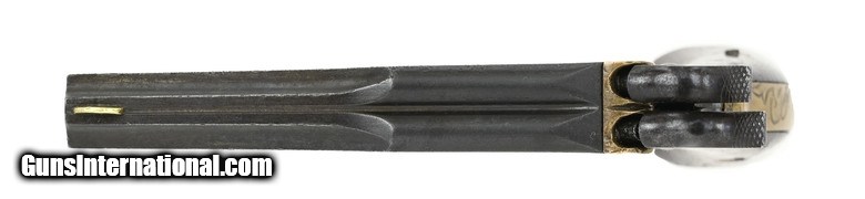 Description: Lindsay Two Shot Pocket Pistol. This is a superposed load where the percussion loads were stacked on top of each other. The double hammers fired in proper sequence squeezing the trigger drops the hammer on the load most forward while squeezing again drops the other hammer on the rear load. Brass frame is scroll engraved. The .41 caliber barrel right side of barrel is marked Lindsay’s Young America, Manufactured by J.P. Lindsays Man’F’D Co. New York. Left side of barrel has a wild animal (lion?), star studded flags and an eagle?. The right side of the barrel has easily visible lettering. The left side with the scene is worn. Rare pistol of derringer size. SOLD Antique: Yes |