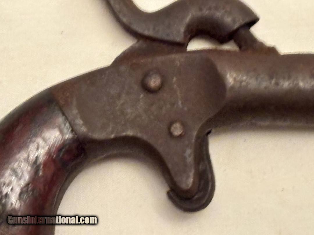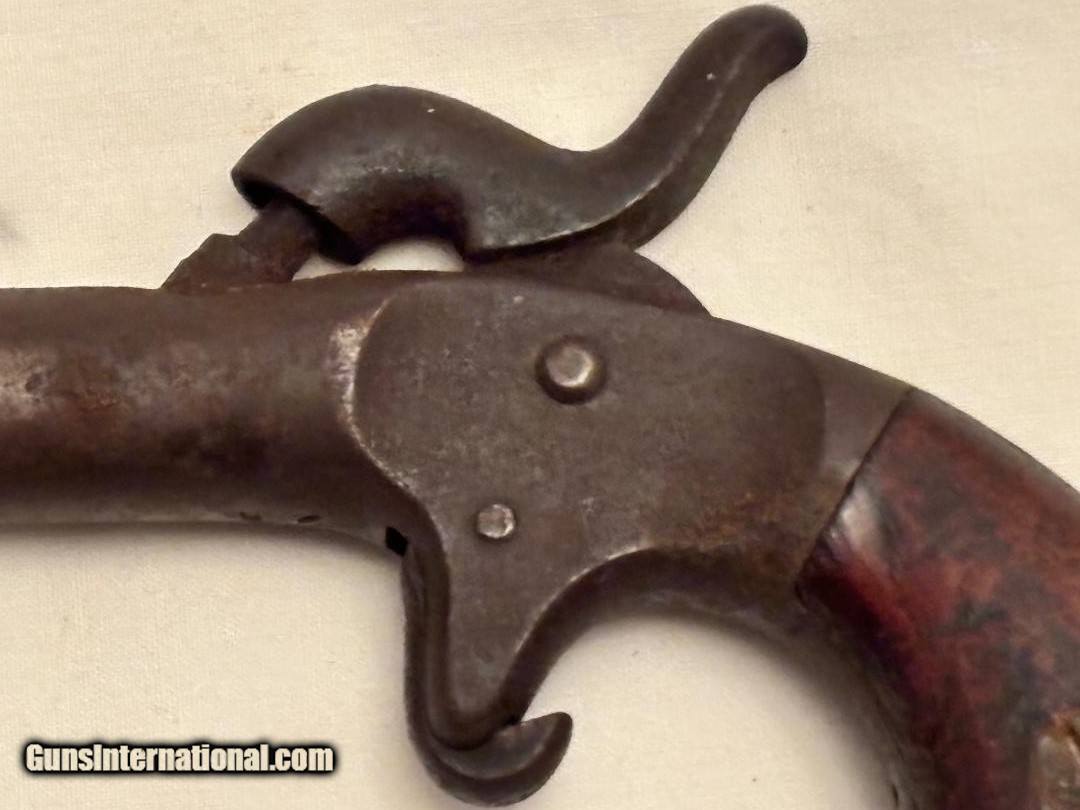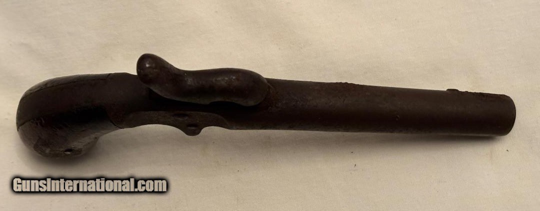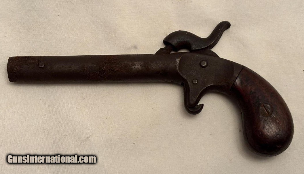 Description: Not pretty, but other than missing a trigger return spring it is functional with an extra light trigger pull. Made 1868-1873 with 3" barrel in 34 caliber. Bag shaped rosewood grips. No visible markings due to the oxidized finish as shown. Not certain if by Manhattan or its successor, American Standard. Small square tabe on left front of barrel similar to those on rifles to mount a bayonet; purpose unknown. As this is an antique percussion and can be shipped by USPS, it will go that way by Priority Mail for $15 to any locality where not locall prohibited (such as NJ or Chicago, etc.). As is with no right of return; ask any questions before buying. Antique: Yes Manufacturer: Manhattan / American Standard Model: Hero Barrel Length: 3 Condition: poor to fair Metal Condition: poor to fair Wood Condition: fair Bore Condition: poor Action: single Triggers: Spur Manufacture Date: 1868-1873 Grips: rosewood Price: $125.00 Shipping: $15.00 Buy Now Contact Seller |