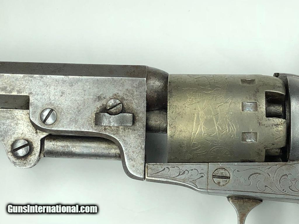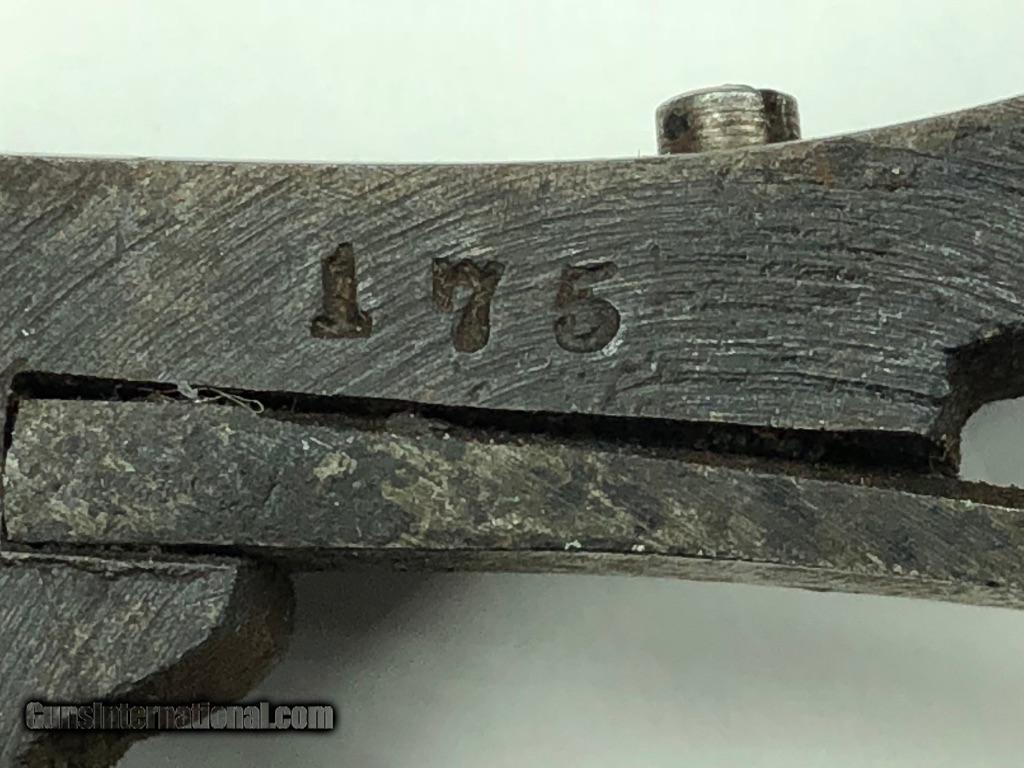 Description: Manhattan - London Pistol Company .31 cal Serial number 175 Waldo Nutter’s “Manhattan Firearms”, Chapters IV and V discuss the Manhattan .31 Caliber Revolvers and the London Pistol Company revolvers. Nutter concluded that the London revolvers were made by Manhattan concurrent with the .31 caliber Manhattan Revolvers, and that they were marked from the same run of serial numbers. Nutter reasoned that the London revolvers were not completed and issued for sale until after January 1860. All of the London revolvers Nutter examined had the following language stamped forward of the trigger guard: PATENTED DEC. 27. 1859 Nutter quoted Sam E. Smith’s The Gun Collectors Letter, Issue #5, December 25, 1946, article, which concluded that “ . . . less than one thousand [London revolvers] appeared.” However, Nutter concluded Chapter V stating his “ . . . estimate that only a very few hundred were so marked.” A more recent online survey of Manhattan arms (://baconfirearms/London2.html) stated that their “ . . . research has uncovered fewer than three dozen known specimens today (April 2008).” Whoever may be correct, the simple fact is few of these revolvers were produced, and only a handful are extant. The London revolver offered in this posting has serial number 175. The serial number matches at all four serial number locations for these revolvers - on the bottom of the barrel under the loading lever, the frame inside the left grip, the ratchet end of the cylinder, and the wedge. (see photos) The revolver has a five chamber cylinder. The hammer holds half and full cock. The action is strong, locks tightly and indexes properly. The barrel address is clear and reads: LONDON PISTOL COMPANY The initials JAM were lightly printed inside the left grip. A four pointed star was scored inside the right grip. (see photos) The frame forward of the trigger guard clearly states the patent information stated above. (see photos) The trigger guard is small, which is correct for the model. The grips are excellent and small, which is correct for the model. The engraving on the frame, cylinder, and back strap are clear and readable. The octagonal barrel is four inches long. It has the correct brass post-type front sight. (see photos) The bore has strong rifling with light pitting – on a scale of 1 to 10, my opinion is 8/9. The cylinder has 10 notches. The nipples are very good to excellent and clear of obstacles. The chambers are in very good condition. The extensions that made the v sight on the hammer when it was at full cock have been knocked off, probably from dry firing. (see photos) This revolver is an excellent example of an early Series 1 type London. It is a rare and well made revolver. It will enhance any collection. Seller's Policies Payment for sales in the United States shall be made exclusively by cashier's check or money order. Payments must be received by me within seven days of our agreement to sell an antique firearm. I will tell you by phone or email the date on which the seven day period begins and the date by which I must receive payment from you. I will ship antique firearms by USPS Priority Mail, and I will provide the tracking number to buyers by email. Buyers will pay me $15 for shipping within the US, and actual shipping costs, including the cost of the box, postage, custom taxes and fees, and insurance, for shipping outside the US. Buyers have a five-day inspection period, starting from the delivery date shown by the shipper’s tracking information. During the five days, buyers may return an antique firearm and receive a refund. Returned antique firearms must be received by me within 10 days of the date on which the buyer received it by the same shipper I used, and buyers shall pay all of the costs for packing and shipping, including insurance. Antique firearms must be returned in the same condition they were in when received by the buyer. During the five-day inspection period or during the return process, buyers shall not disassemble or fire antique firearms without my prior consent. Disassembly or firing of antique firearms voids the five-day return option. Buyers are responsible for compliance with all applicable laws of the US and their state and local government entities with respect to the purchase, possession, ownership, storage, and transfer of antique firearms. I will not sell or ship antique firearms to people located in California, New Jersey, or Washington DC. Buyers must be 21 years old or older. Buyers must inform me if they are prohibited from owning firearms by any government entity. By concluding a sale with me, buyers represent and warrant to me that they are allowed by law to legally purchase and possess firearms. Sales with people not allowed to purchase or possess firearms shall not be completed, and any payments received by me from such buyers shall be refunded, minus a $50 processing fee. I transfer antique firearms to buyers as collector antique firearms only. I have not fired any of the transferred antique firearms, and buyers must have all antique firearms inspected by competent gunsmiths before firing antique firearms. I am not responsible for any bodily injuries, deaths, or property damage caused by antique firearms that are fired, and buyers agree and shall indemnify and hold me harmless from and against any and all actions, claims, causes of action, demands of any sort, including payment of all of the my attorneys fees and costs, and payment of any and all judgments, awards, decisions, or payments of any type of kind ordered by any court, government entity, or agency of competent jurisdiction to by paid by me to any and all claimants, including buyer. Buyers further agree and release me from any and all liability, criminal or civil, arising from the buyer's purchase and/or use of the antique firearm. All antique firearms are sold as is with no warranty or guarantees, implied, expressed, or otherwise. Buyers are solely responsible