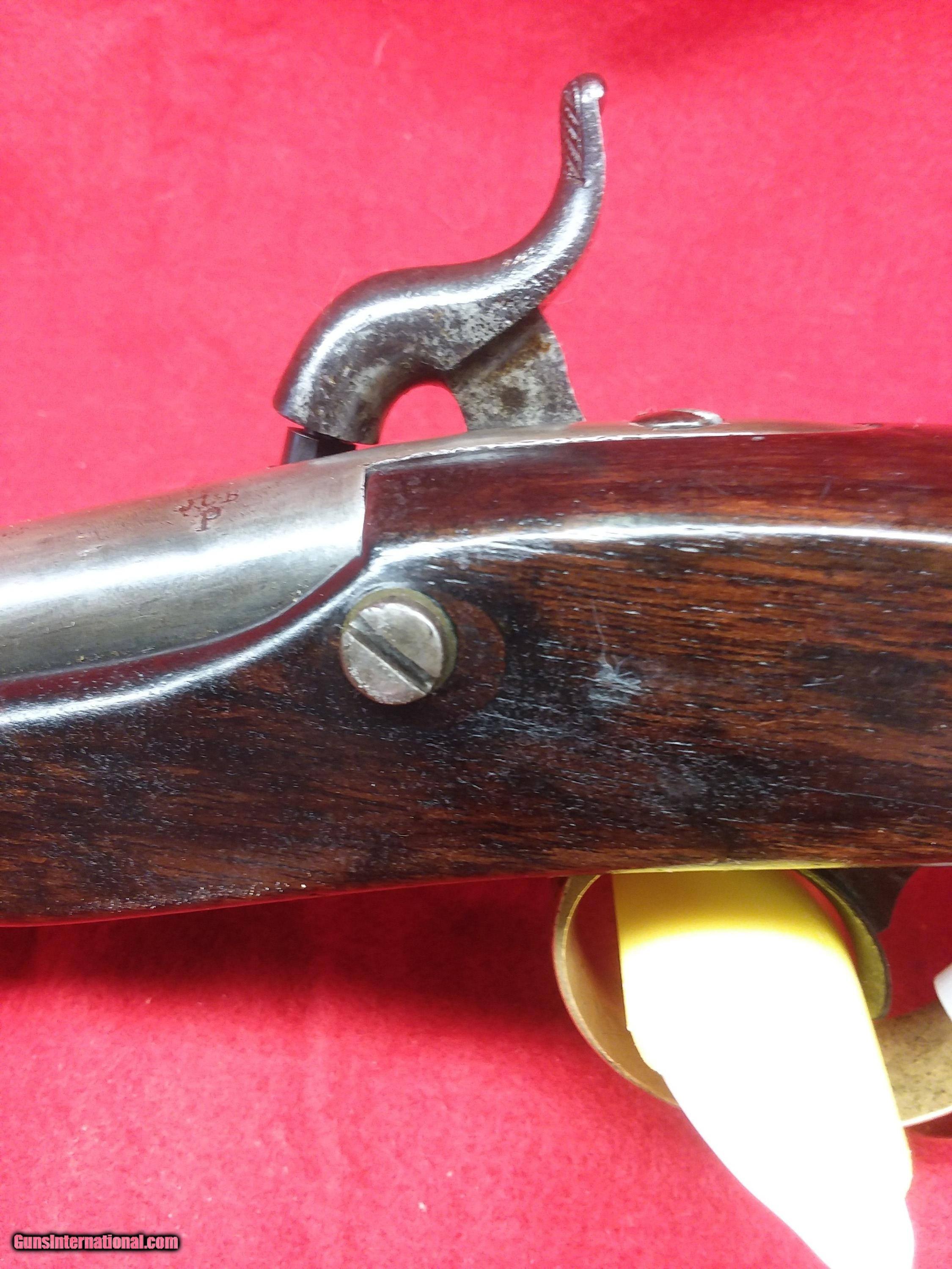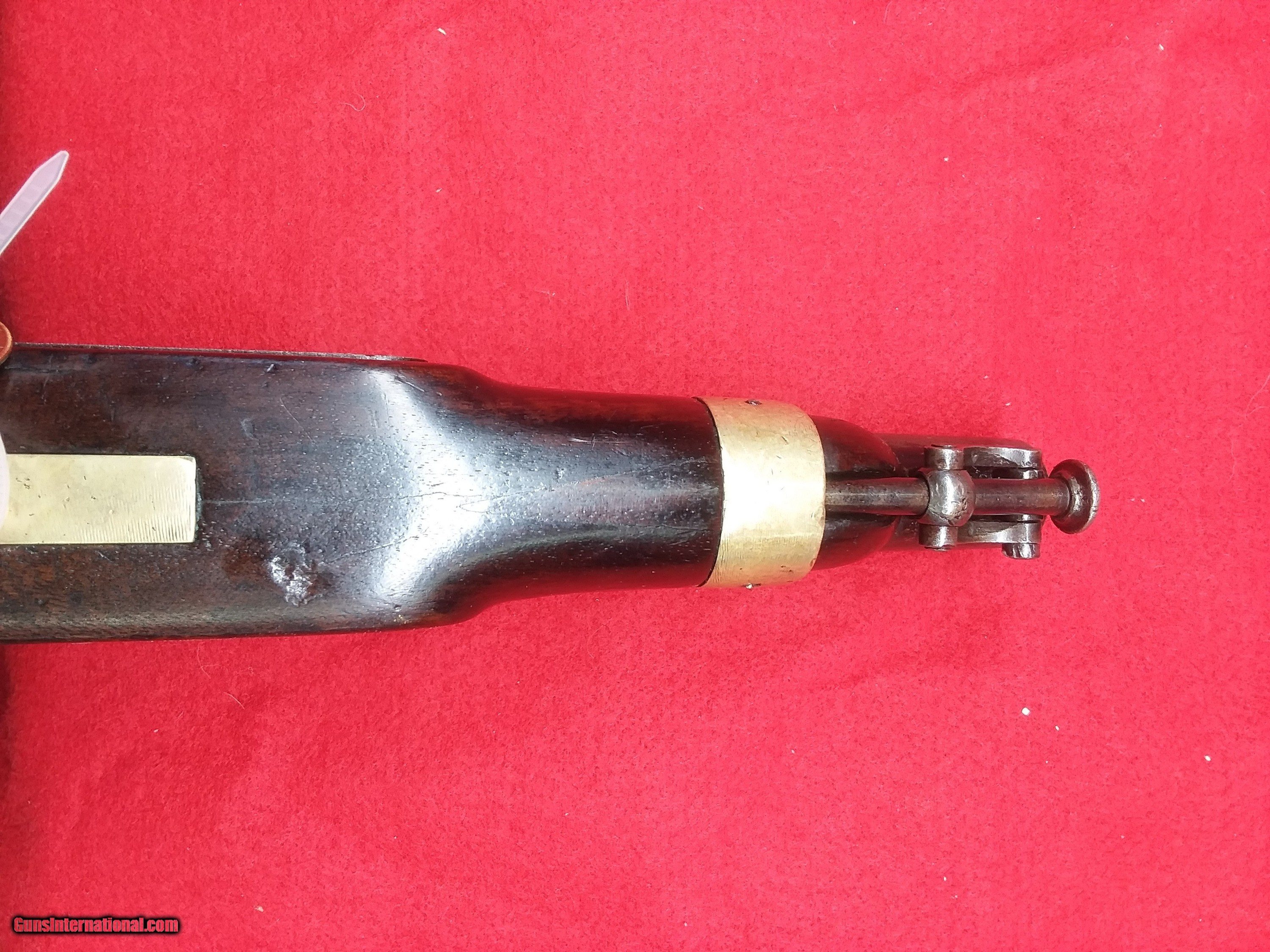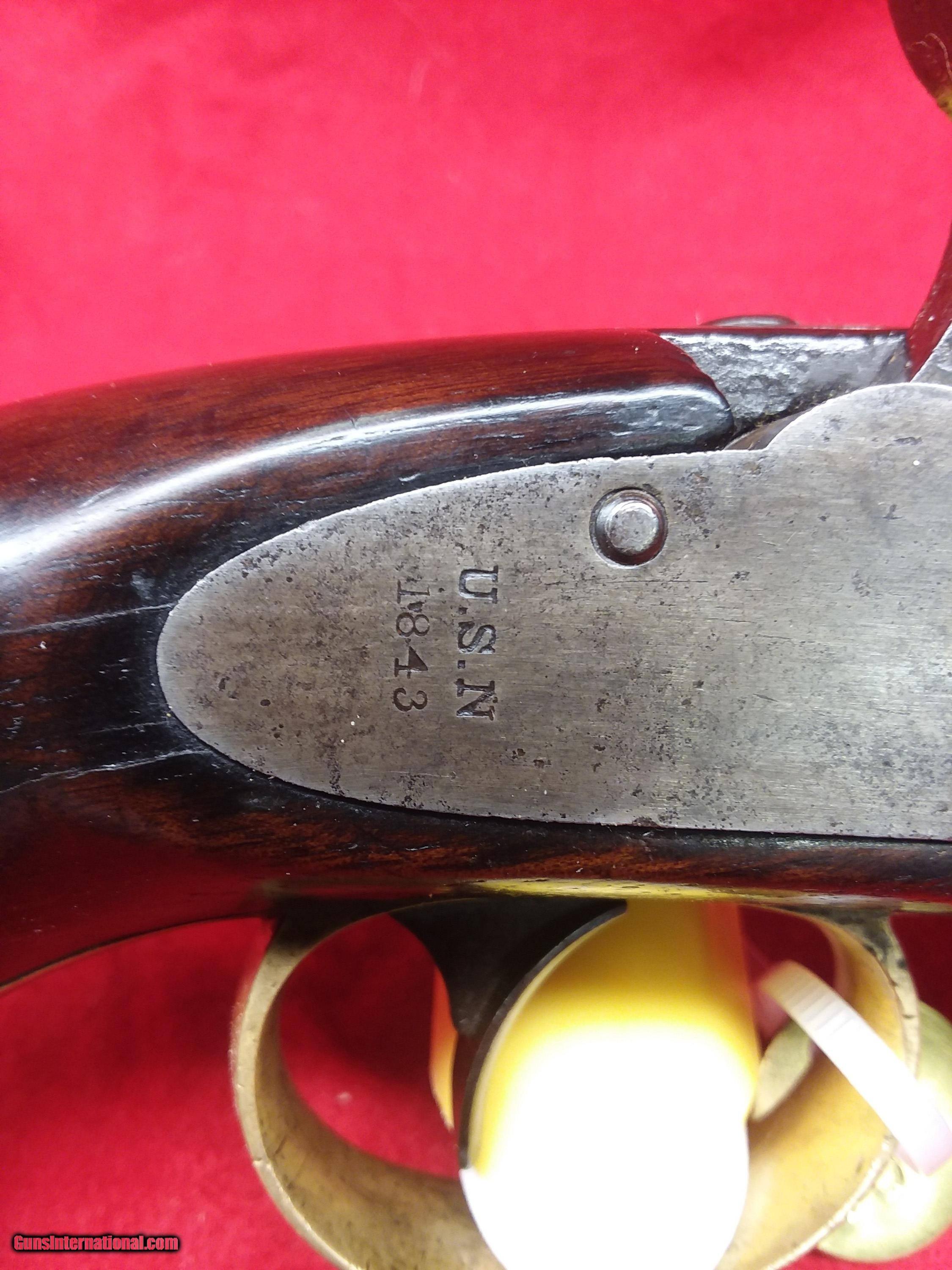 Description: 1842 Ames (#198) N.P. Ames U.S. Navy Contract Model 1842 “Box Lock” Pistol, in .54 caliber, made circa 1843 (1st year of production) in Springfield, Massachusetts. Only 2,000 of these were made by Ames. Most of these scarce pistols saw service through the American Civil War. This one was made just prior to the Mexican-American War. Unlike most martial pistols of its time, the hammer is mounted on the interior of the lock plate. It also features a captive swivel ramrod to avoid loss in the sea during boarding maneuvers. The Model 1842 saw service during a time of great change and increasing tension, as well as firearms innovation. This was the first official percussion pistol to be adopted by the U.S. By 1845 it was the primary weapon issued to the First and Second Regiment of Dragoons, replacing many of their Model 1836 flintlocks - just in time for the Mexican-American War. The Model 1842 was the last single shot smoothbore pistol issued by the U.S. The overall condition is very good with an even gray patina. The action is crisp and strong. The lock is clearly marked “N.P. AMES / SPRINGFIELD / MASS” with “U.S.N./1843” stamped vertically at the rear. The “1843” is much lighter than the rest of the markings. The bore is smooth and in nice shape with a replaced nipple. The walnut stock is in excellent condition for its age. There is no visible cartouche. The breech of the barrel is marked in four lines “USN/1843/JCB/P”. The first two lines are very light. The “JCB” is the mark of inspector Joseph C. Bragg, an 18 year civilian employee of the Ordnance Department. A very nice example of a scarce US Navy pistol! LEGAL: No FFL or C&R license is required! I will require a photo copy of your state ID or driver’s license with payment to verify your age. I am a collector – not a dealer, so it is your responsibility to know your local laws regarding the transfer of antique guns before . It is my intent to follow ALL national, state and local laws. If you win an and the item cannot legally be sent to you, I will charge a 20% restocking fee. All firearms are being sold as antiques and I make NO warranties or guarantees, whatsoever, as to a firearm’s safety. All firearms should be inspected by a qualified gunsmith before firing. SHIPPING: No local pick up. No international shipments. Shipping within the continental United States will be $65 for long arms and $45 for pistols. Shipments to Alaska and Hawaii will incur additional charges (I’ll only charge the incremental difference in shipping costs). I’ll do my best to ship as quickly as possible, but please keep in mind that I’m an individual and don’t have a shipping department (unless you count my wife). GENERAL: I’m new to GunsInternational but have been a long time participate on both and Ebay. Please check out my ratings: Username in is “intocw” and in Ebay is “n2cw”. INSPECTION PERIOD: I offer a three day, no questions asked, inspection period. I’ll refund the purchase price but not the shipping/insurance. Returned firearms must NOT have been fired, disassembled, or altered in any way. SOLD Antique: Yes Handgun Caliber: .54 Manufacturer: N.P. Ames Model: 1842 |