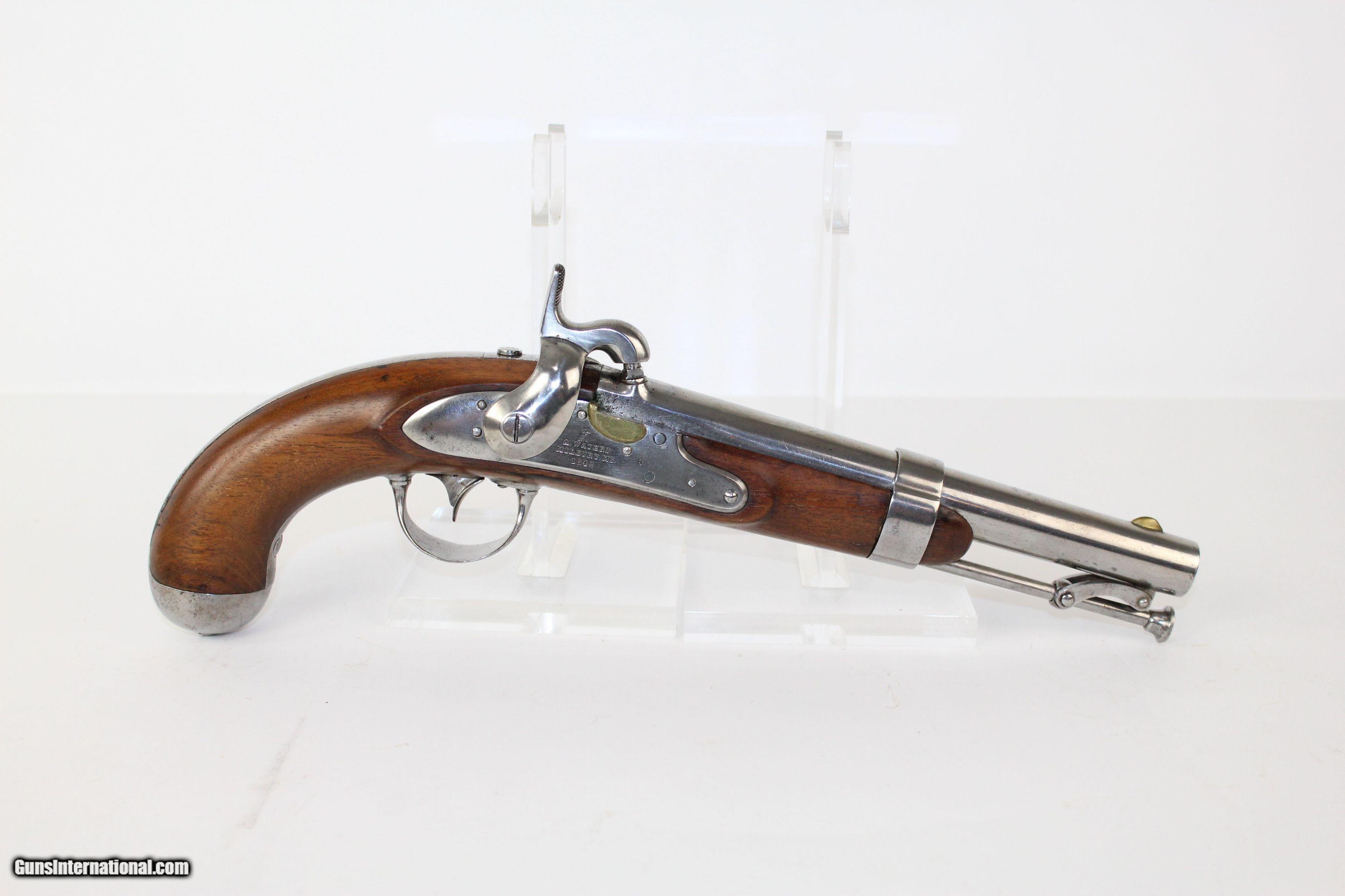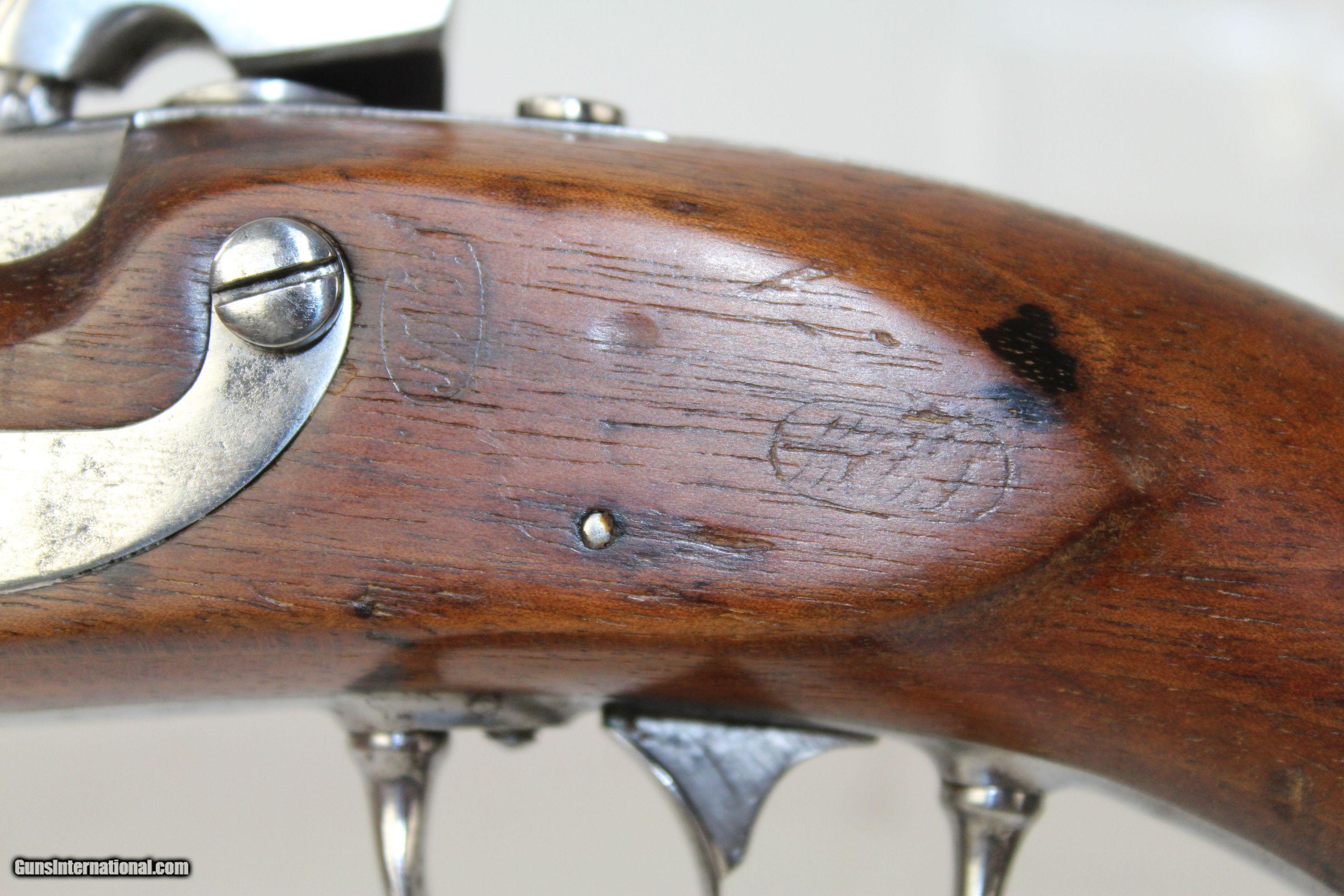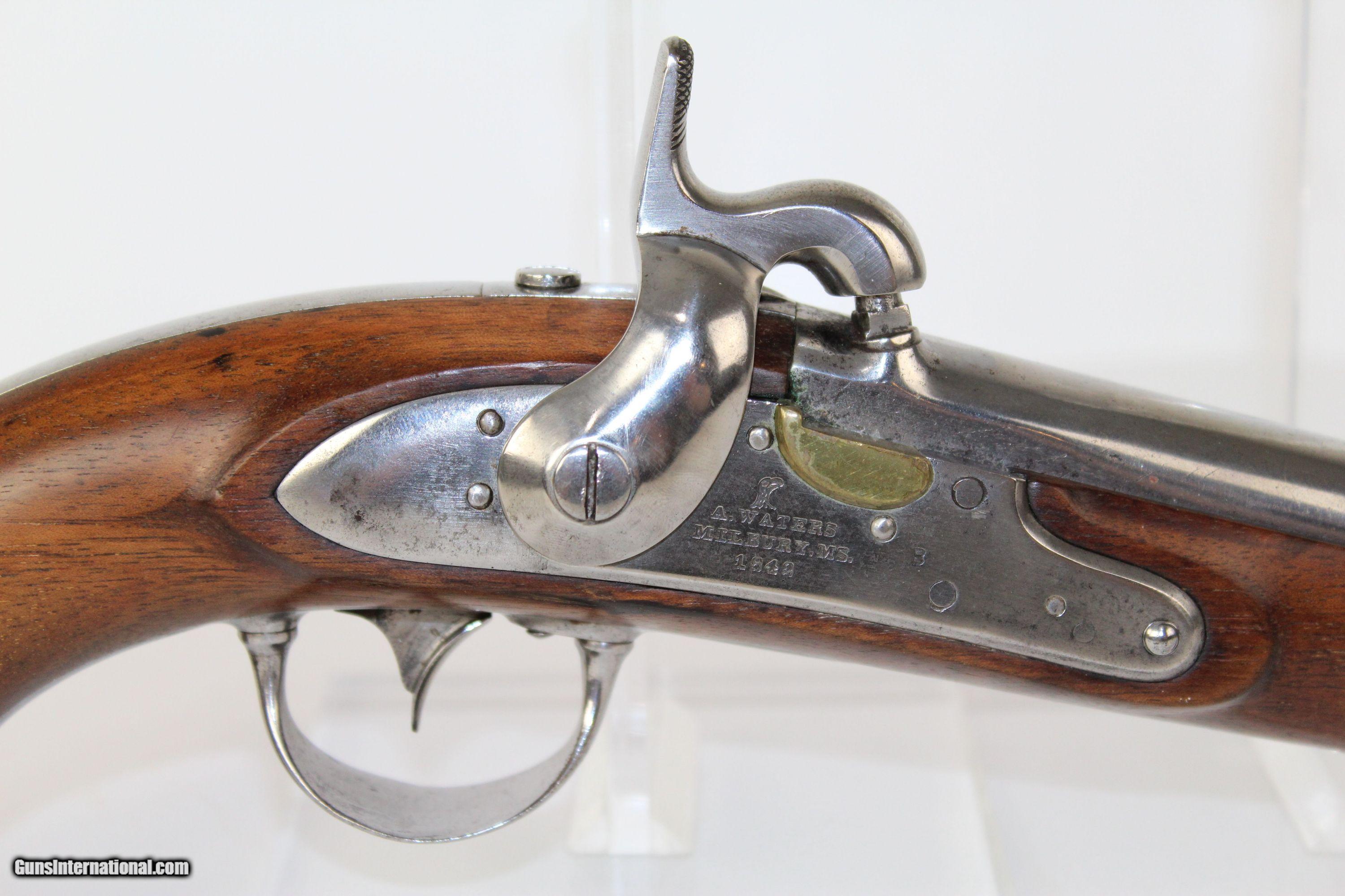 Description: NICE Antique Asa Waters US Model 1836 Pistol Mexican-American and American Civil War Here we present an antique A.H. Waters U.S. Model 1836 Percussion Conversion Pistol, made in 1842. There were actually two manufacturers of these guns: Asa Waters and Robert Johnson. Combined, the production totals 41,000 guns. This was the last U.S. martial pistol to use the flintlock system, and many consider this the best of all U.S. flint guns due to its craftsmanship and aesthetic appeal. The gun is historically significant as this was the primary issue pistol during the Texas Revolution, Mexican American War, and was even significantly used during the American Civil War, in the percussion converted format. This example is one of 23,000 made by Asa Waters and is marked as such. The lock is dated “1842”, the year that it was made. Many of these were lost to attrition during so many conflicts and many were converted for use by the North & South during the Civil War. There are two inspector’s marks on this pistol, “NWP” representing Nahum W. Patch and “WAT” representing Captain William Anderson Thornton. The overall condition is very good. The metal surfaces are bright. The markings are clear and legible. The bore is bright. The walnut stock is smooth and solid. The action is excellent. Here is a gorgeous example of a U.S. horse pistol! Own the original! This is a legitimate antique and not a reproduction. Barrel is 8-1/2 inches. Caliber: .54 Percussion Overall condition as seen in photos. Very Fast. Very Safe. FREE SHIPPING WORLDWIDE. Delivered directly to your door by express mail! Guaranteed AUTHENTIC & Includes CERTIFICATE OF AUTHENTICITY. ancestryguns $1650 #6209 SOLD Antique: Yes |