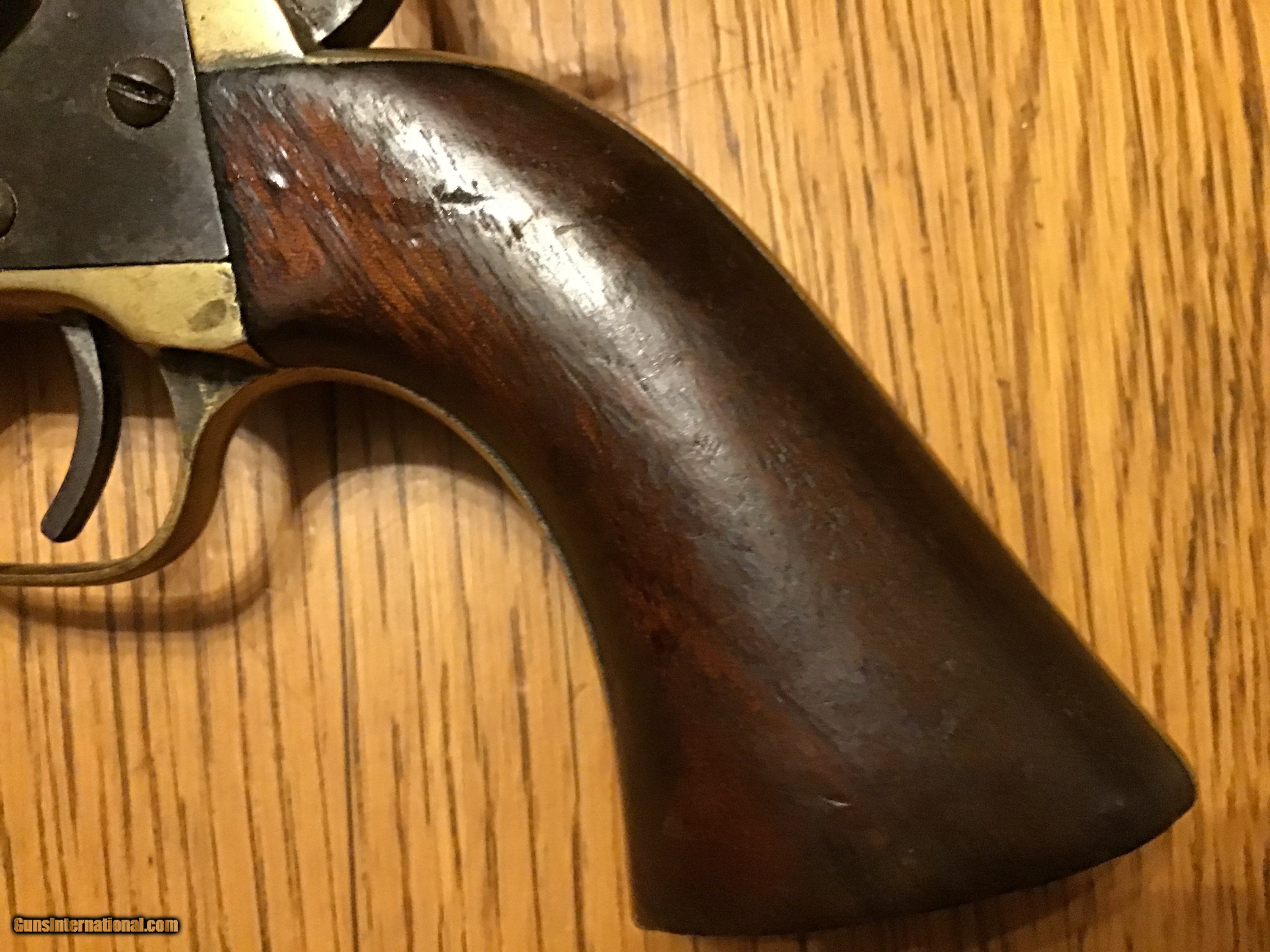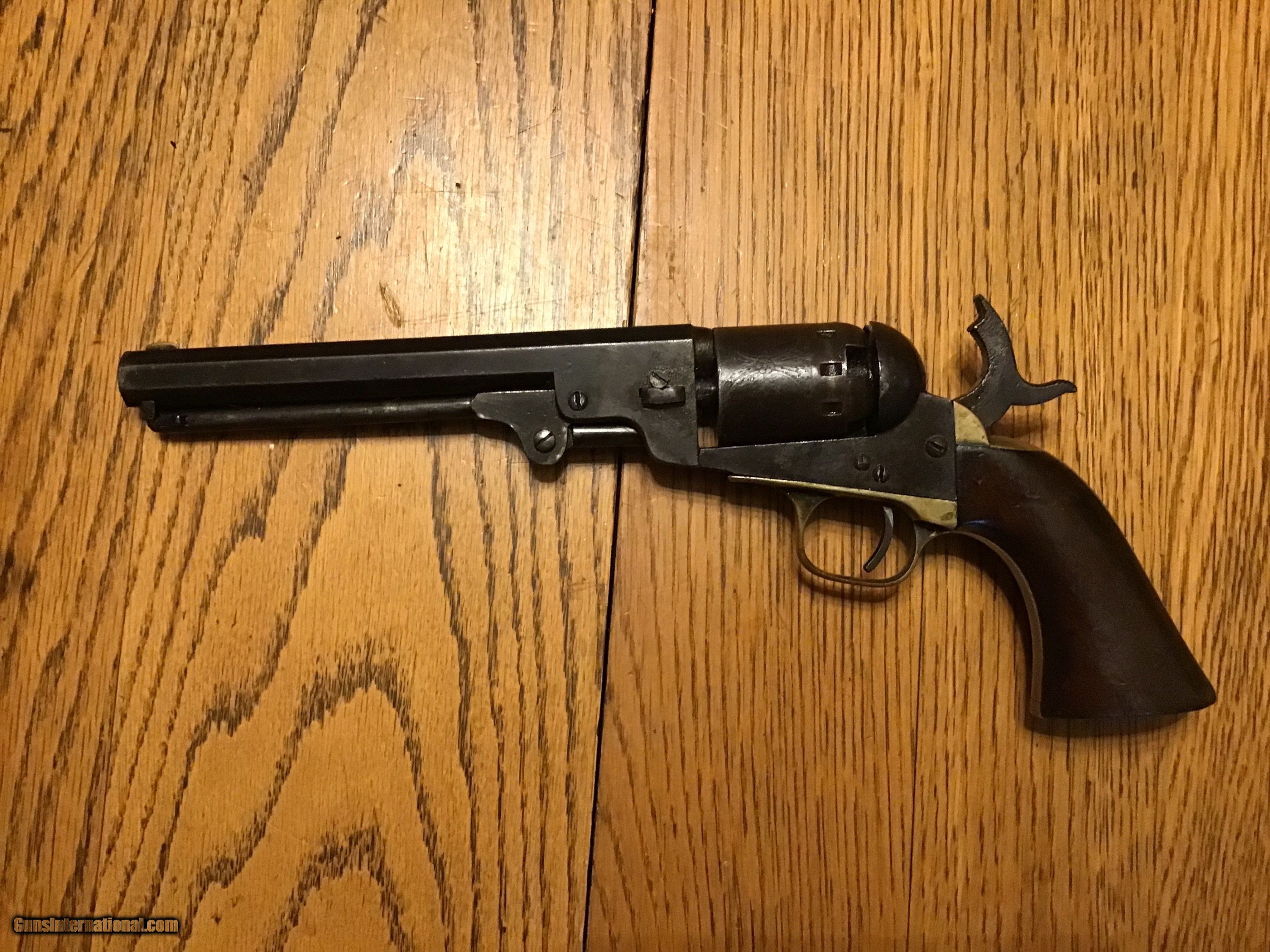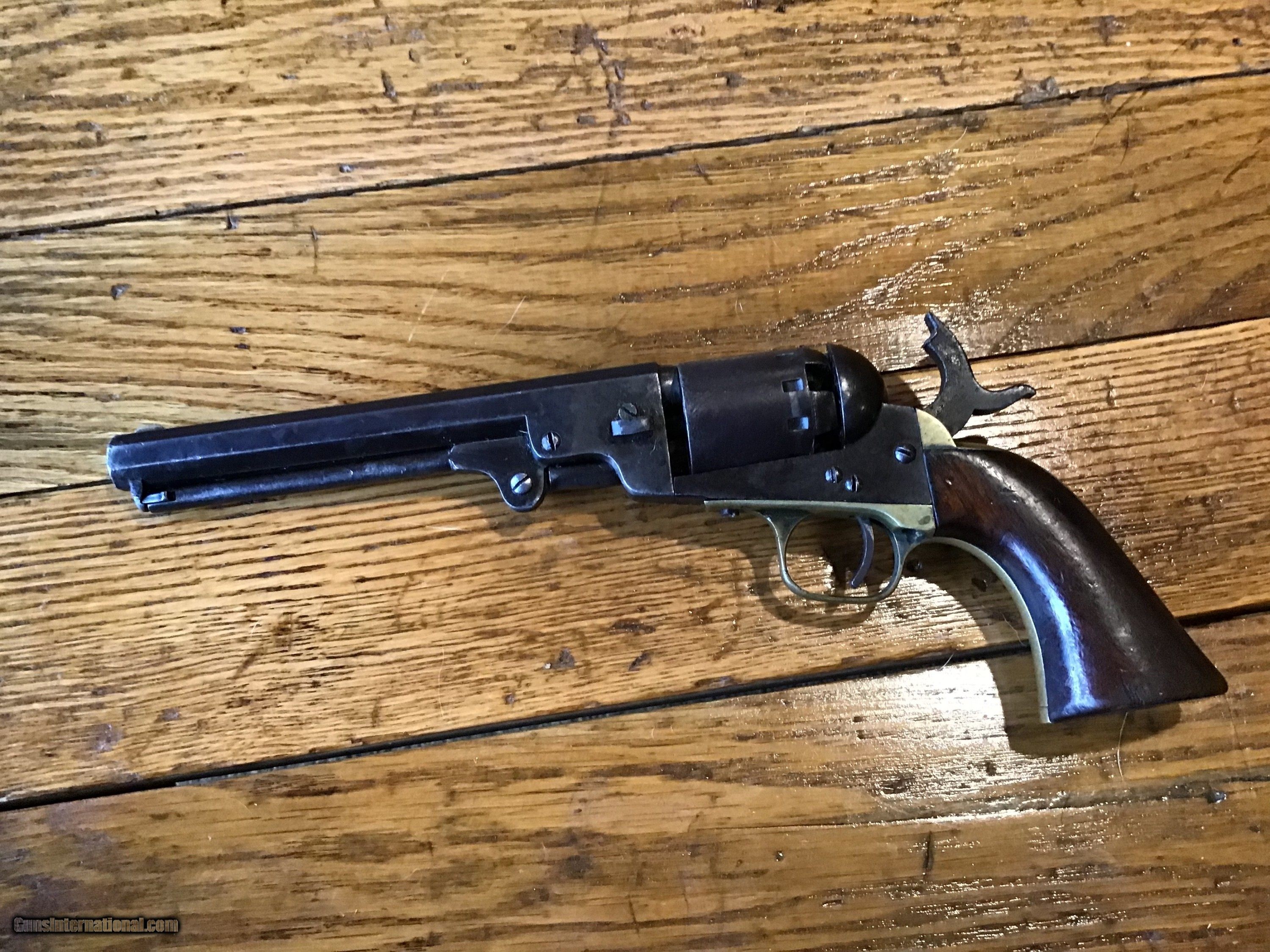 Description: Original Antique Civil war model 1851 Navy 36 caliber percussion revolver serial number 23077 made approximately 1862. Good grips much of the scene is still visible with a brown patina. Although the action works and the hammer holds the nipples need to be replaced. Please feel free to contact me with any questions. Usps insured shipping with tracking will be actual cost approximately 20-25 dollars. Antique: Yes Price: $595.00 Contact Seller |
