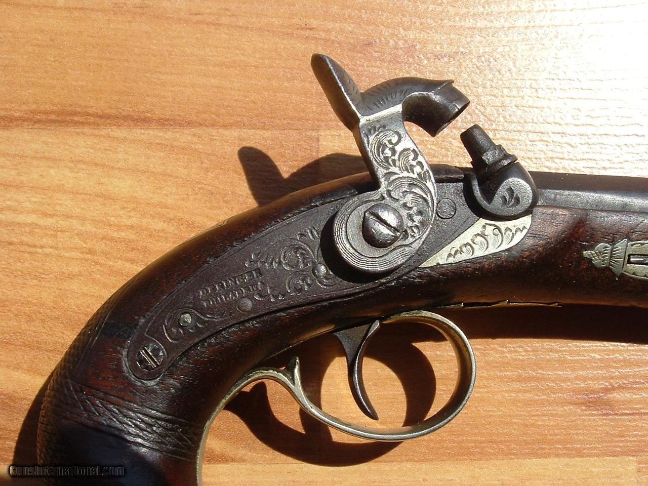 Description: Original Henry Deringer "Lincoln-size" pocket pistol. In very fine+ condition overall, .41 caliber, with a 2.5" barrel, 5.5" total length. Engraved German silver mountings overall. Iron components engraved as well. Sharp and clear correct lockplate & barrel markings, sunburst "P" at left side of breech. Mechanics are correct, just somewhat weak. Bore is excellent. Wood stock is very fine+, with the slightest handling wear to checkering. Hard to find one of these with a good stock. A classic antique firearm. SOLD Antique: Yes |