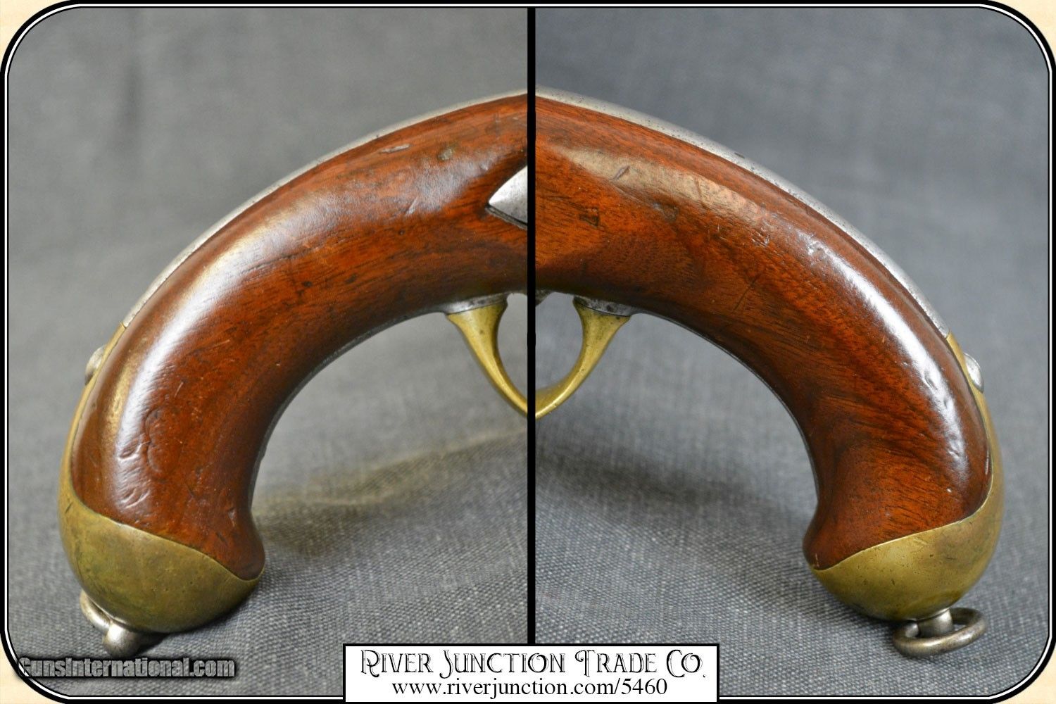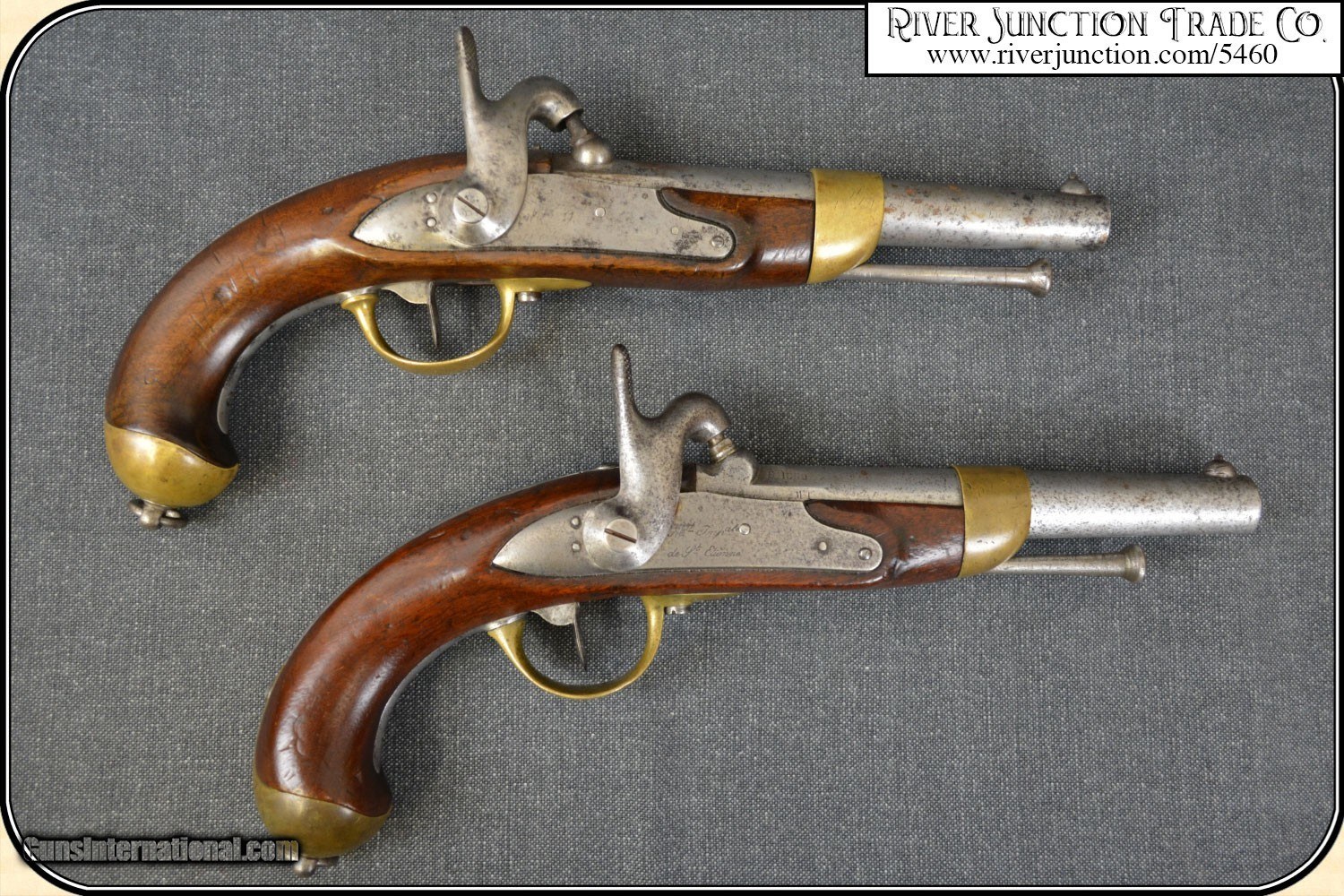 Description: An Antique French Military Model 1822 Percussion Service Pistol made at the St. Etienne Arsenal, circa. dated "1821" and "1859". 7 13/16" .69 cal. octagon-to-round iron barrel struck w/multiple Arsenal and inspector's marks, tang engraved; ' Mle 1822 bis '. Lock marked; ' Mre Imp ale de St Etienne', and, an inspector's stamp above. Regulation brass and iron furniture stamped w/multiple arsenal and inspector's marks. Stock does not show any breaks or cracks. Many dings and scratches from years of handling, left side stamped; w/multiple arsenal and inspector's marks, and the round arsenal cartouche. All steel parts have areas of salt and pepper pitting. Original ram rod. In good mechanical working order. Note: These pistols were imported by the North and South in the first 2 years of the Civil War. This is an ANTIQUE and can be shipped directly to you in the USA. We do ship antique arms INTERNATIONALLY. Adult signature required, know your customs requirements. Sold as an Antique ~ no guarantees, warranties, or liabilities for any actual usage. If any firearms are to be used for shooting purposes, a qualified gunsmith should inspect them first. Adult signature required upon delivery. We always answer questions and entertain offers. Payment: Item, can be ordered with a credit card or paypal on our sight . Just Google (riverjunction) and type in the River Junction Trade Co. item number (5460) in the search box. Before you checkout you will see shipping cost and total. OR If you prefer: Pay by cash, postal money order, cashiers check, personal & business checks. We wait for checks to clear. Call me 563-880-4588. Jim SOLD |