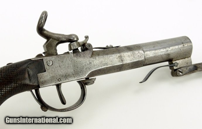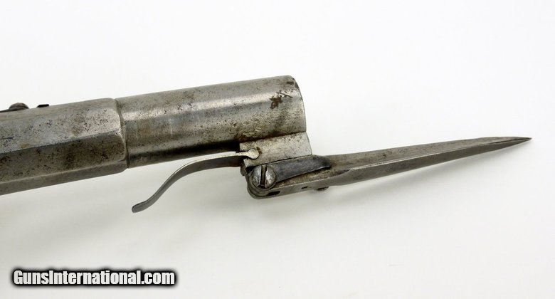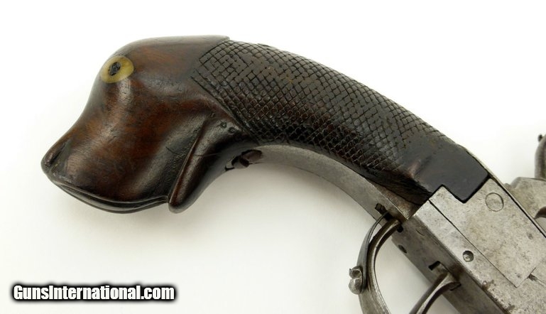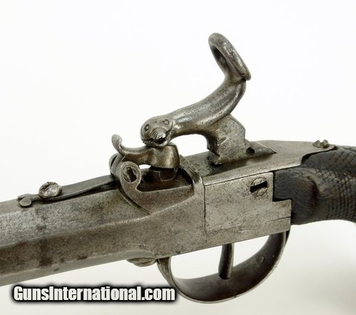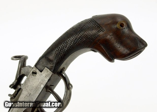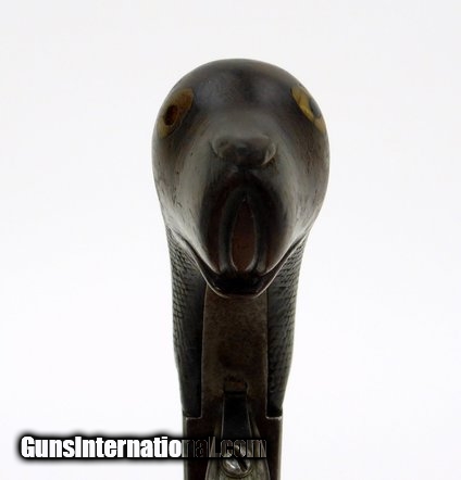 Description: Pair of German? Percussion spring bayonet pistols. Most unusual design with dog head grip, spring bayonets, and nipple protectors. Hammers are in the form of a snake or serpent head to strike the nipple and the curling tail as cocking spur. One pistol has a chip out of the right side grip at the frame. Between the dog head grips, the nipple protectors, the serpent style hammers and the bayonets, these are truly unusual! SOLD |