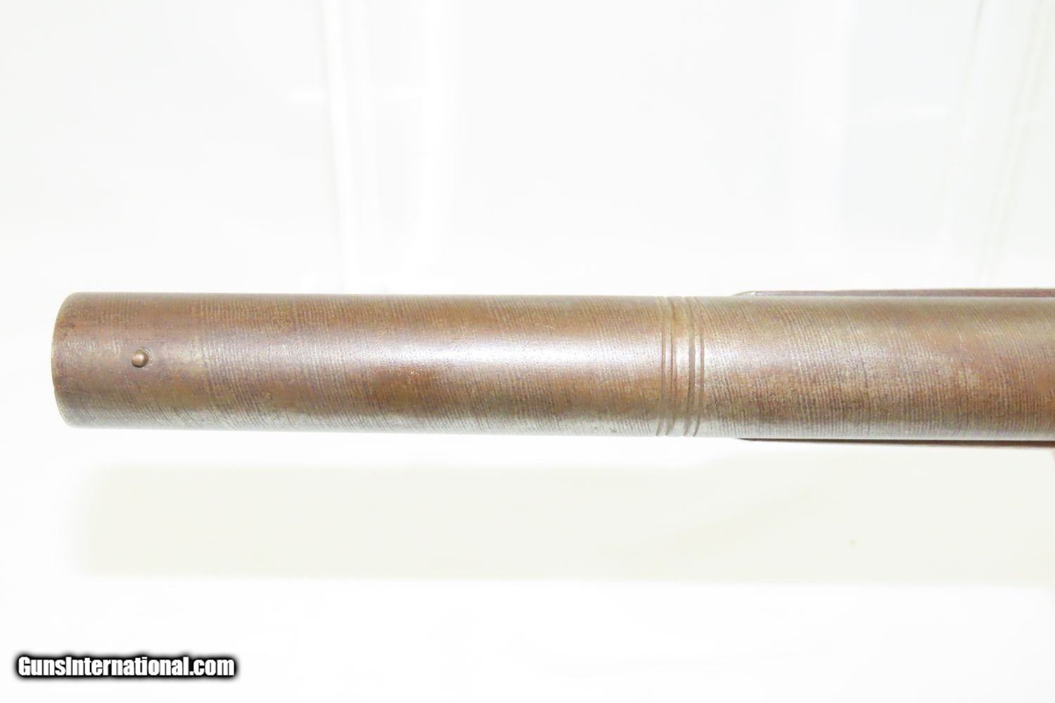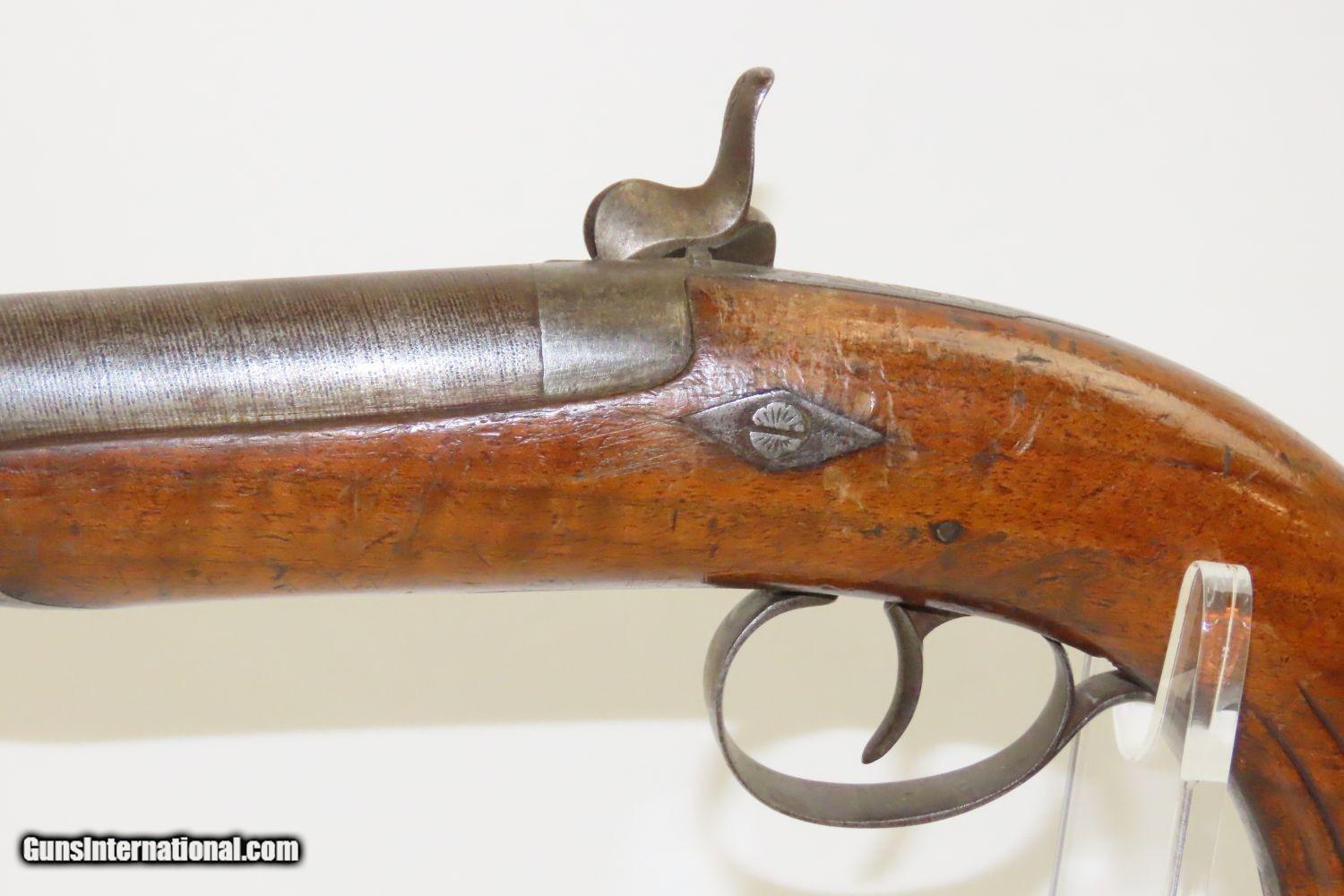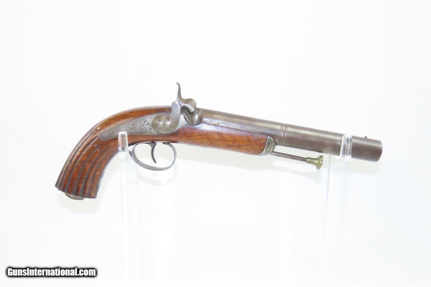 Description: Pair of ORNATE & ENGRAVED Antique 1850s Back Action PERCUSSION Belt Pistols With Ottoman Kubar Style Double Holster! Here we present a pair of Ornate European Antique Back Action Percussion Pistols, manufactured in the mid-19th Century. These are full-sized combat pistols in a man-stopping .67 caliber. Round barrels with a swirling Damascene pattern. The iron trigger guards are handsomely engraved, while the locks and hammers are engraved with a scroll motif. The wooden stocks are fluted at the grip, which is both practical and aesthetically pleasing. The ramrods are made of steel. The overall condition is very good. The actions are strong all around. One hammer is cracked on the underside of the hammer head. The bores are smooth and gray. Both stocks are solid. The locks are lightly engraved with traditional designs. The embroidered holster is sturdy and in good shape. Here are two back action pistols creating a fantastic set to display! Own the original! This is a legitimate antique and not a reproduction. Barrels are 7-1/2 inches. Caliber: .67 Overall condition as seen in photos. Very Fast. Very Safe. FREE SHIPPING WORLDWIDE. Delivered directly to your door by express mail! Guaranteed AUTHENTIC & Includes CERTIFICATE OF AUTHENTICITY. ancestryguns $1750 #20722 SOLD Antique: Yes |