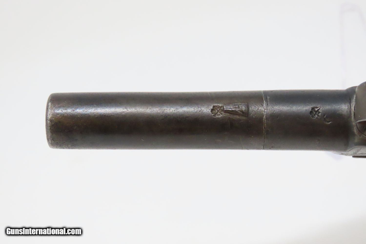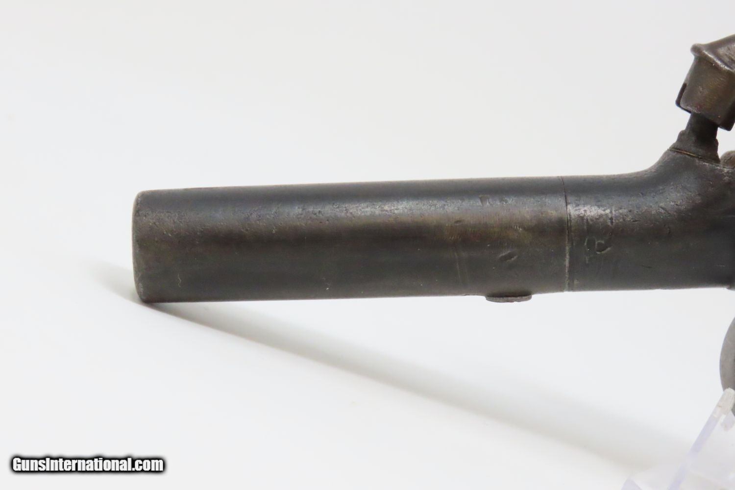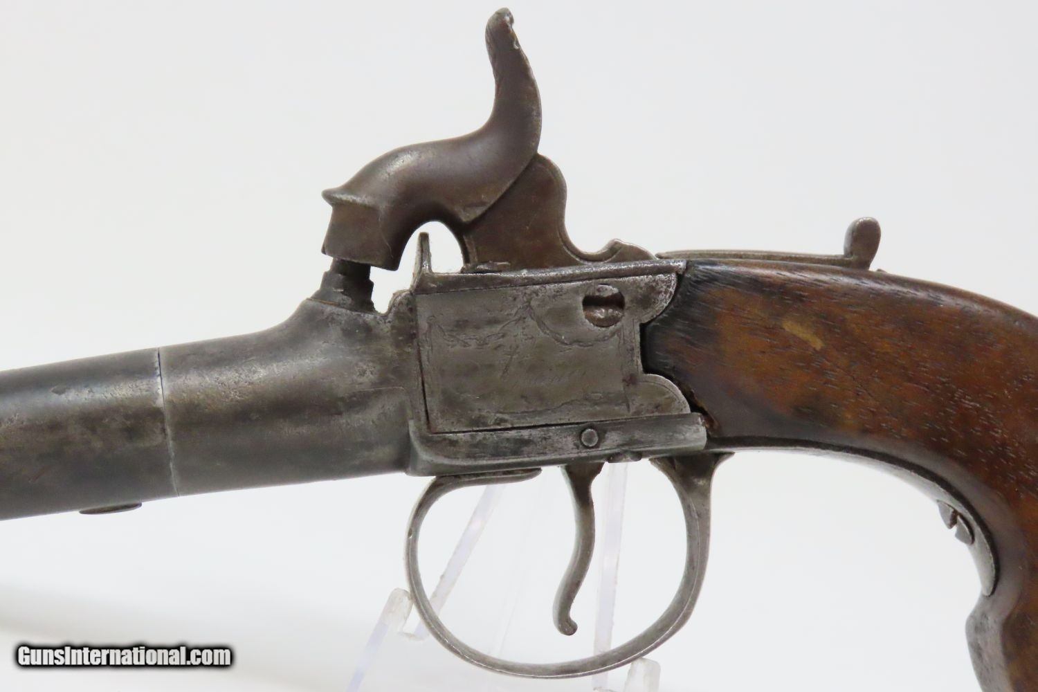 Description: PAIR of SPENCER Antique BOXLOCK Single Shot .41 Caliber PERCUSSION Pistols London Made Mid-1800s Self Defense Pocket / Muff Pistols! Here we present a pair of antique Spencer of London Boxlock Percussion Self Defense Pistols, made circa 1850 in London, England. These little self-defense pistols would have been most at home in the pocket of anyone in the busy cities of London during the mid-1800s. These pistols are small, light and simple. The “Pocket Pistol” name says it all. They were the "Saturday Night Specials" of the 16th-18th century. Before the Deringer, they were "Gentleman's" or "Muff Pistols", typically, a smaller pistol that was easily concealed. They were favored among the gentry and women because of these traits. Men would carry them concealed in a waistcoat pocket and women would hide them in a hand muff. The overall condition is good. The action functions properly on both pistols. The bores are good. The grips are in good shape but are seated loosely against the frame. Both pistols are marked "Spencer" and "London" on the locks, with the initial, "IT", on the thumb plates. There are British proofs on the bottoms of the barrels. These come with a hardwood case that holds both pistols, some caps, and a few lead balls. Here is a fantastic cased pair of boxlock pistol to collect and display! Own the original! This is a legitimate antique and not a reproduction. Barrels are 3 inches. Caliber: .41 Overall condition as seen in photos. Very Fast. Very Safe. FREE SHIPPING WORLDWIDE. Delivered directly to your door by express mail! Guaranteed AUTHENTIC & Includes CERTIFICATE OF AUTHENTICITY. ancestryguns $1495 #20706 SOLD Antique: Yes |
