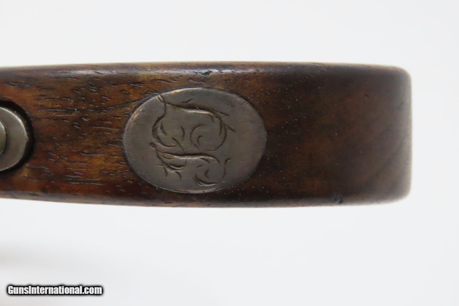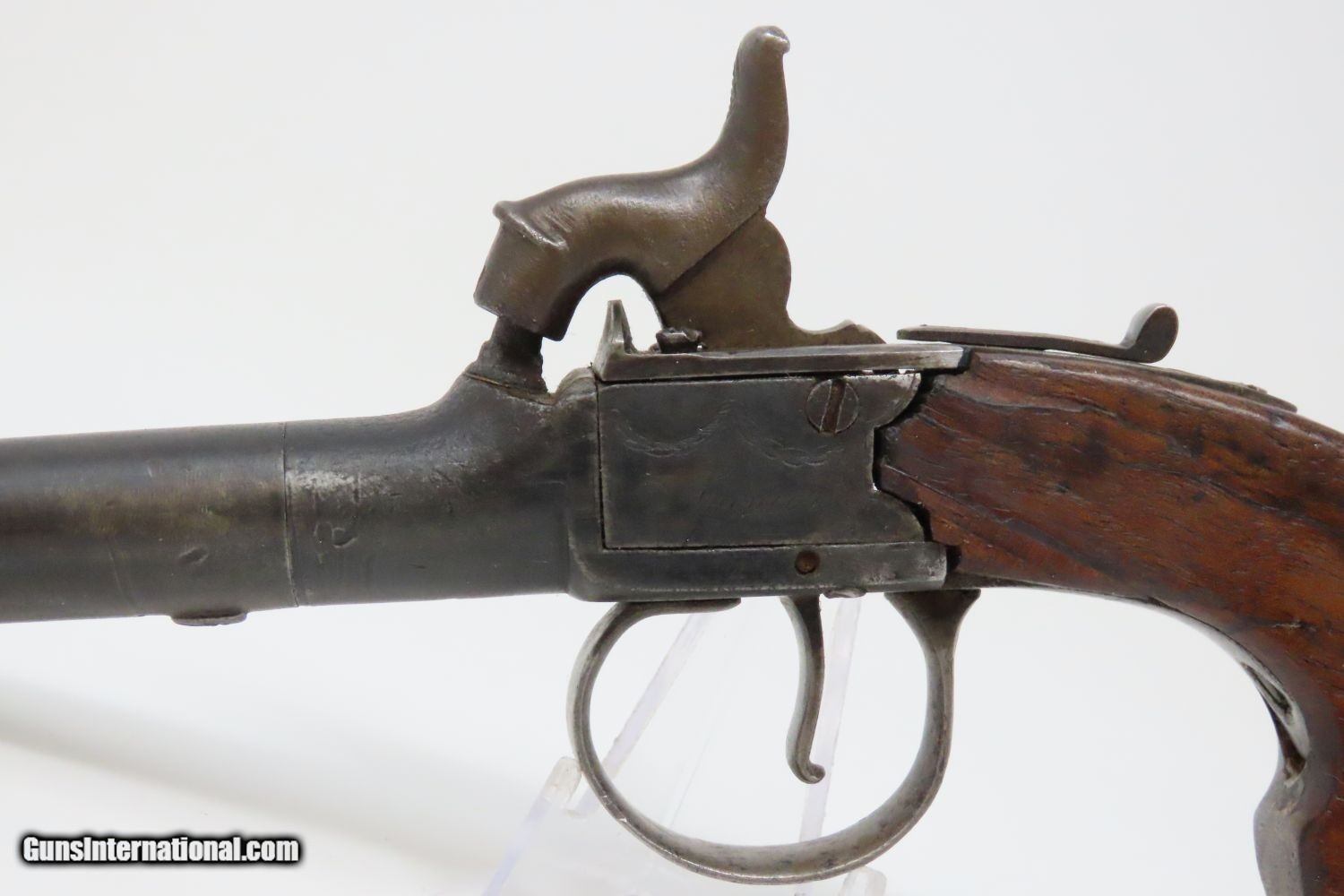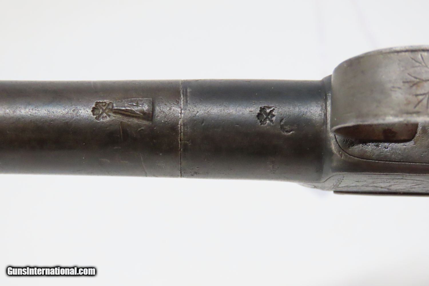 Description: PAIR of SPENCER Antique BOXLOCK Single Shot .41 Caliber PERCUSSION Pistols London Made Mid-1800s Self Defense Pocket / Muff Pistols! Here we present a pair of antique Spencer of London Boxlock Percussion Self Defense Pistols, made circa 1850 in London, England. These little self-defense pistols would have been most at home in the pocket of anyone in the busy cities of London during the mid-1800s. These pistols are small, light and simple. The “Pocket Pistol” name says it all. They were the "Saturday Night Specials" of the 16th-18th century. Before the Deringer, they were "Gentleman's" or "Muff Pistols", typically, a smaller pistol that was easily concealed. They were favored among the gentry and women because of these traits. Men would carry them concealed in a waistcoat pocket and women would hide them in a hand muff. The overall condition is good. The action functions properly on both pistols. The bores are good. The grips are in good shape but are seated loosely against the frame. Both pistols are marked "Spencer" and "London" on the locks, with the initial, "IT", on the thumb plates. There are British proofs on the bottoms of the barrels. These come with a hardwood case that holds both pistols, some caps, and a few lead balls. Here is a fantastic cased pair of boxlock pistol to collect and display! Own the original! This is a legitimate antique and not a reproduction. Barrels are 3 inches. Caliber: .41 Overall condition as seen in photos. Very Fast. Very Safe. FREE SHIPPING WORLDWIDE. Delivered directly to your door by express mail! Guaranteed AUTHENTIC & Includes CERTIFICATE OF AUTHENTICITY. ancestryguns $1495 #20706 SOLD Antique: Yes |