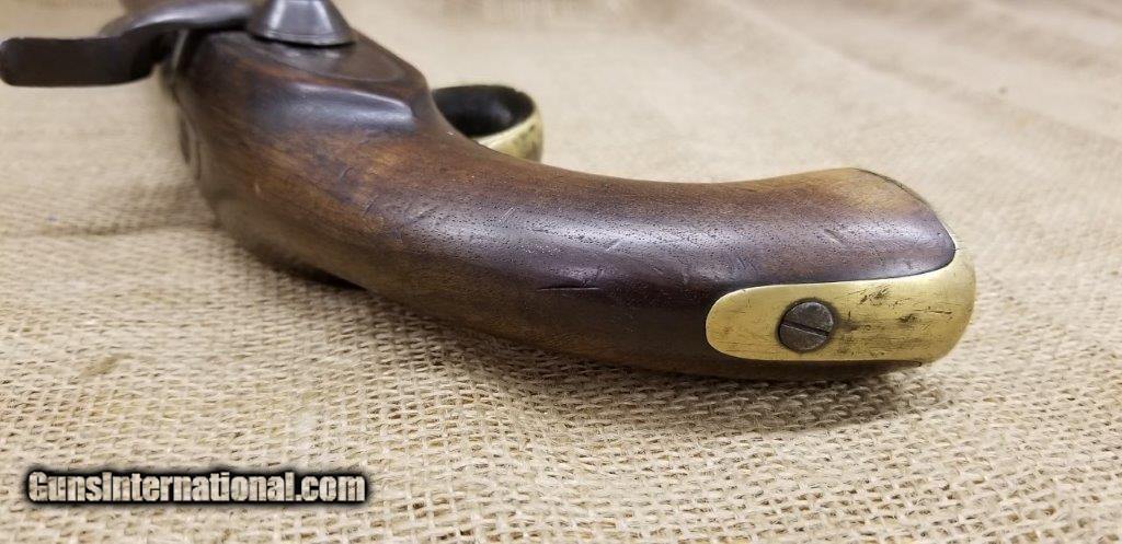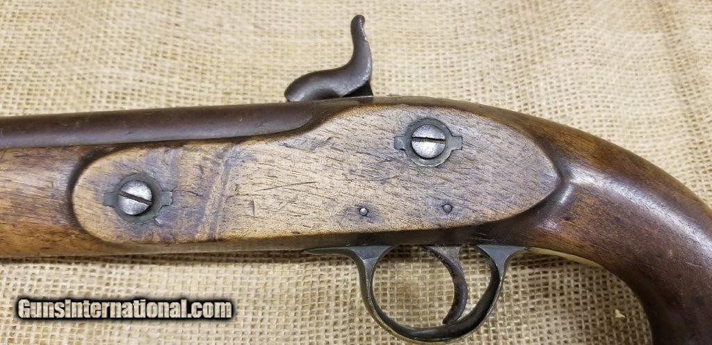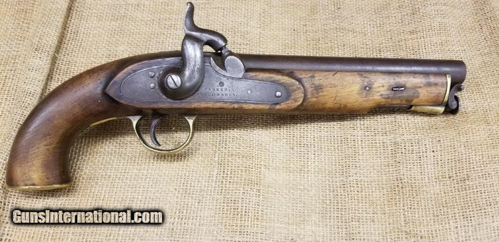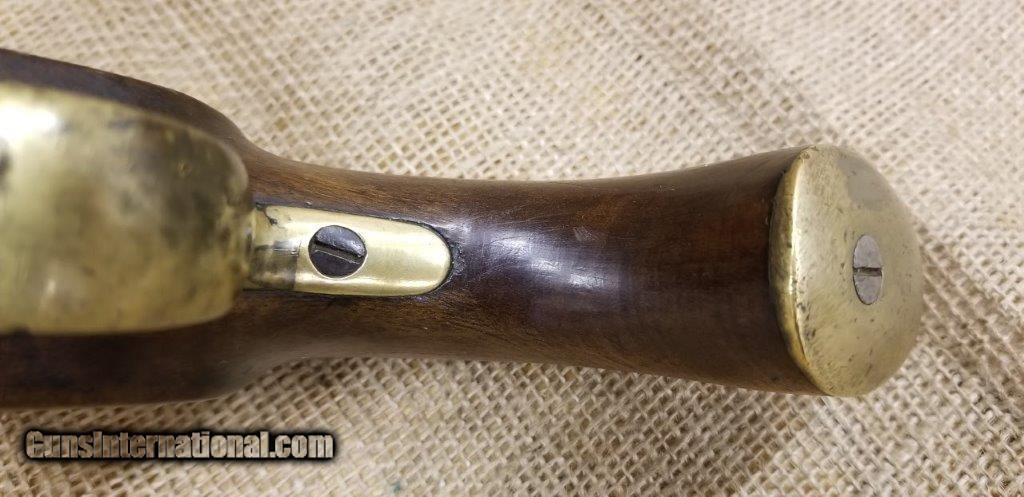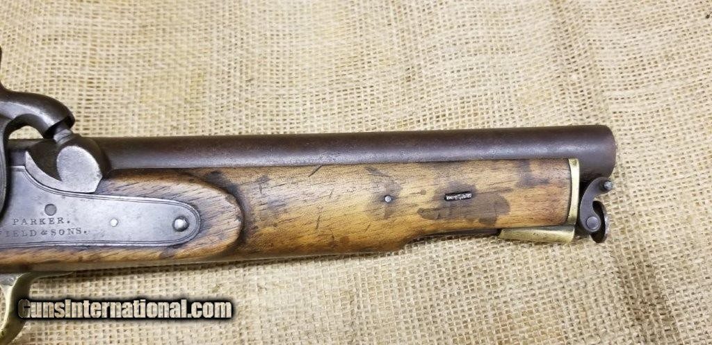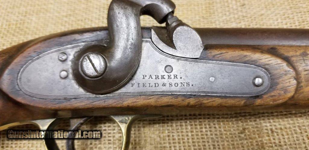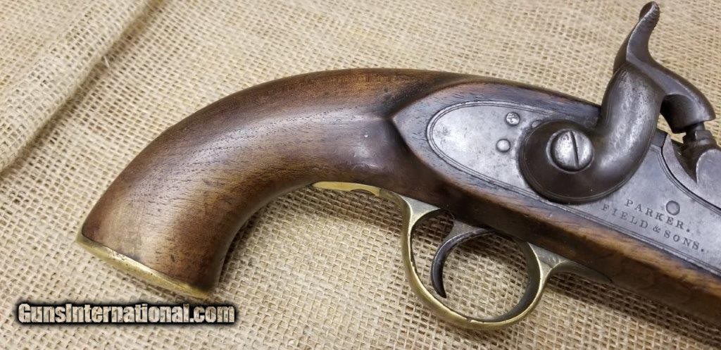 Description: Parker Field & Sons Percussion Pistol Holborn London .74 caliber? Flat outlined iron lockplate with maker's name present in front of the outlined hammer, Holborn London on top of round 9 inch barrel. Brass trigger guard, ramrod guide and butt cap. Swivel ramrod with button ends. Heavy walnut stock, crack at muzzle on left side stretching back to barrel pin. Barrel has London Proof House marking of crown over intertwined CP. Two stage action works nice and clean. Overall length is 15 1/2 inches weights 3 pounds 3 ounces Parker, Field & Sons operated from 1842 - 1877 at 233 High Holborn London SOLD Antique: Yes |